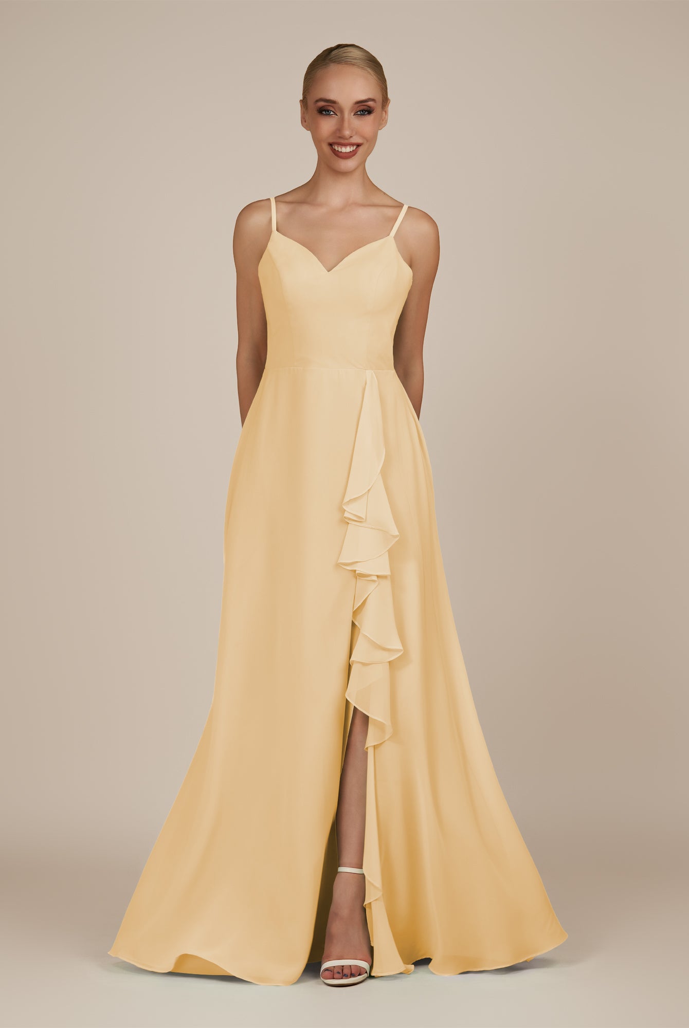 Rhonda | Tahiti - Sheath Chiffon V Neck Ruffled Long Bridesmaid Dress with Slit