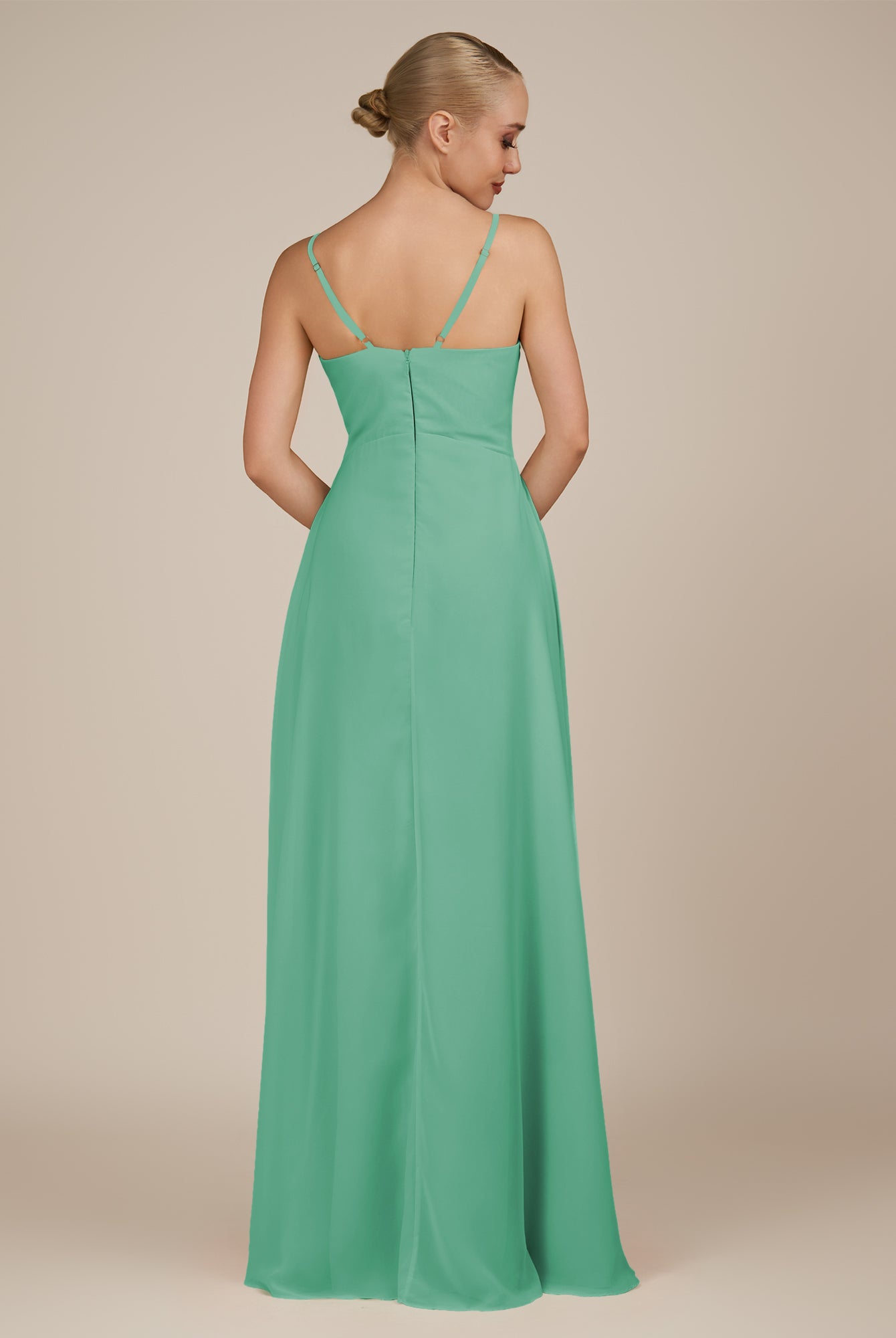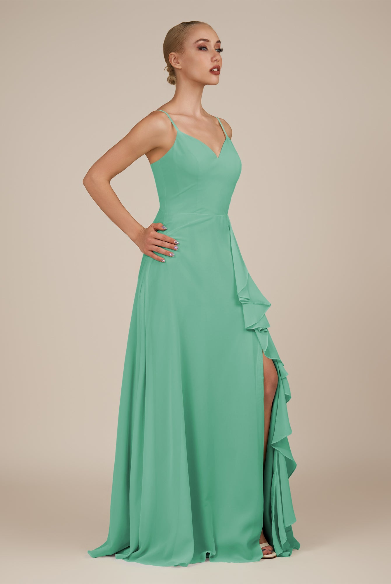Rhonda | Sea Glass - Sheath Chiffon V Neck Ruffled Long Bridesmaid Dress with Slit
