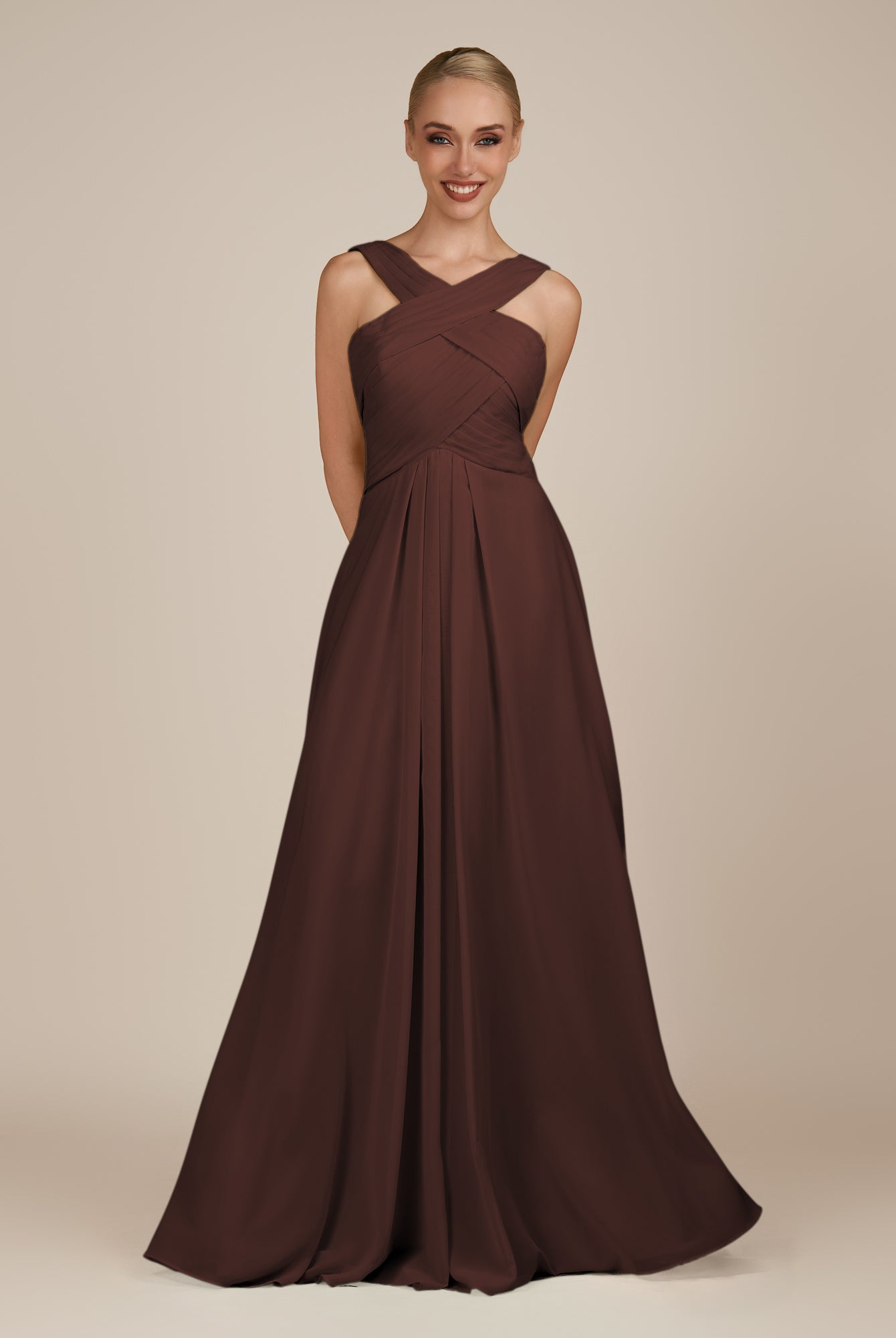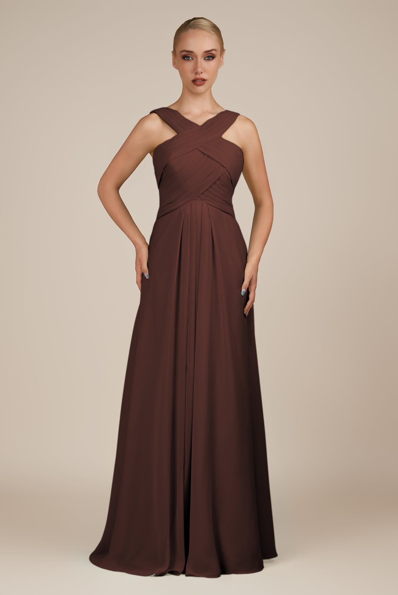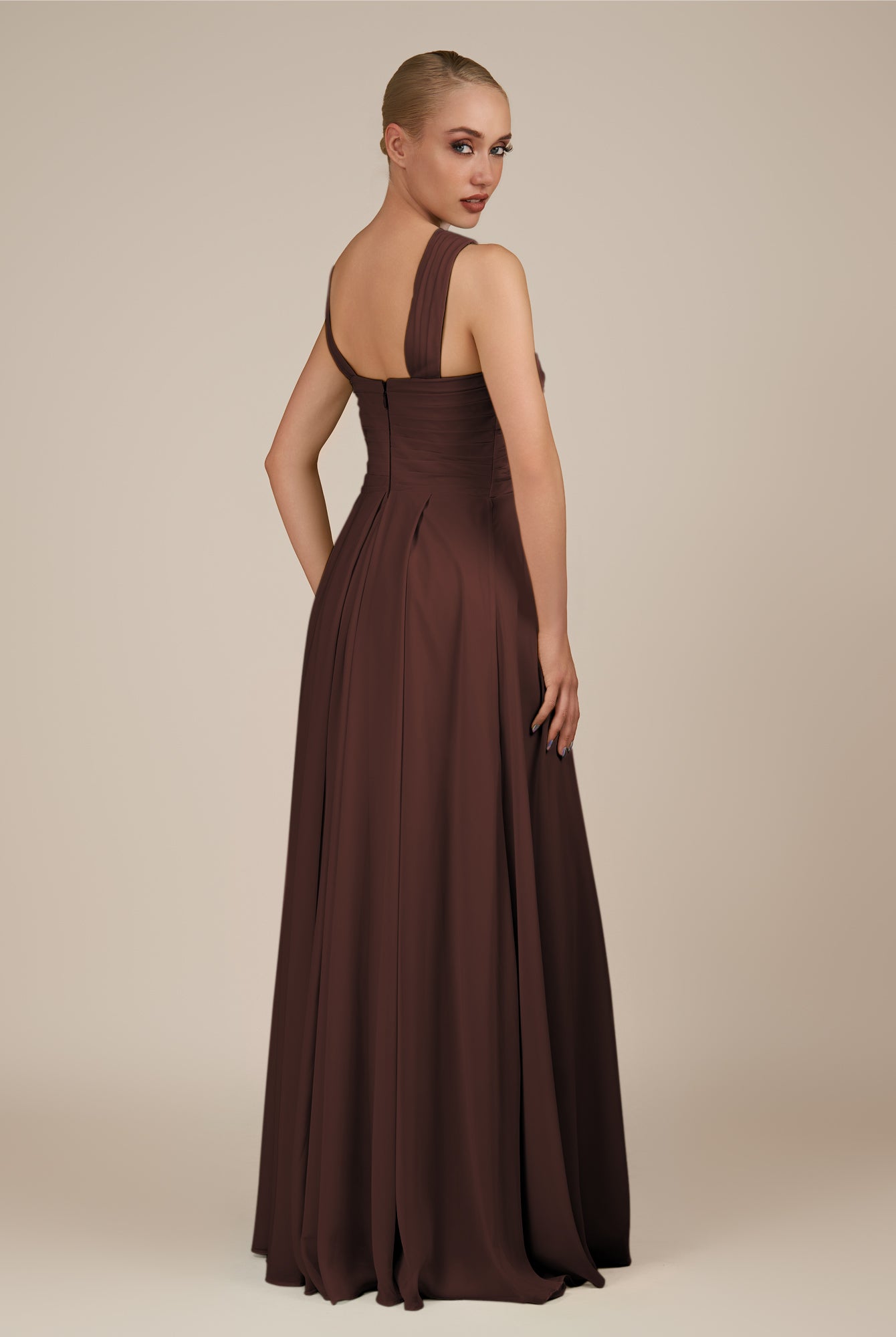 Sharlie | Espresso - A Line Chiffon Halter Neck Long Bridesmaid Dress with Pleats