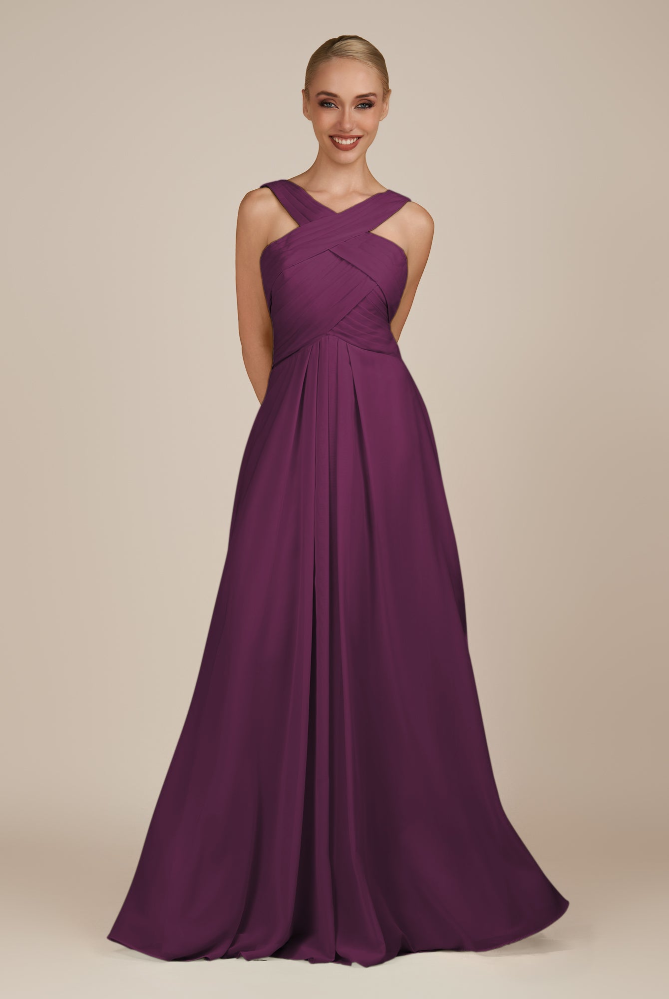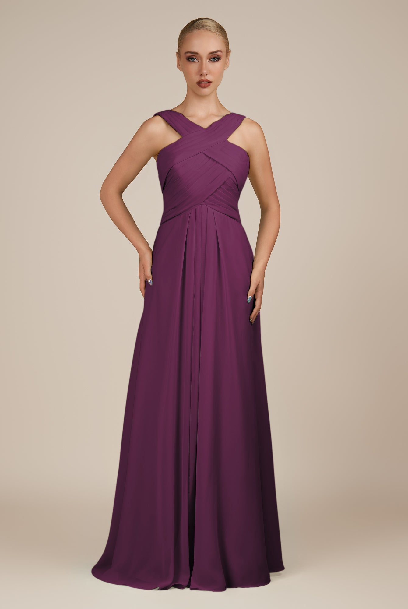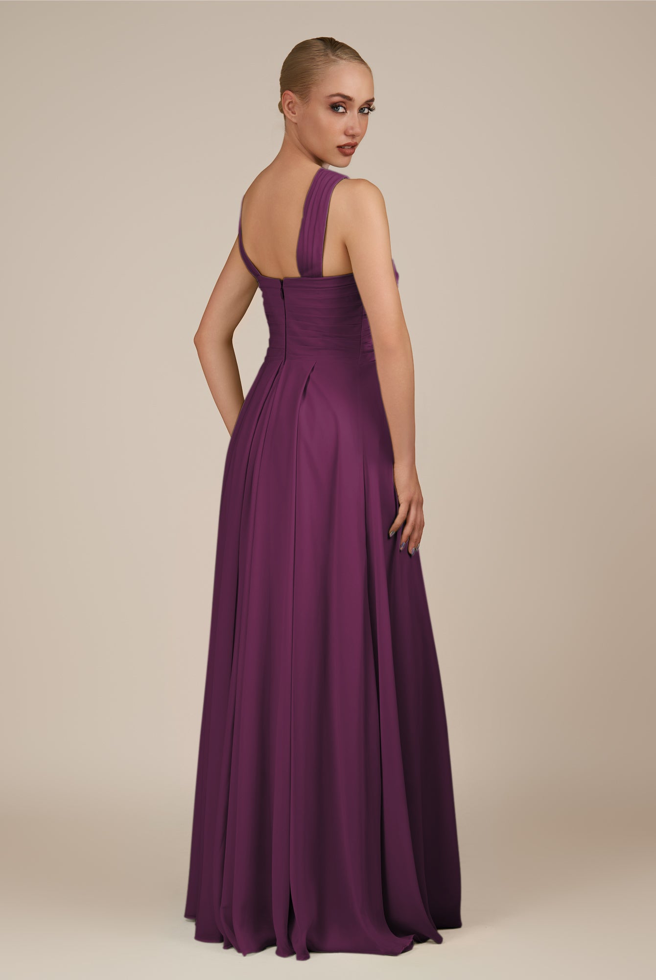 Sharlie | Mulberry - A Line Chiffon Halter Neck Long Bridesmaid Dress with Pleats