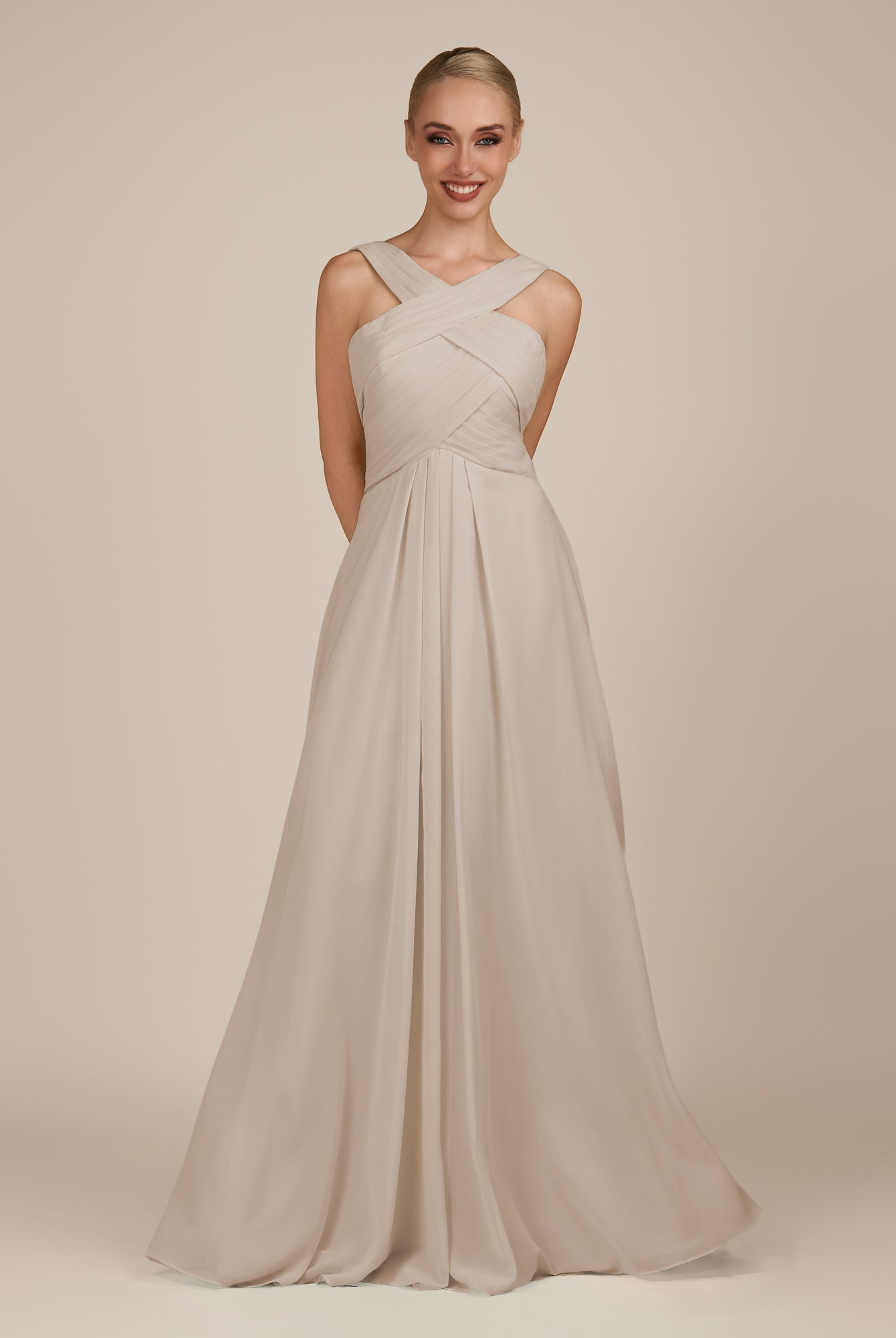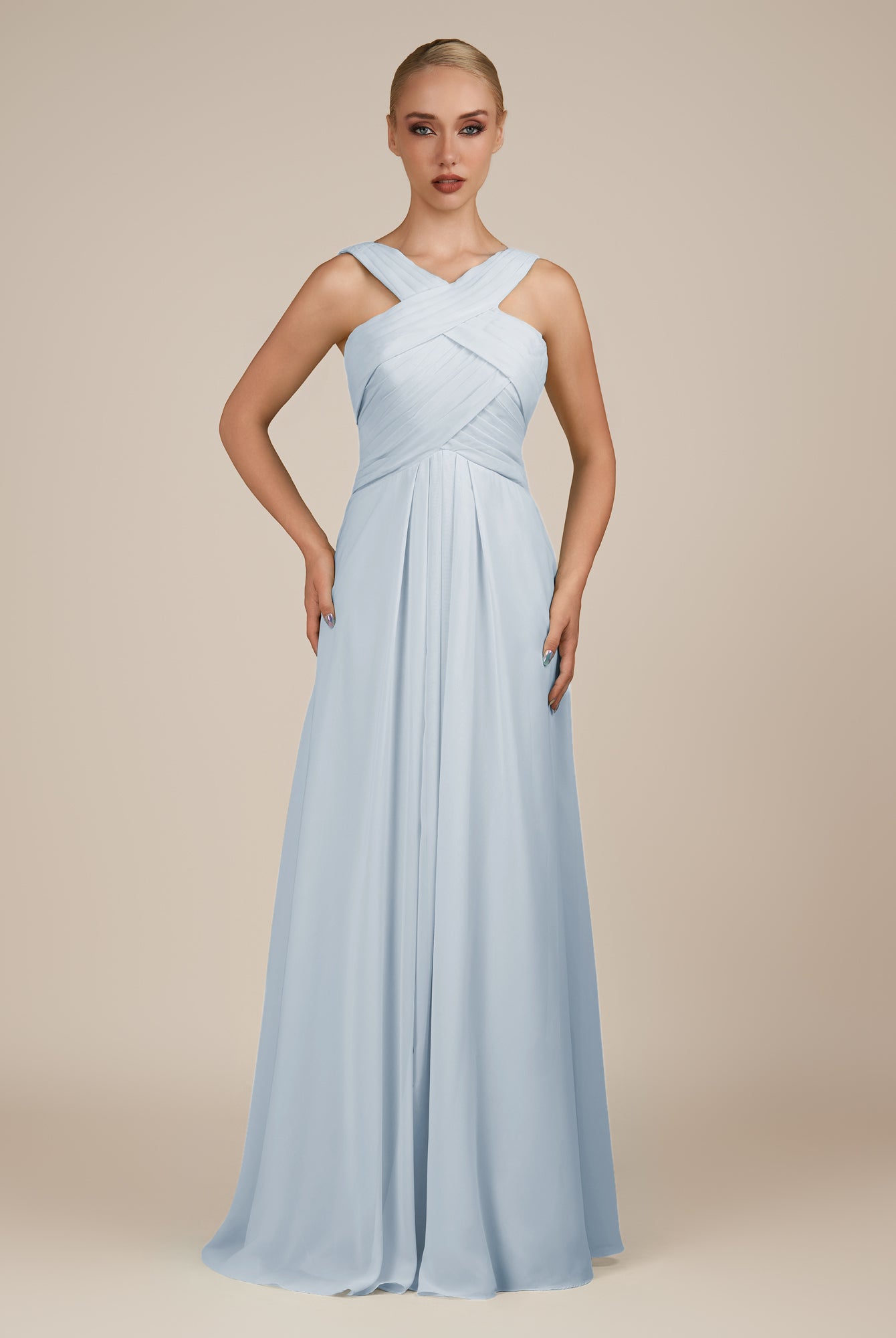 Sharlie | Frost - A Line Chiffon Halter Neck Long Bridesmaid Dress with Pleats