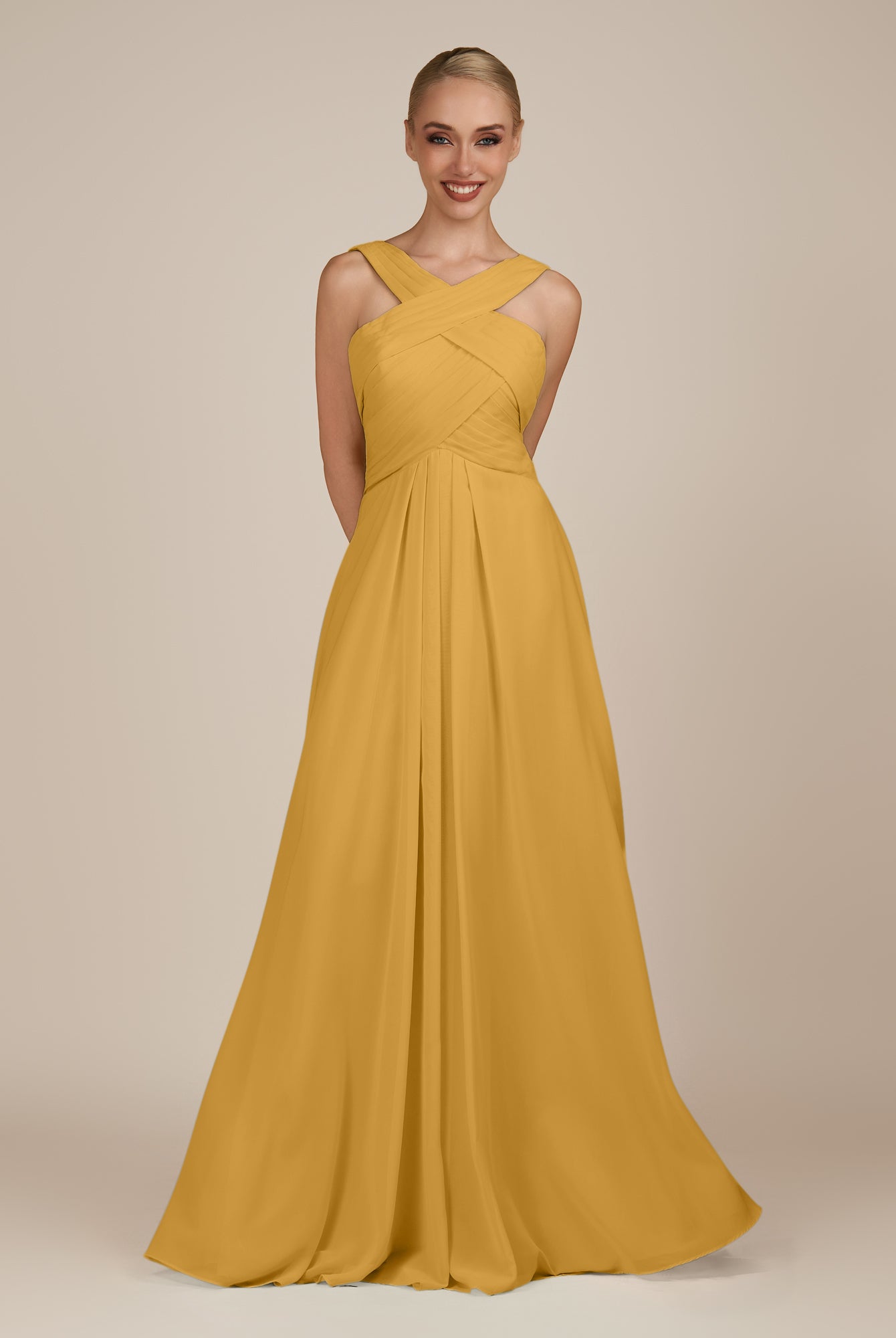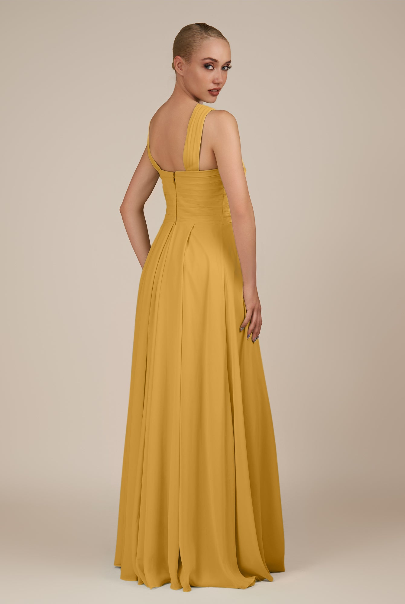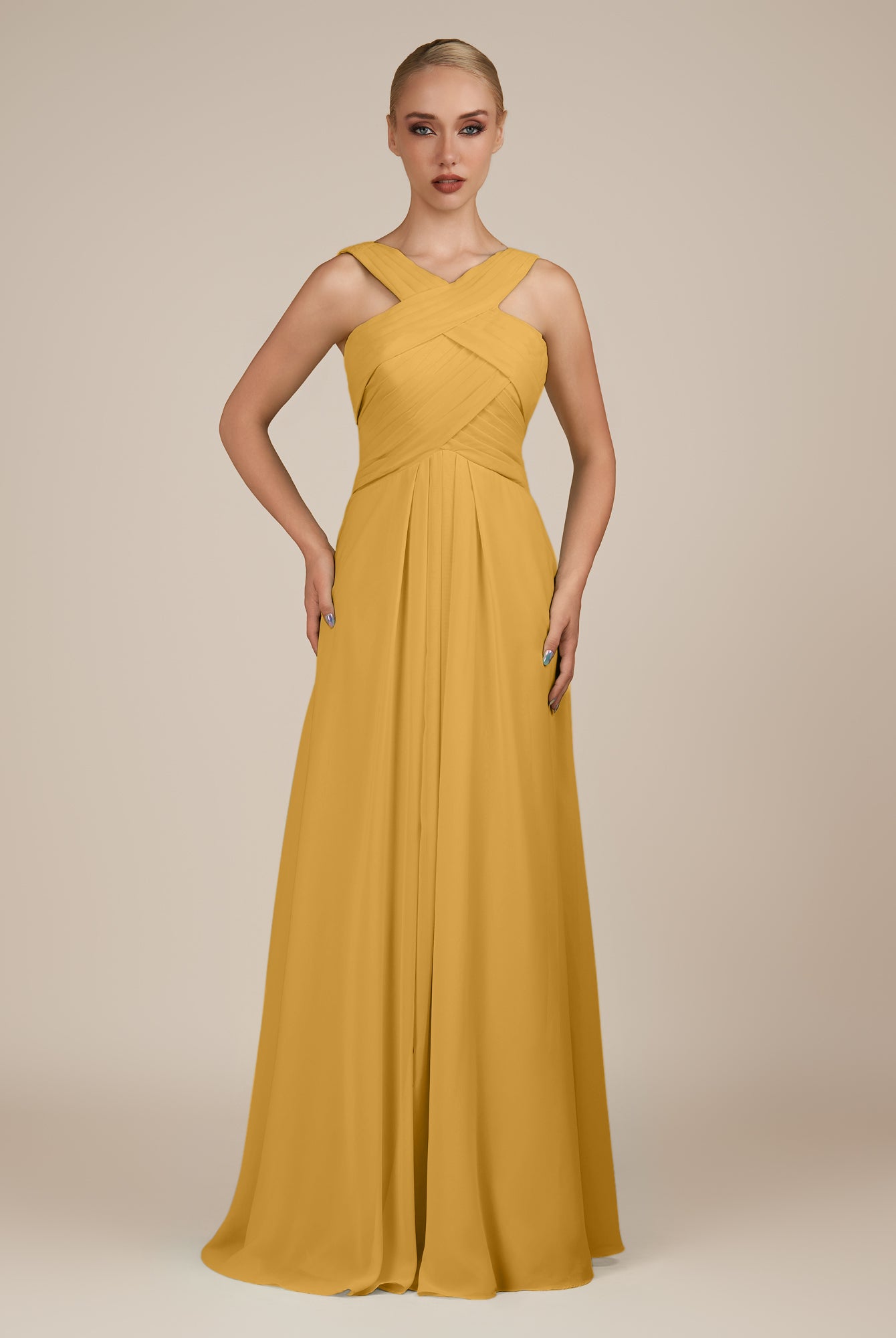 Sharlie | Marigold - A Line Chiffon Halter Neck Long Bridesmaid Dress with Pleats