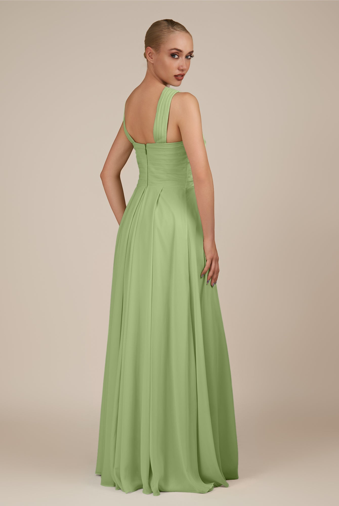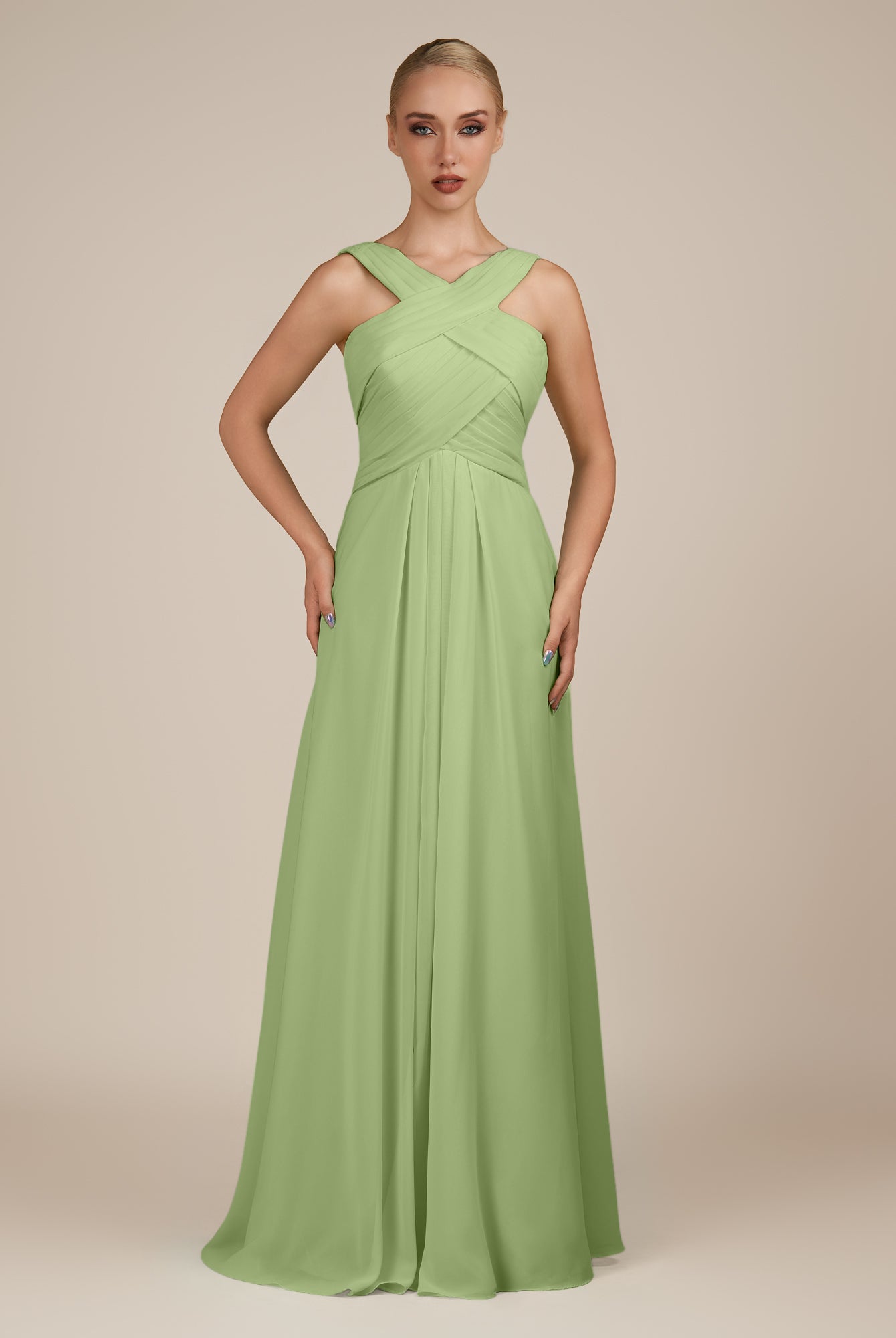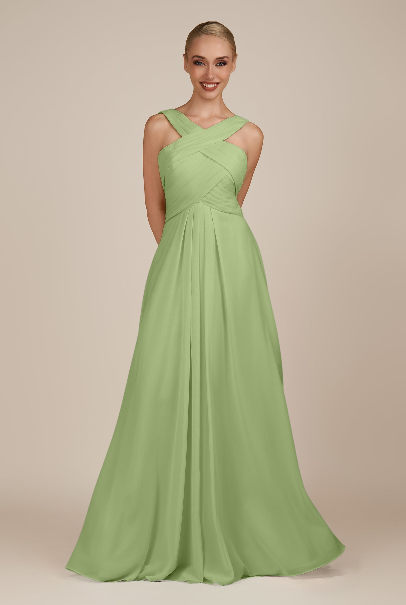 Sharlie | Matcha - A Line Chiffon Halter Neck Long Bridesmaid Dress with Pleats