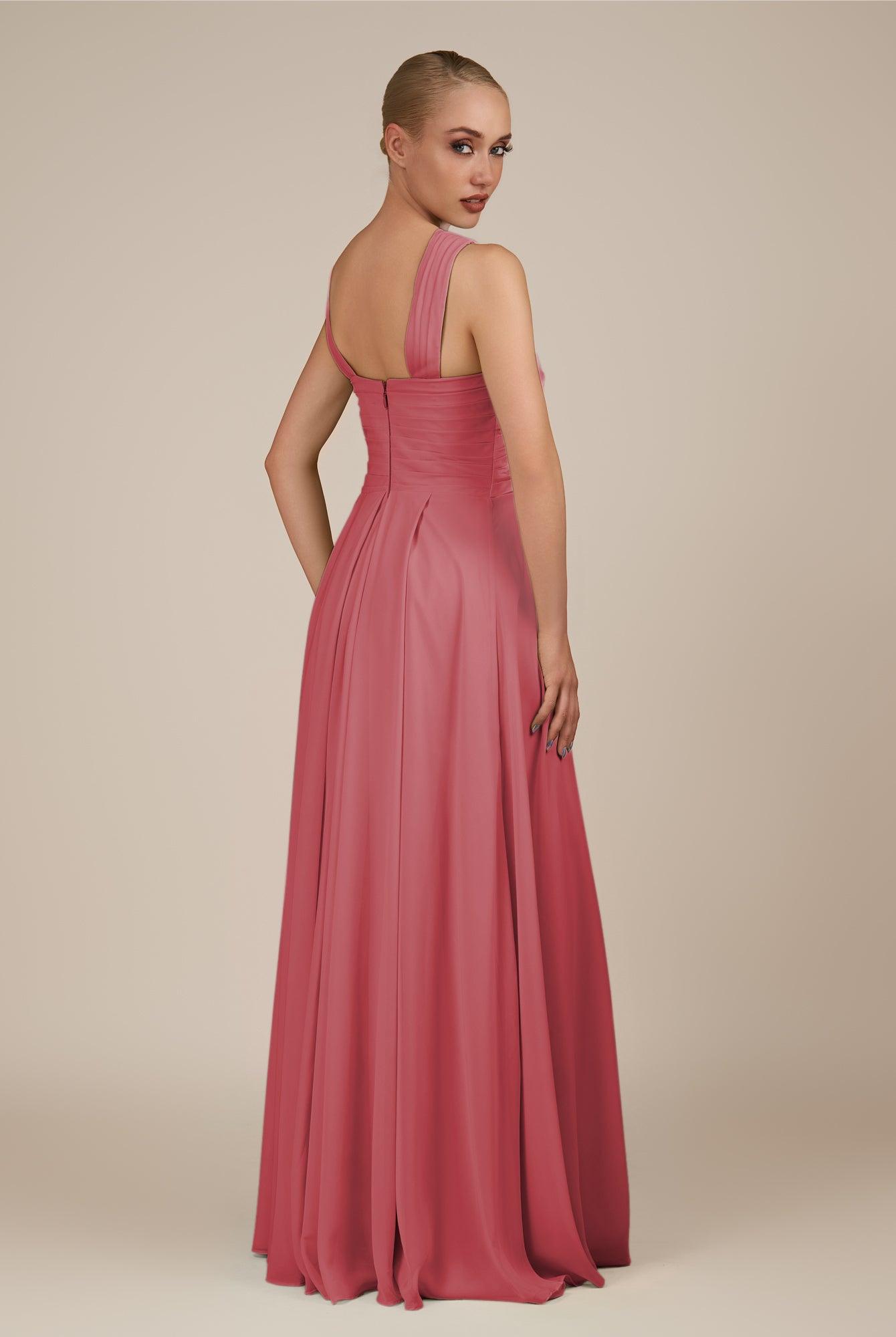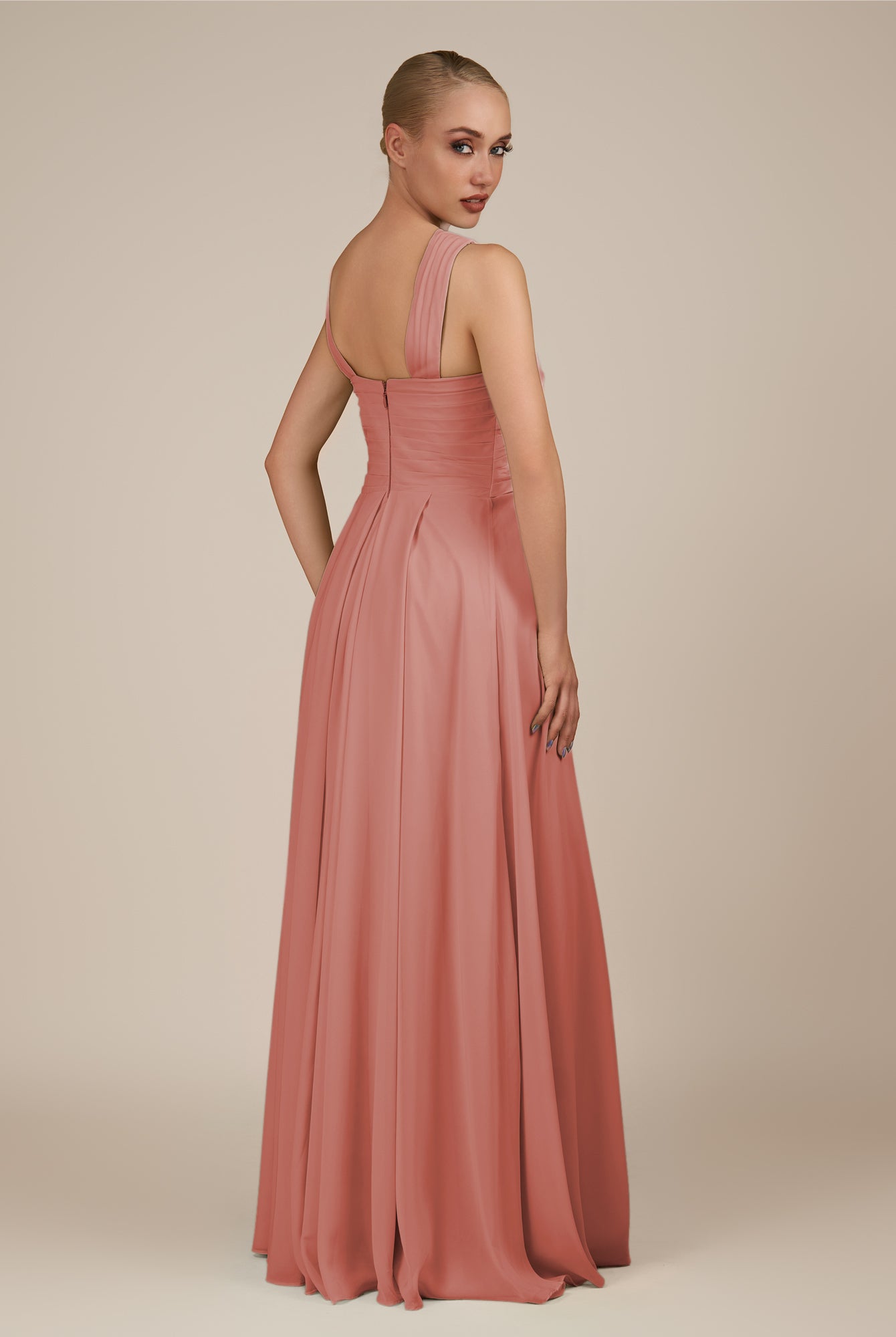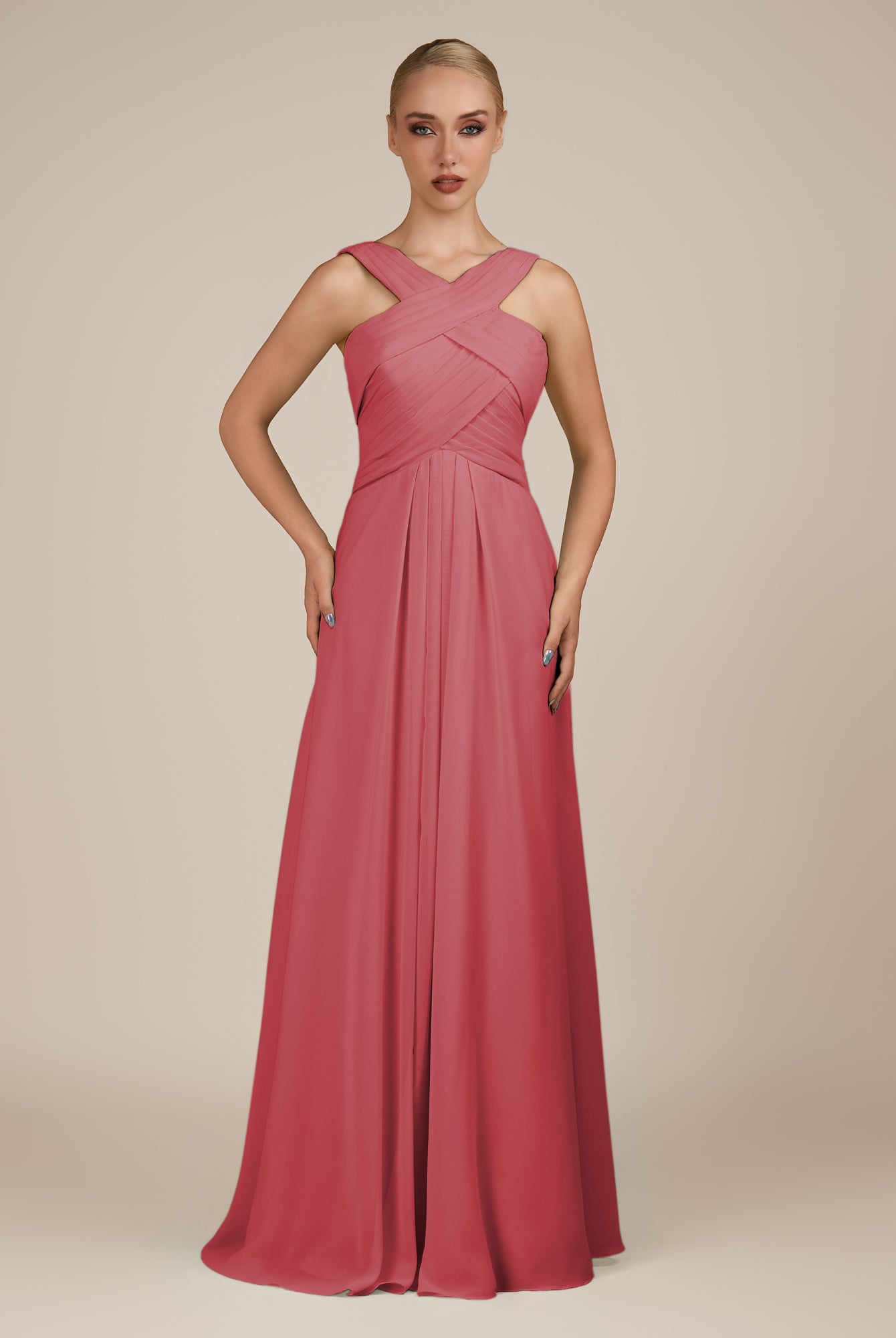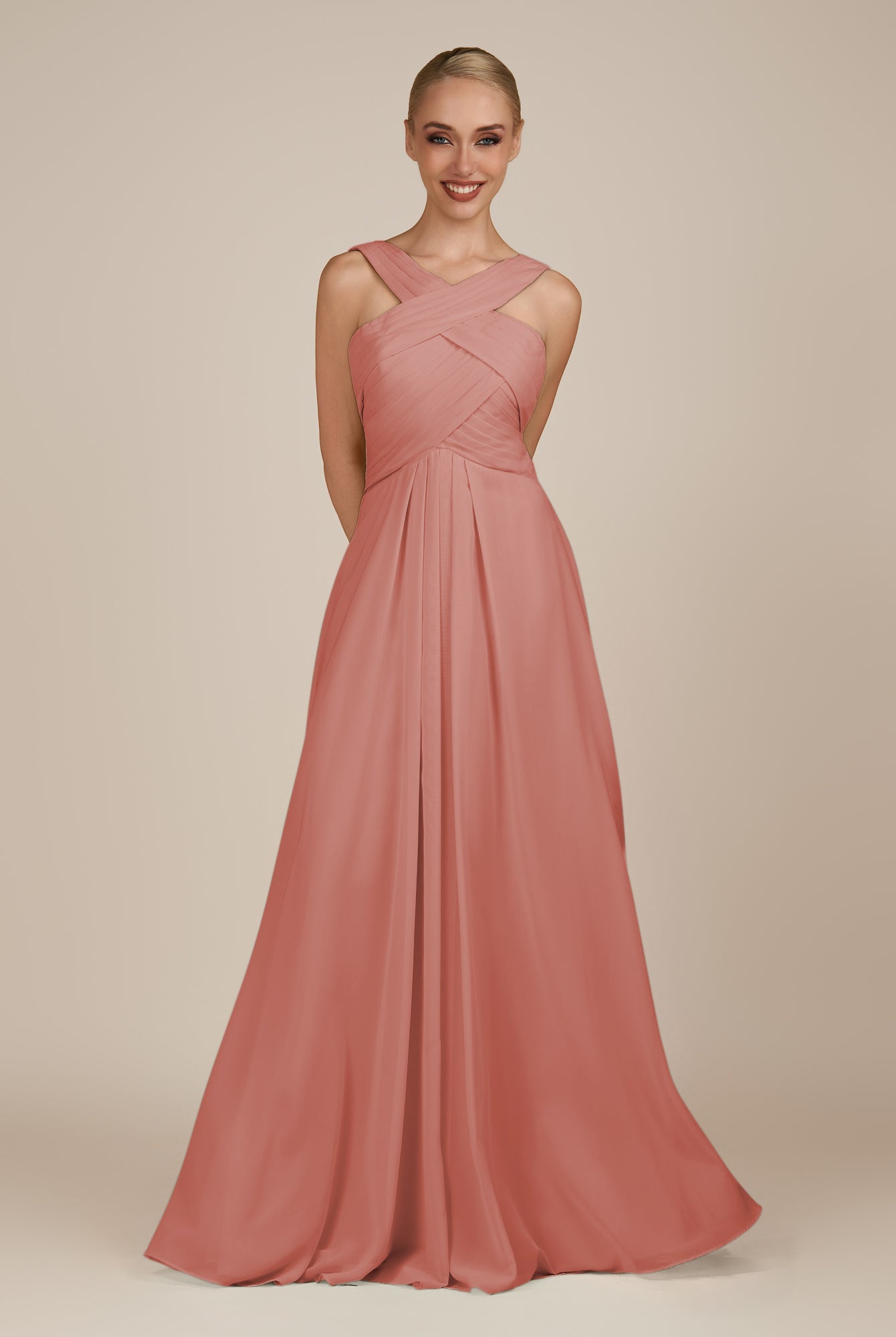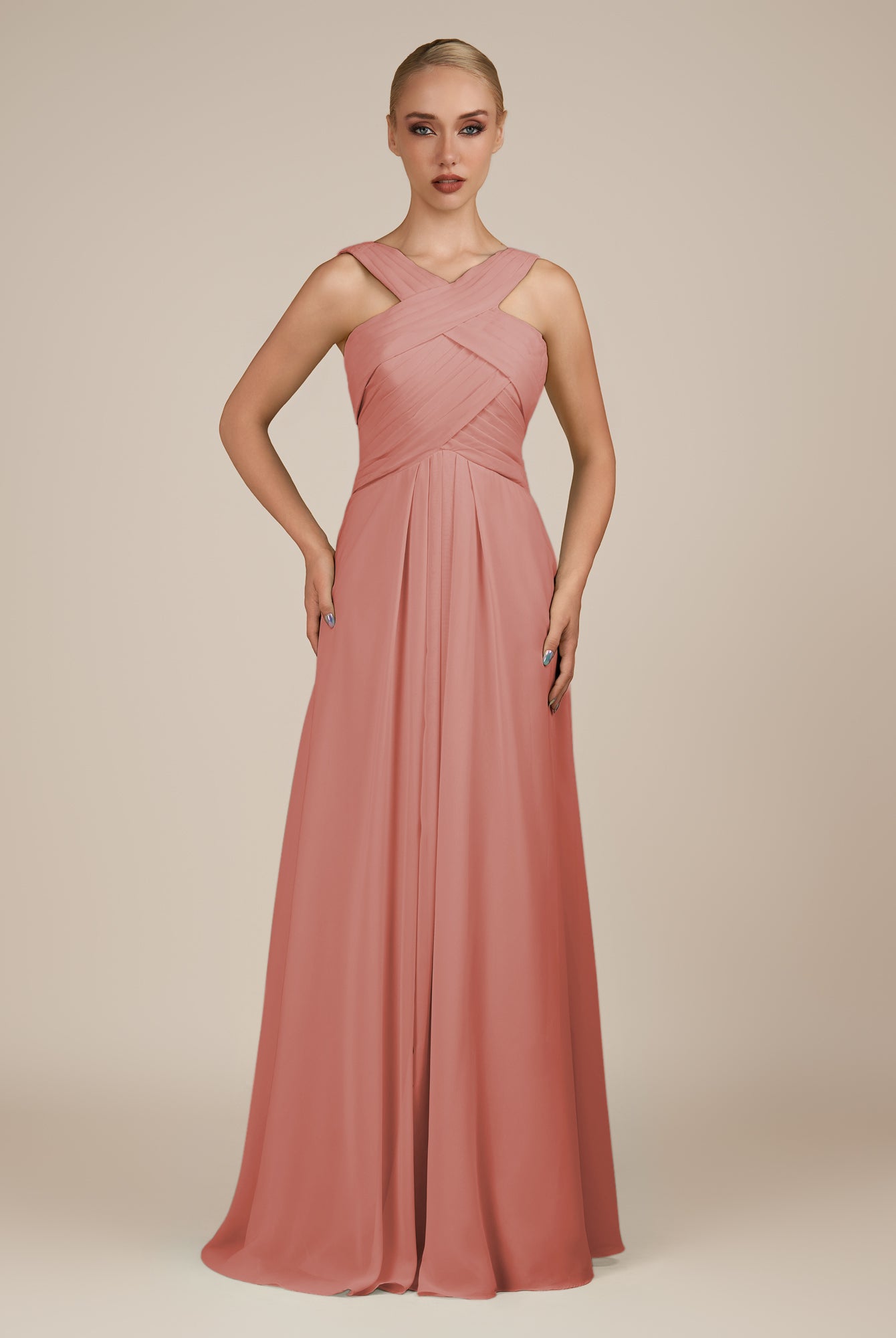 Sharlie | Dusty Rose - A Line Chiffon Halter Neck Long Bridesmaid Dress with Pleats