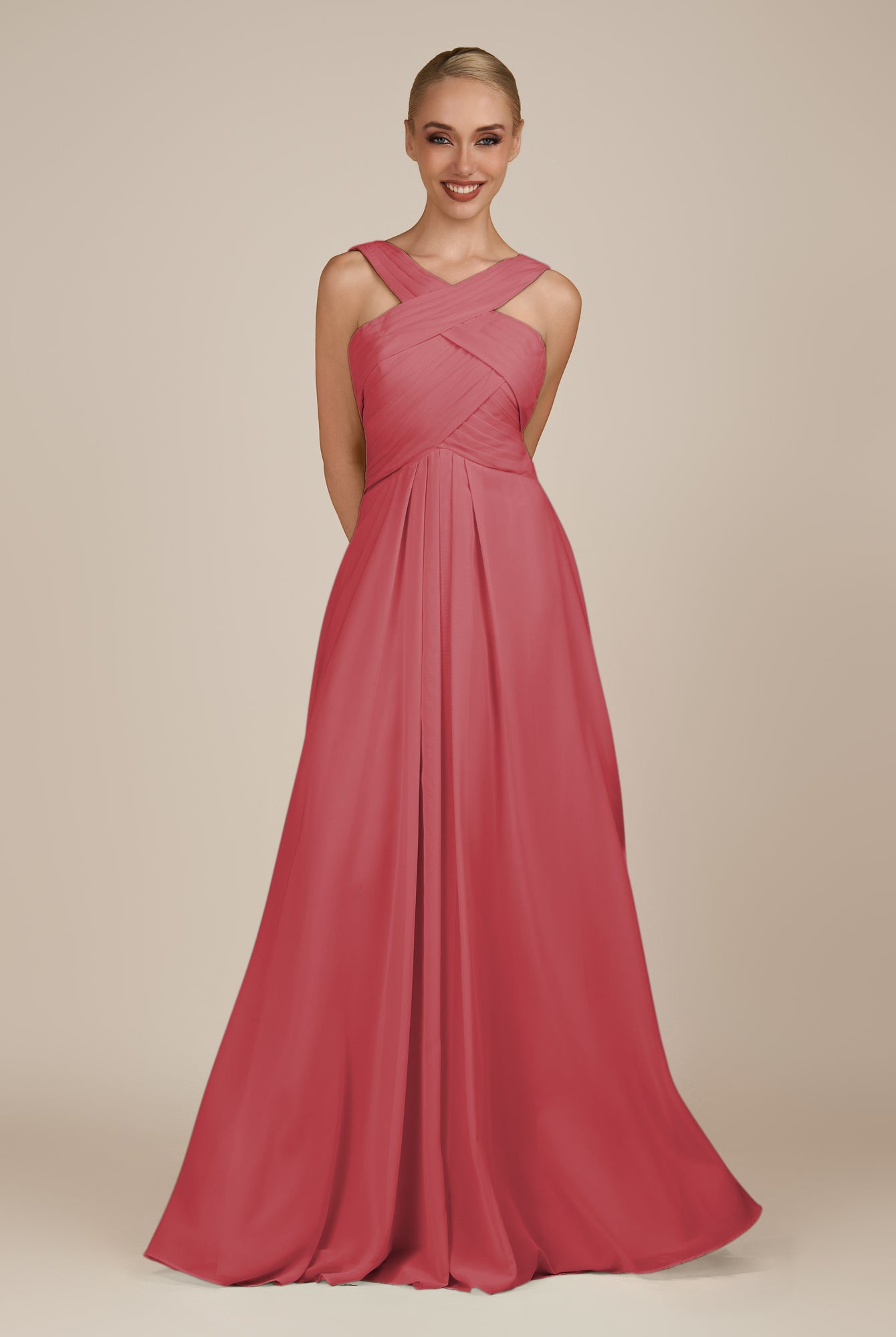 Sharlie | English Rose - A Line Chiffon Halter Neck Long Bridesmaid Dress with Pleats