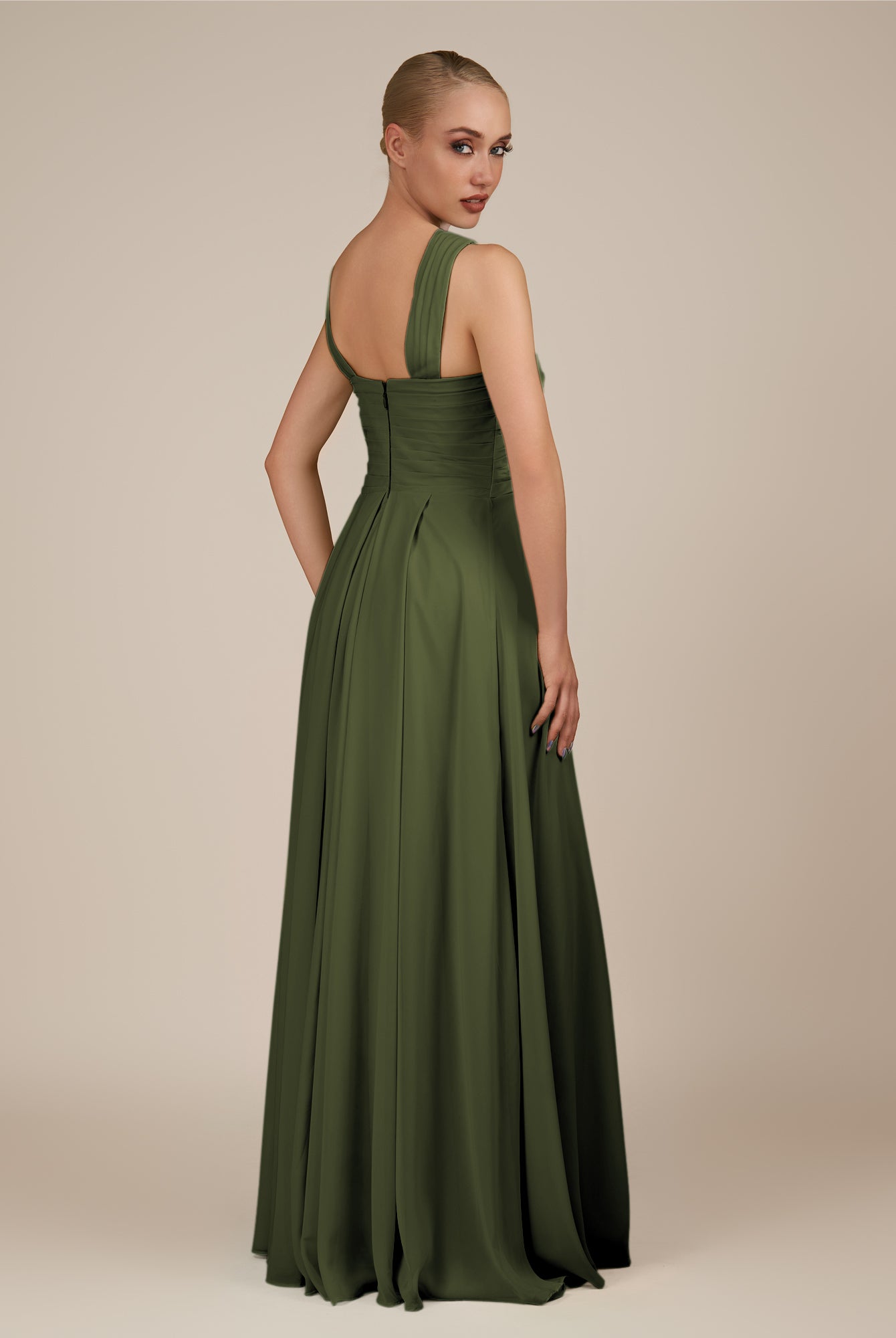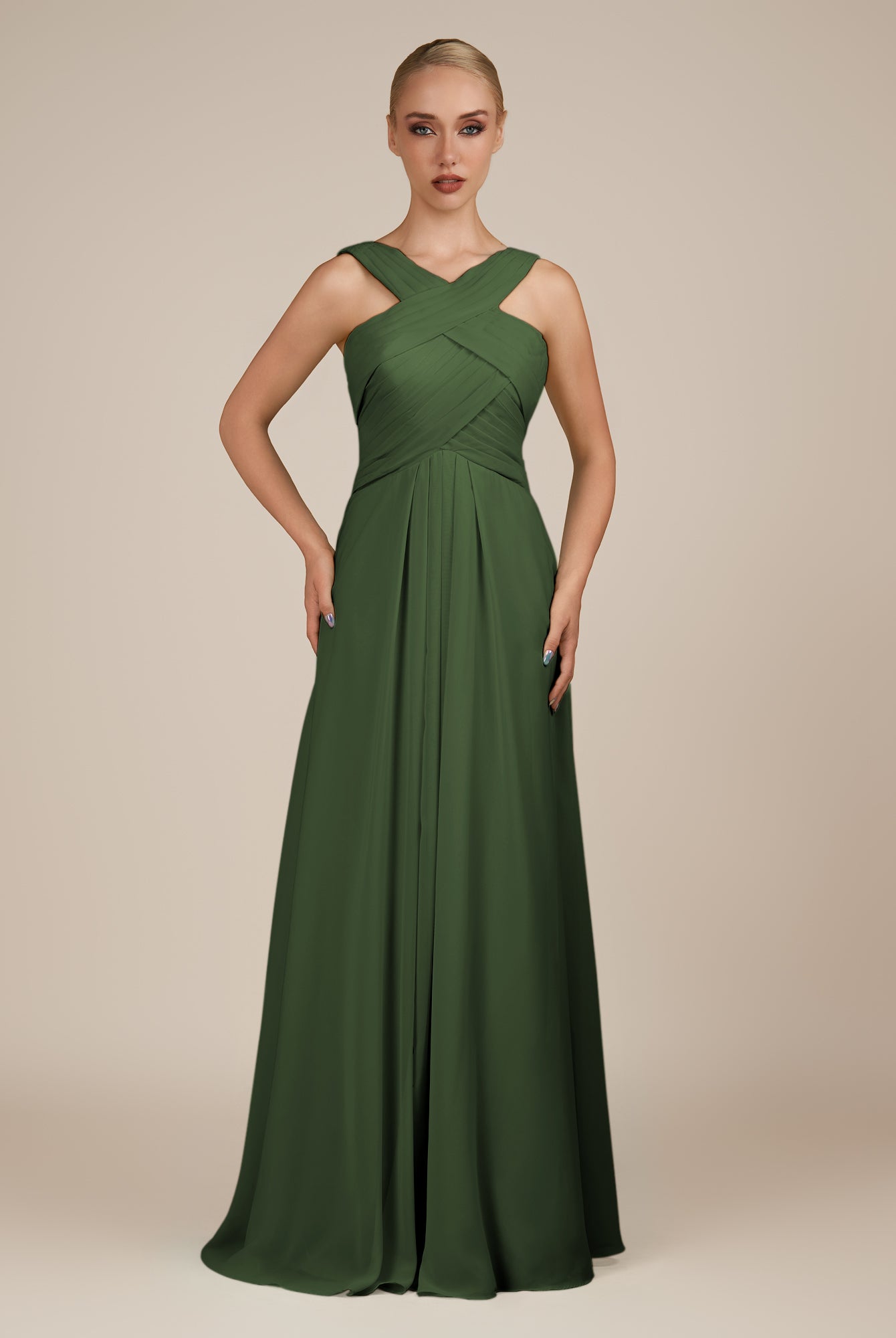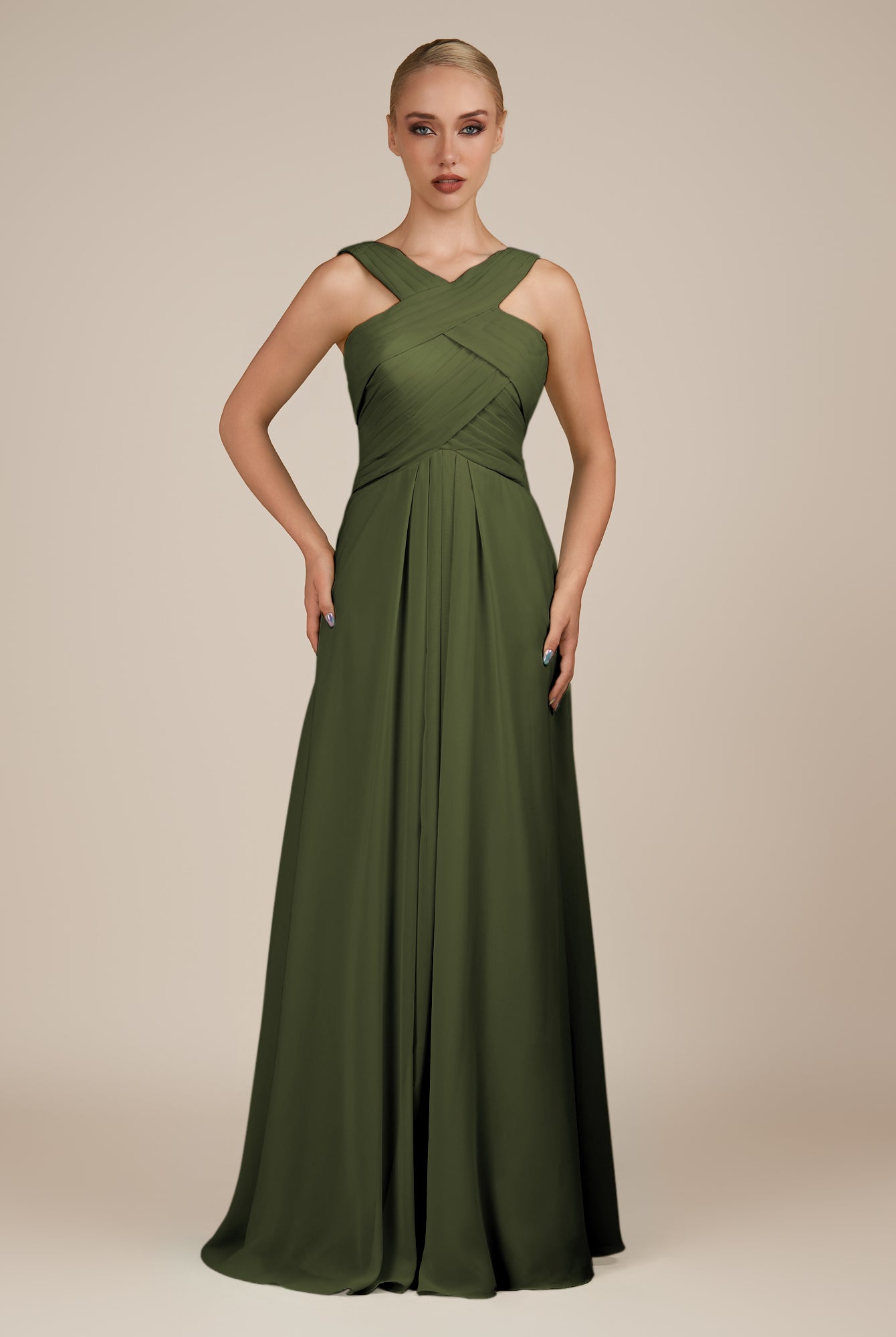 Sharlie | Olive - A Line Chiffon Halter Neck Long Bridesmaid Dress with Pleats