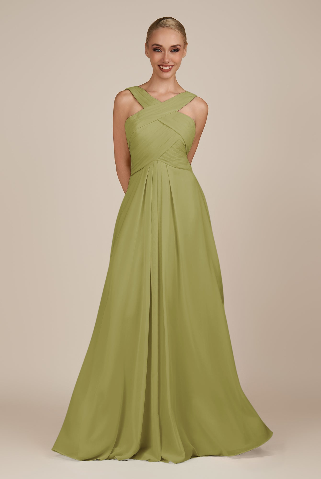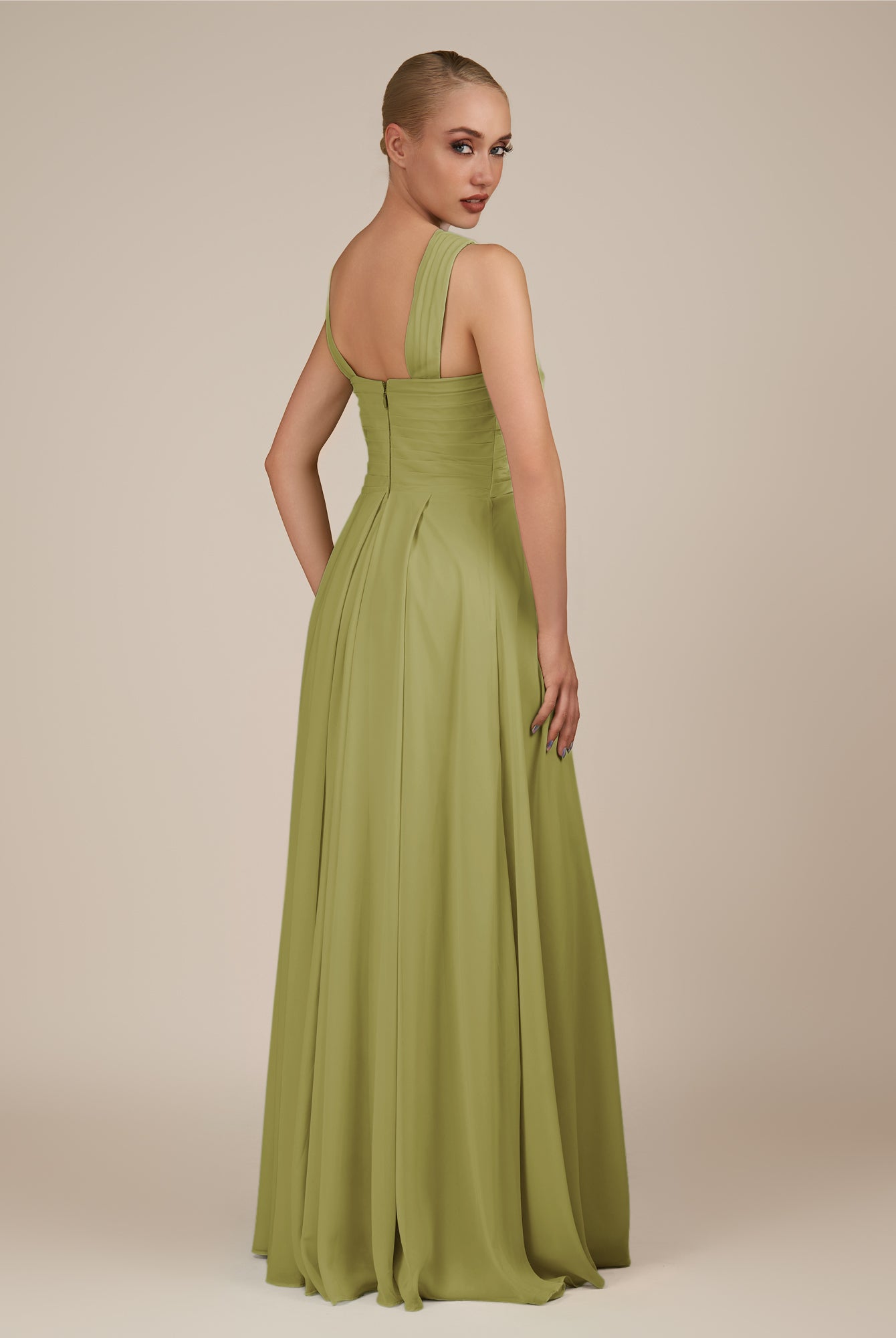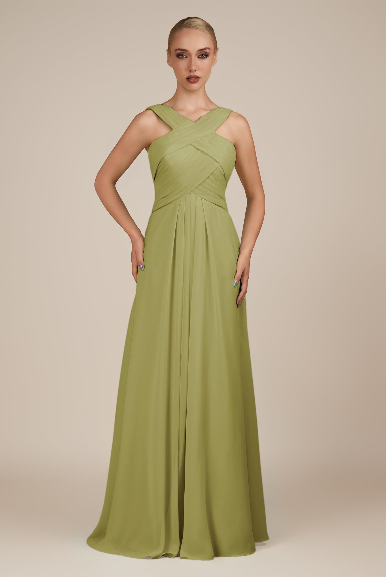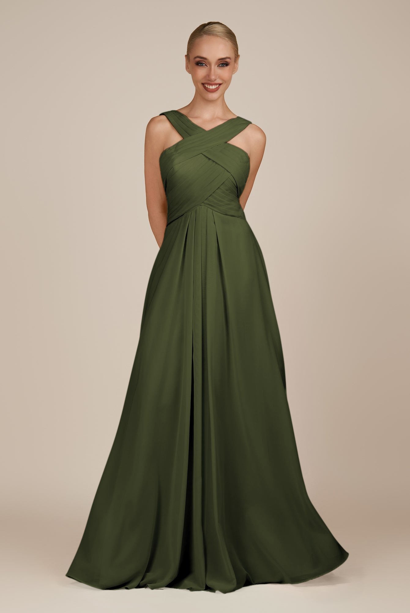 Sharlie | Olive - A Line Chiffon Halter Neck Long Bridesmaid Dress with Pleats
