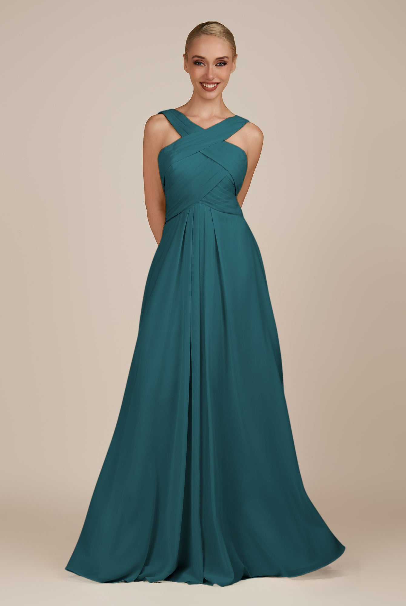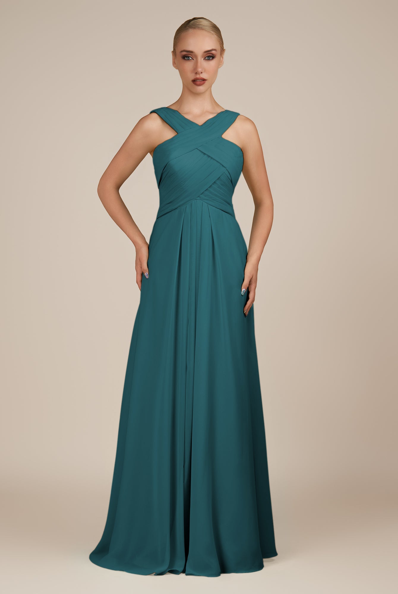 Sharlie | Pine - A Line Chiffon Halter Neck Long Bridesmaid Dress with Pleats