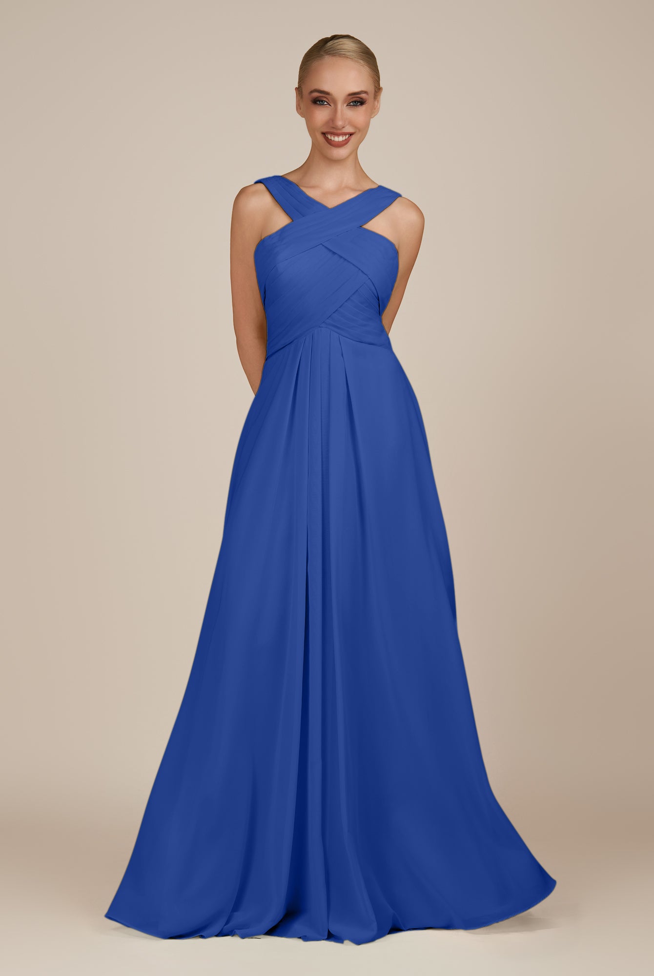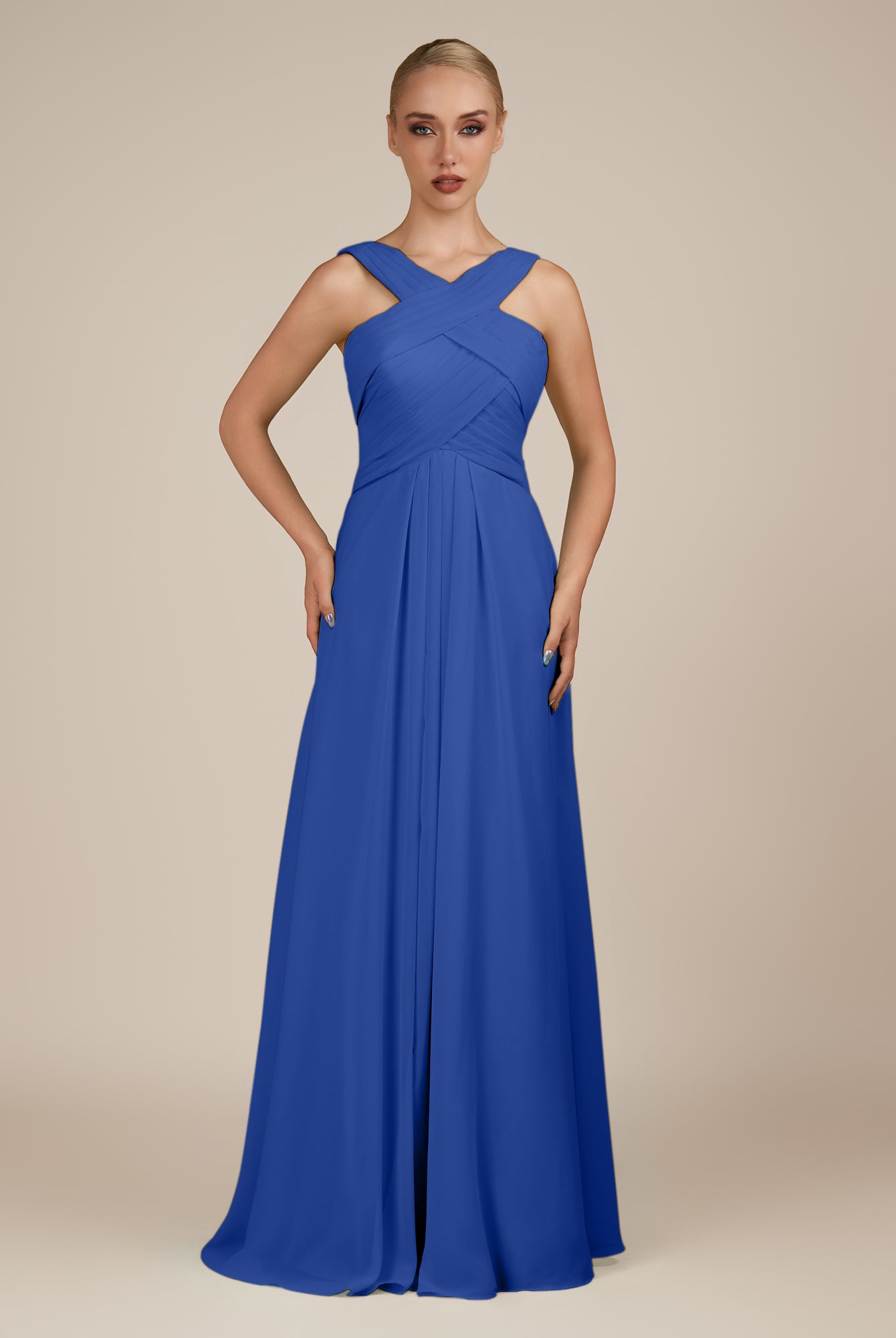 Sharlie | Royal Blue - A Line Chiffon Halter Neck Long Bridesmaid Dress with Pleats