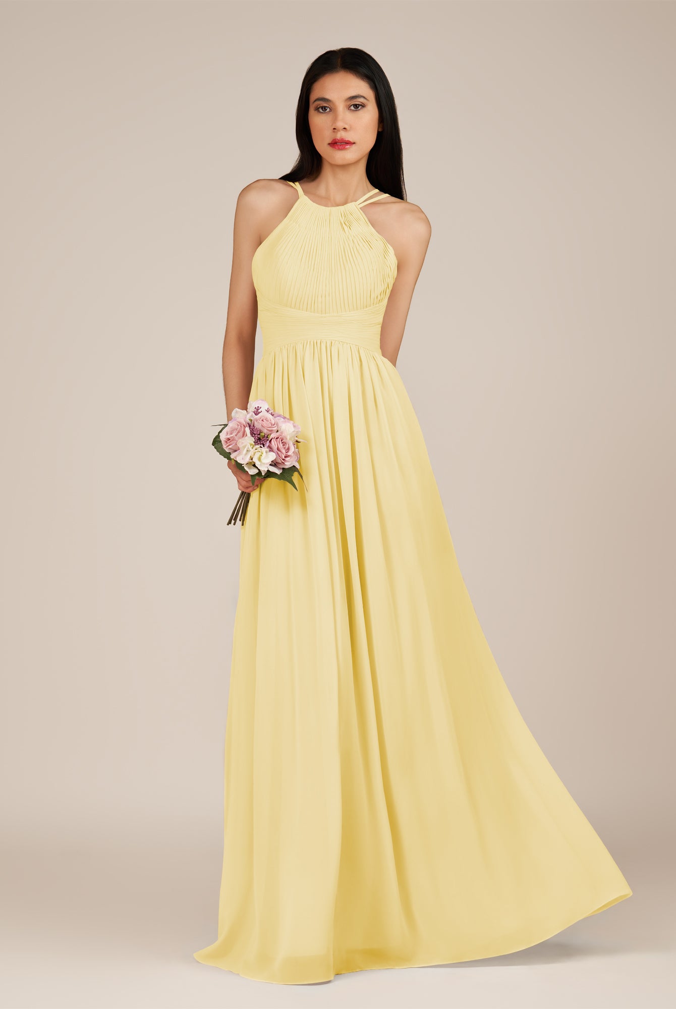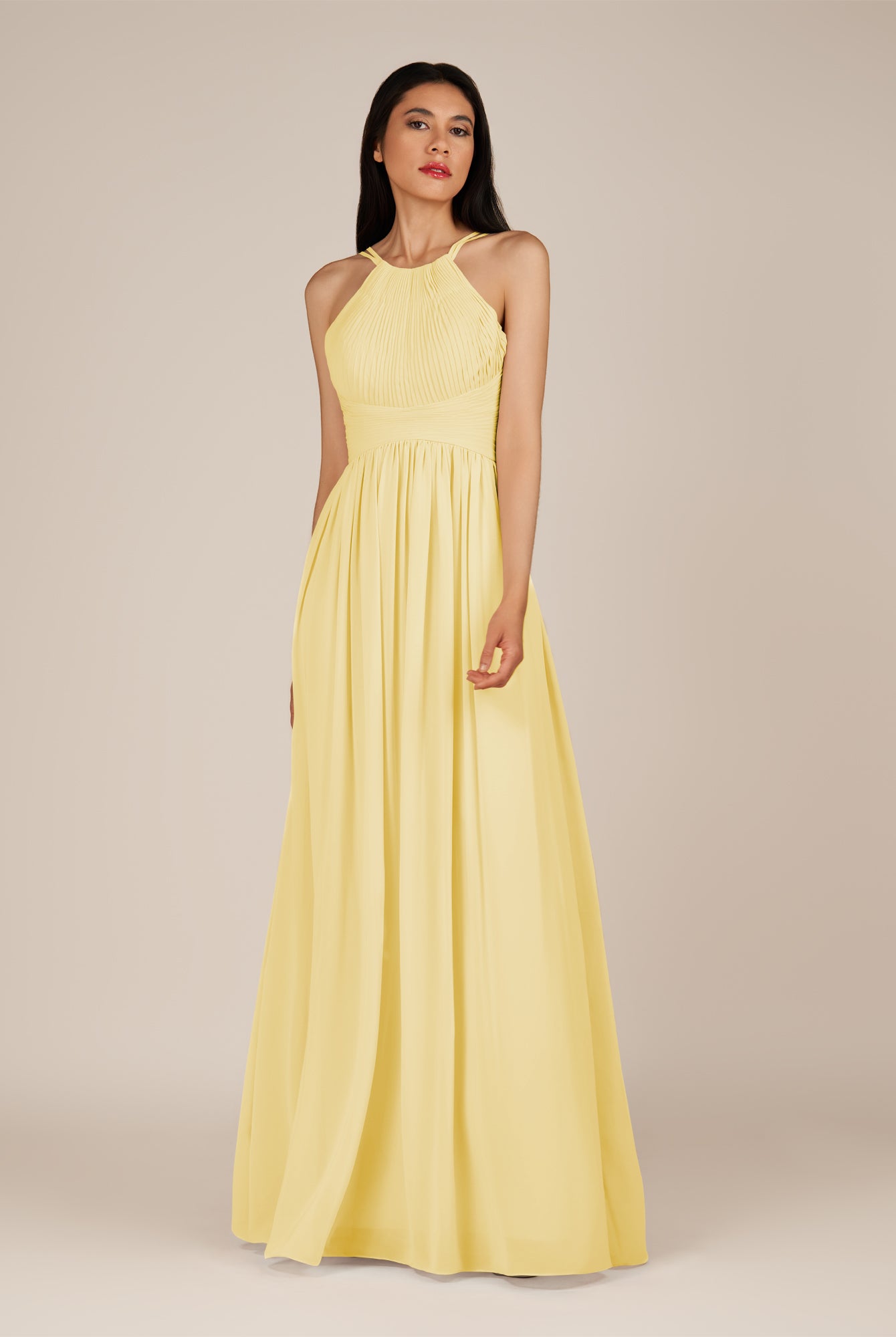 Ursa | Pastel Yellow - A Line Chiffon Halter Neck Long Bridesmaid Dress with Pleats