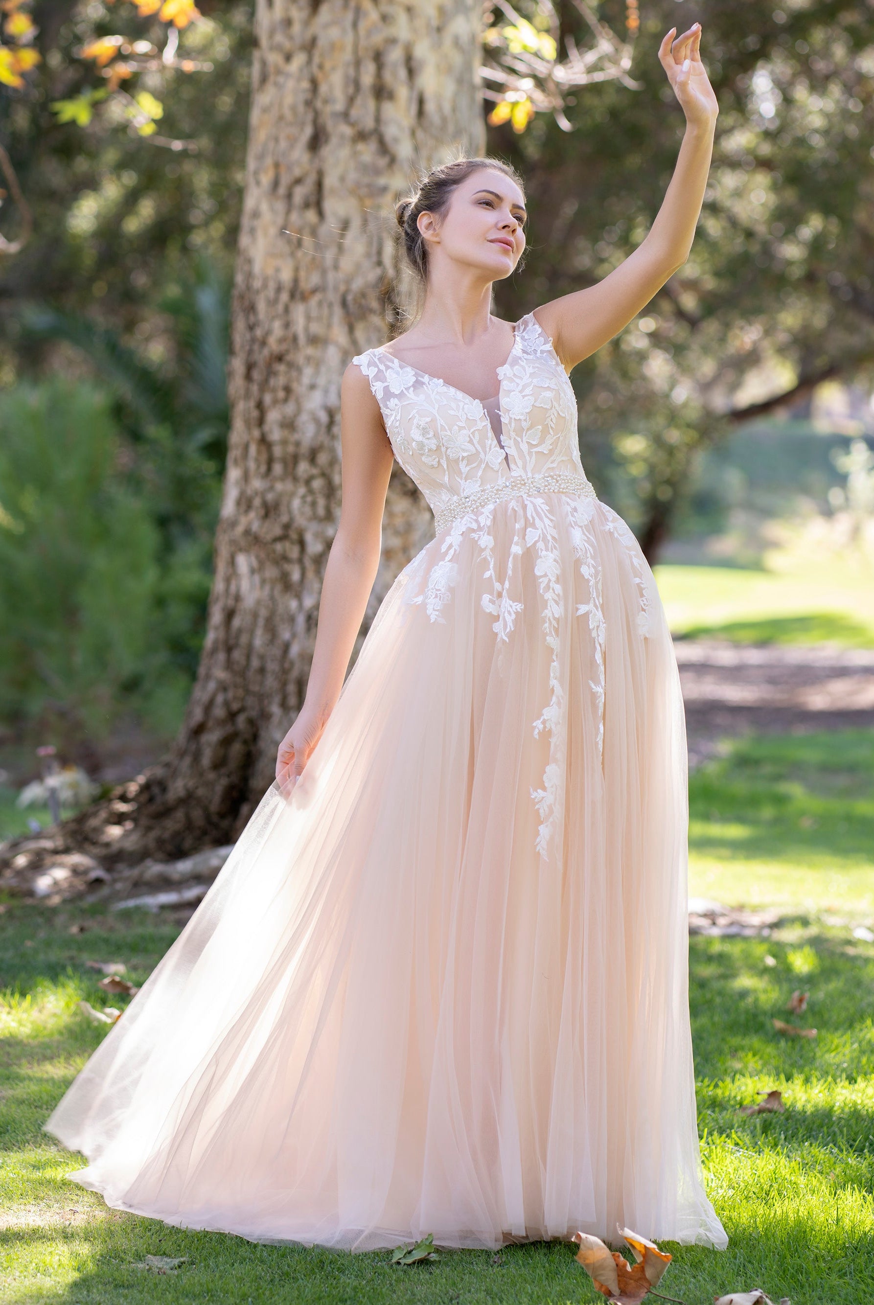 V Neck Sleeveless A-Line Long Tulle Backless White Wedding Dress