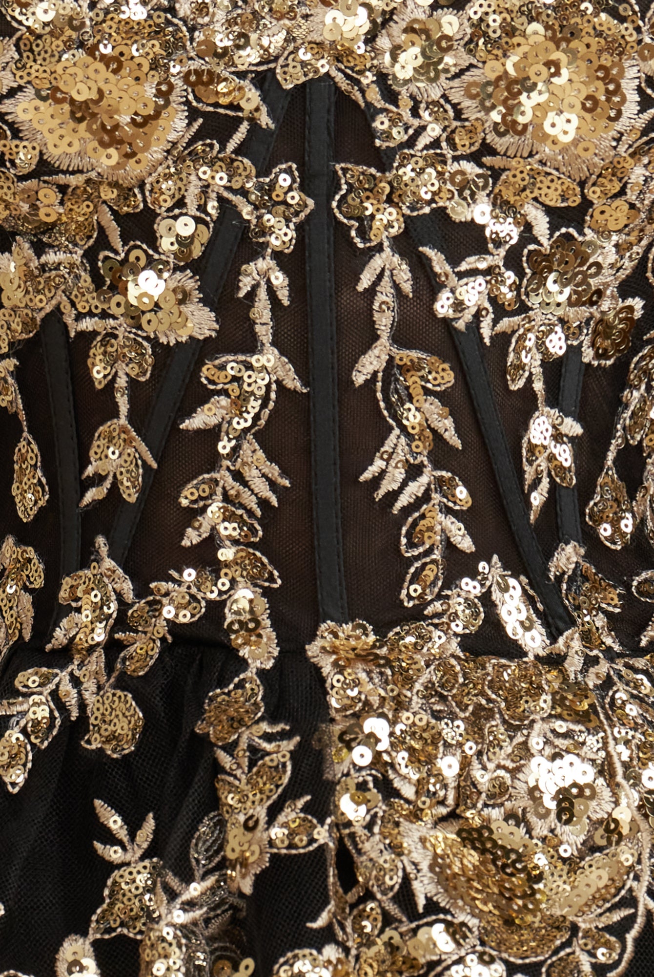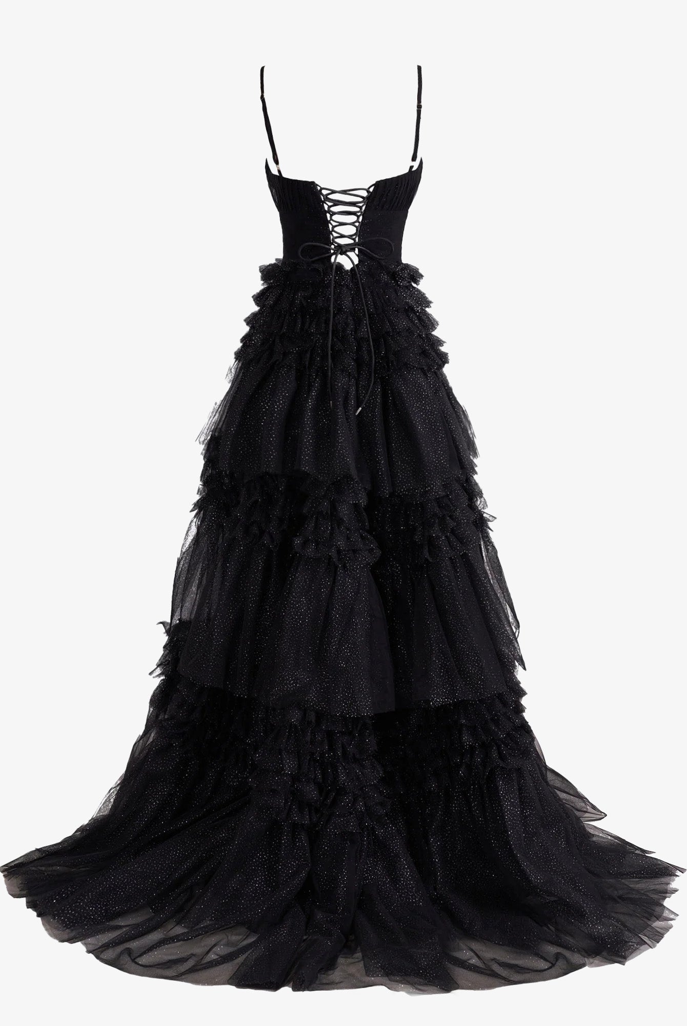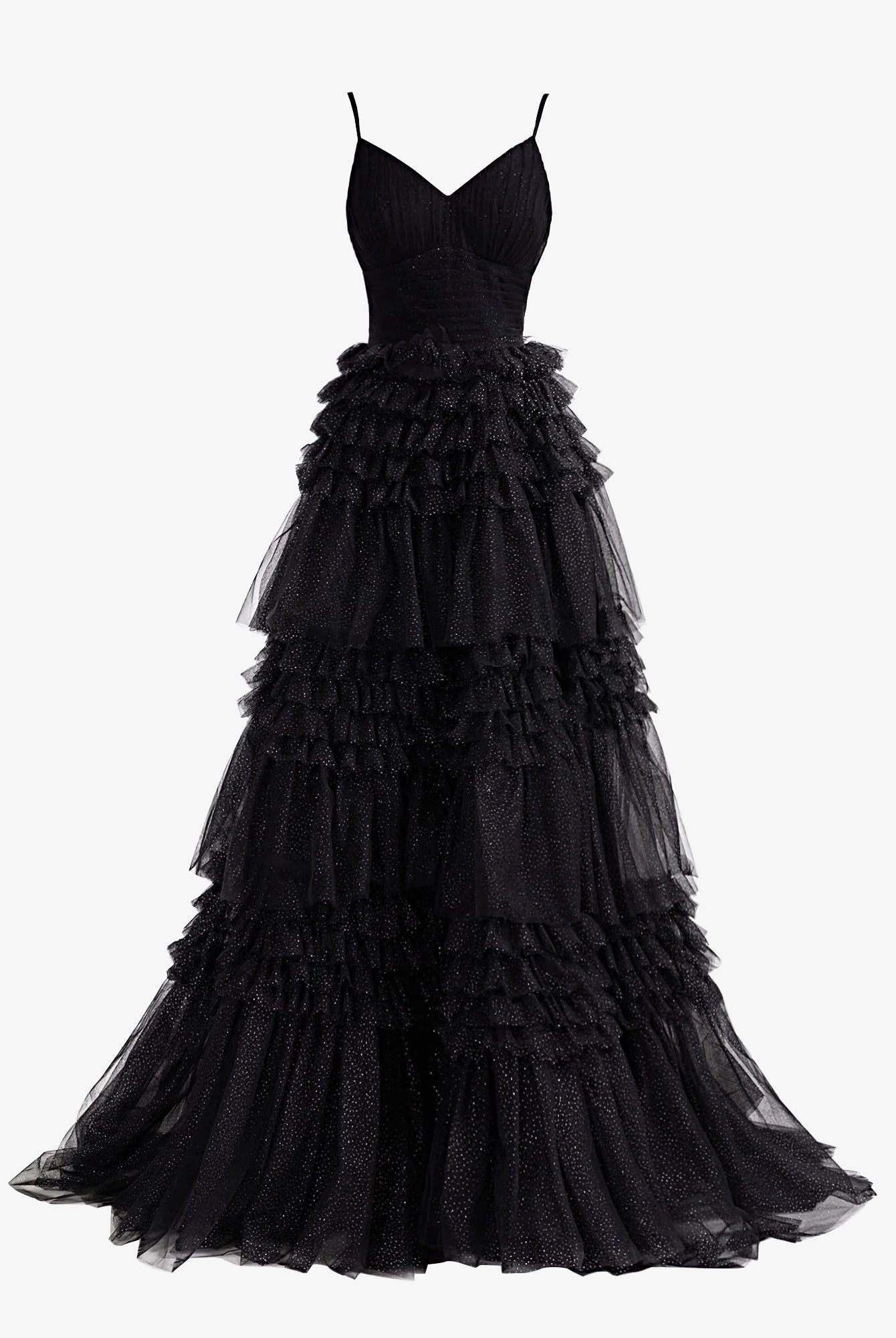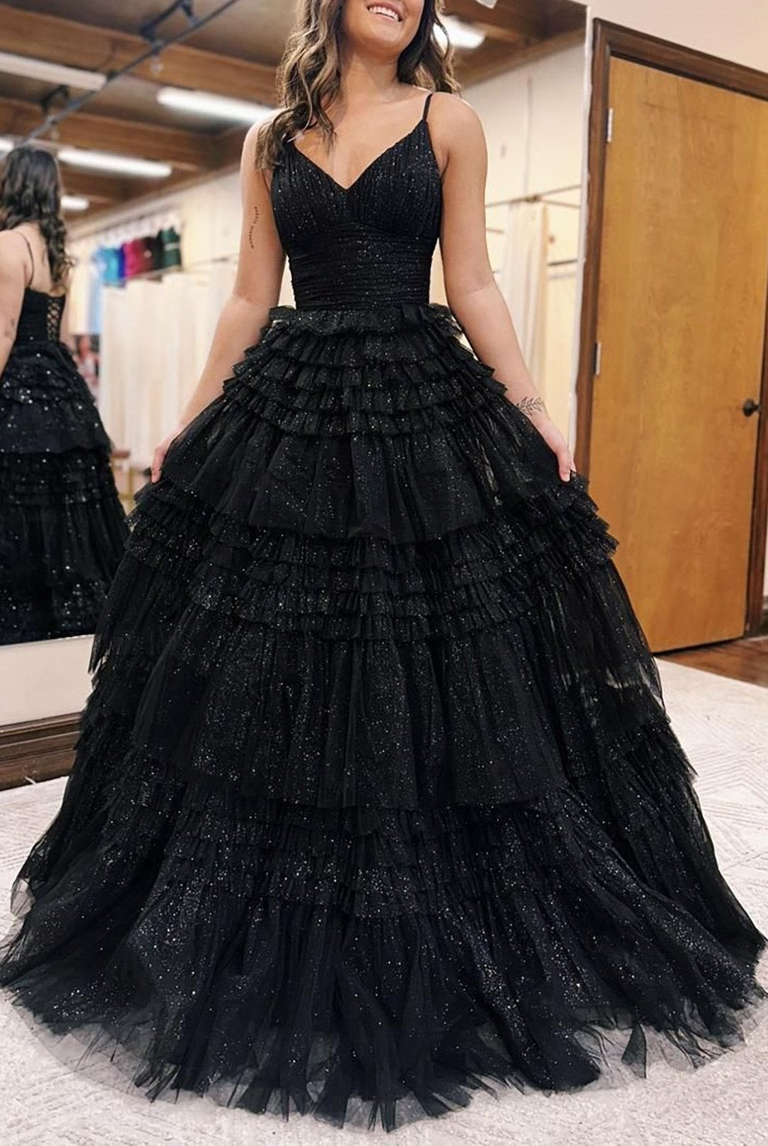 Emerson | Black A-Line Deep V Neck Tiered Long Glitter Tulle Prom Dress