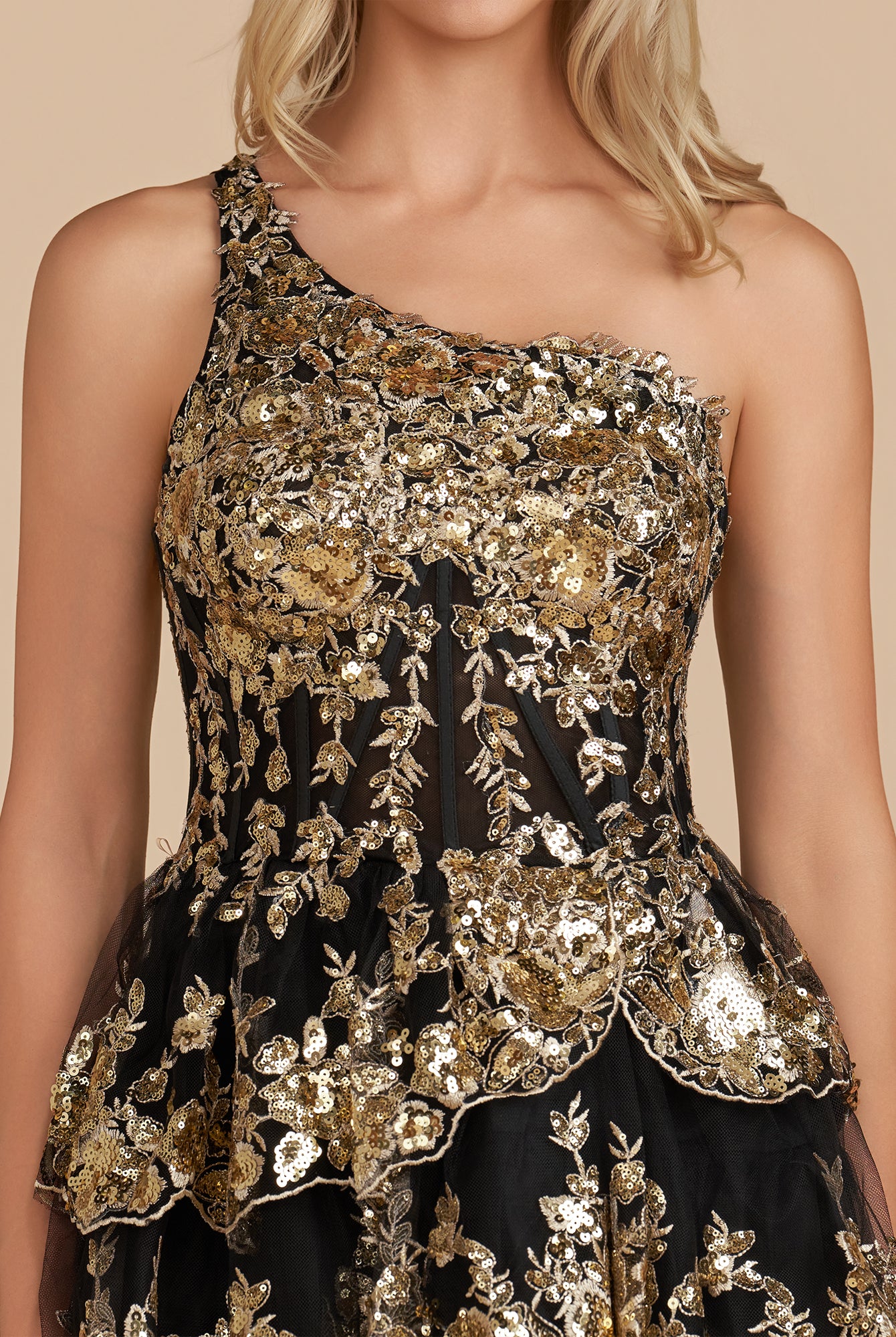 Emma | Black A Line One Shoulder Navy Tiered Lace Short Homecoming Dress