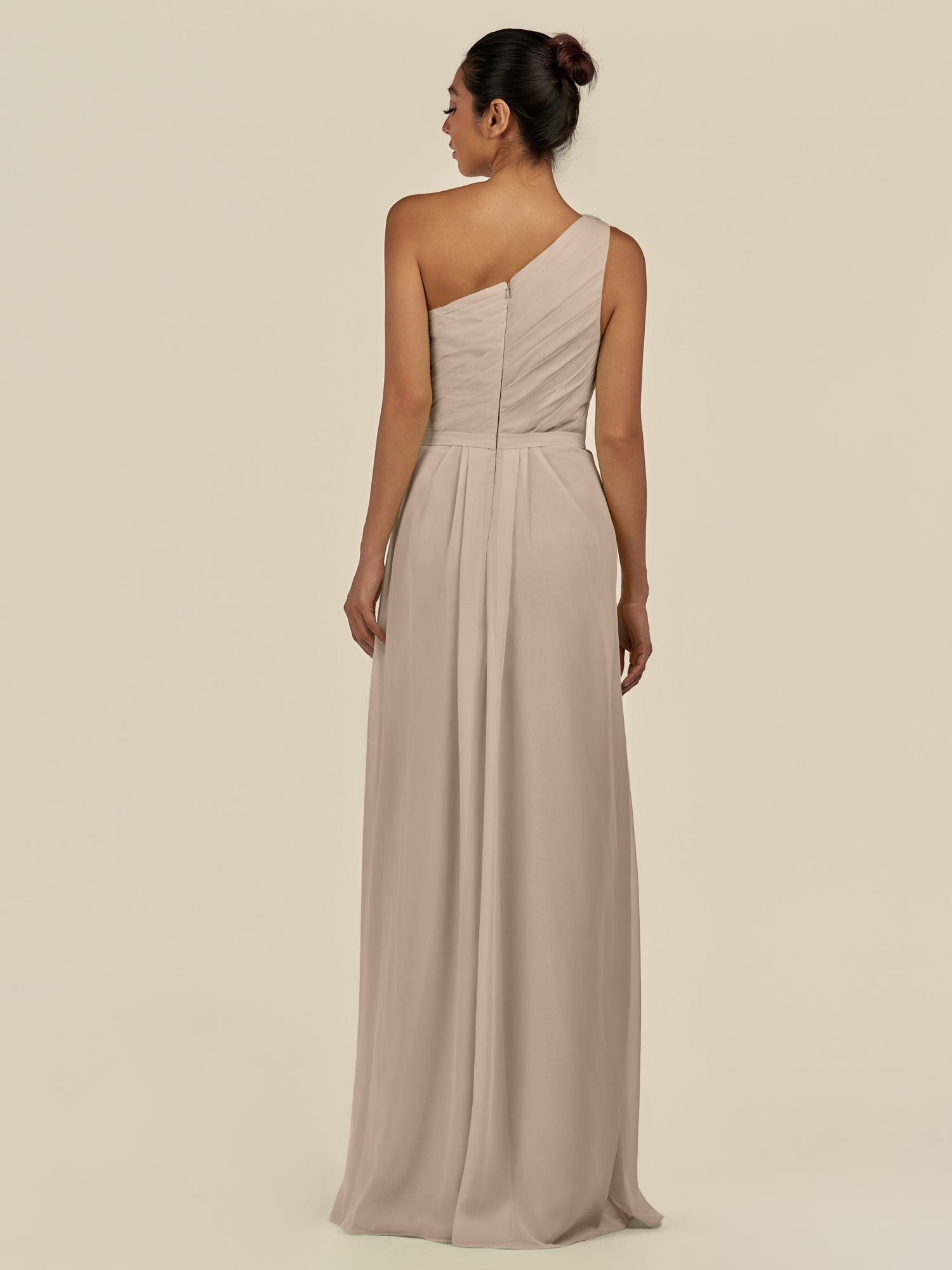 Assou is a graceful A-line chiffon bridesmaid dress. Her one-shoulder neckline and sleeveless design highlight elegance, while pleats and ruffles add texture and movement. The floor-length skirt features a slit for effortless walking, and a zipper back ensures a flawless fit—perfect for your wedding party.