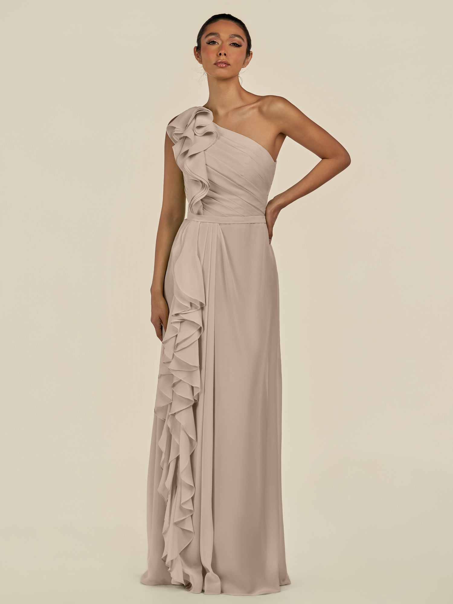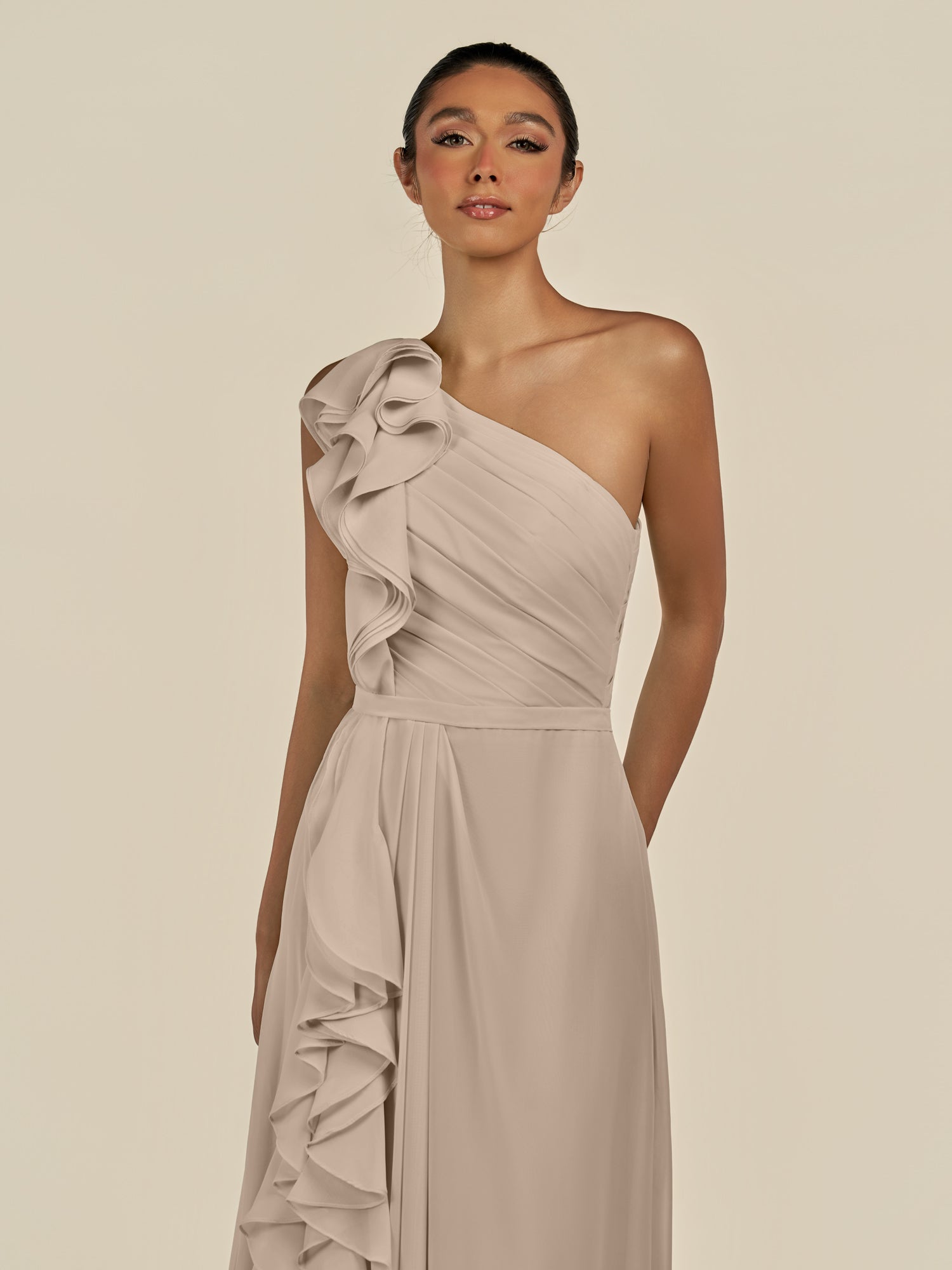 Assou | Almond - A Line One Shoulder Chiffon Pleated Ruffles Long Bridesmaid Dress with Slit