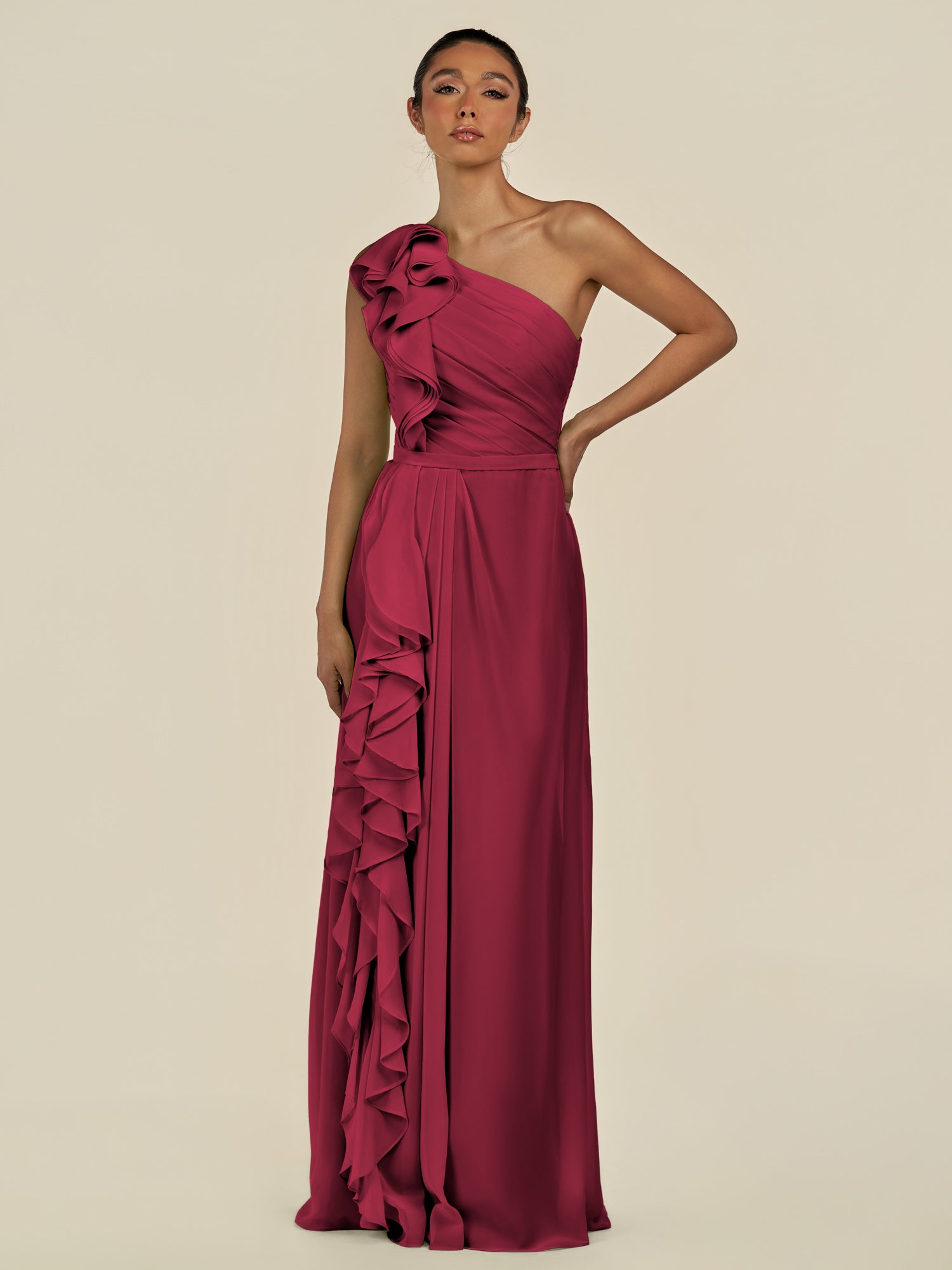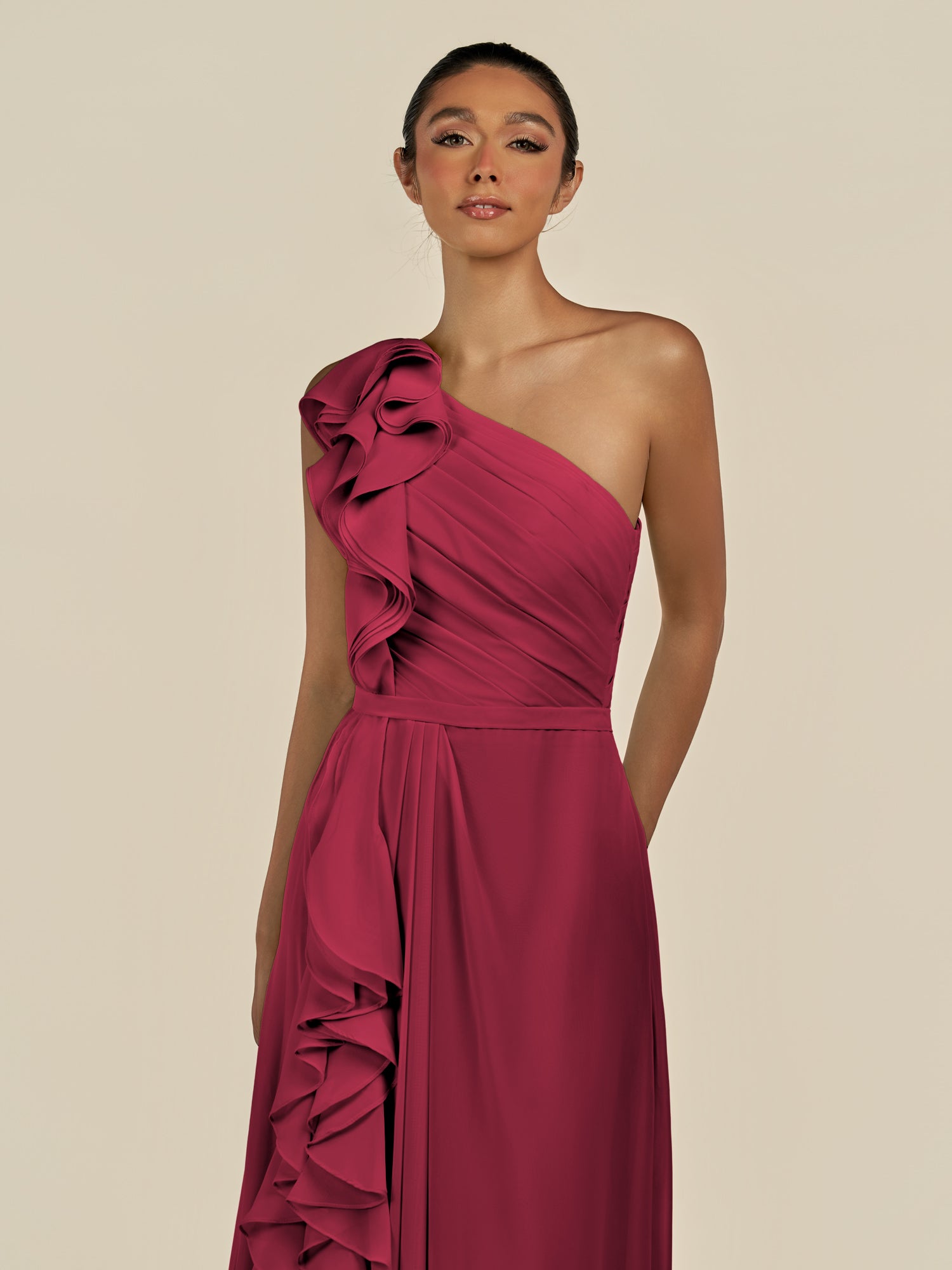 Assou | Berry - A Line One Shoulder Chiffon Pleated Ruffles Long Bridesmaid Dress with Slit