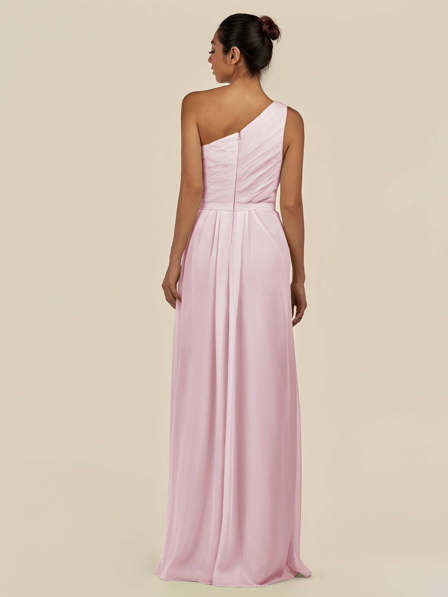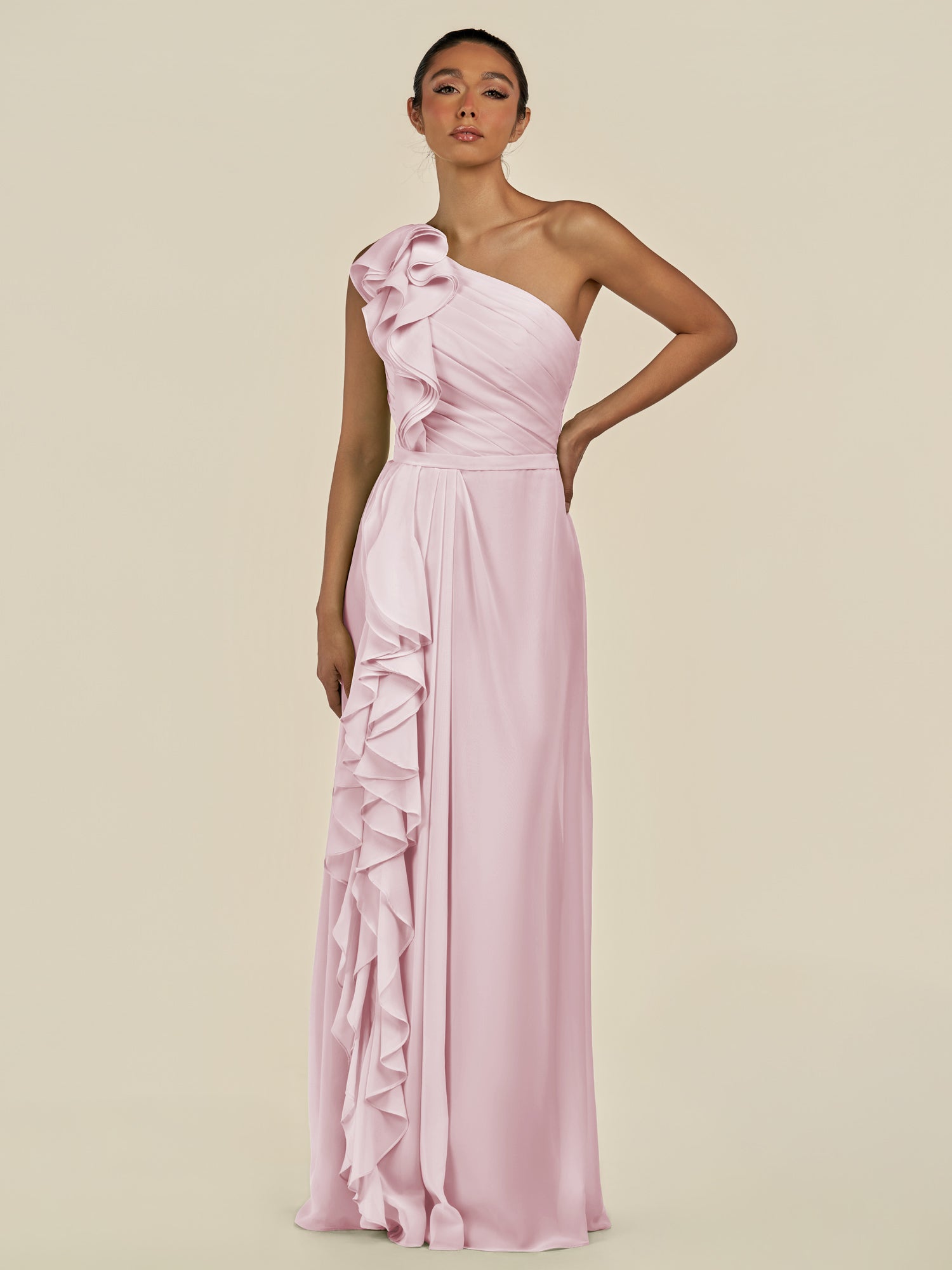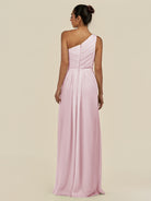 Assou is a graceful A-line chiffon bridesmaid dress. Her one-shoulder neckline and sleeveless design highlight elegance, while pleats and ruffles add texture and movement. The floor-length skirt features a slit for effortless walking, and a zipper back ensures a flawless fit—perfect for your wedding party.