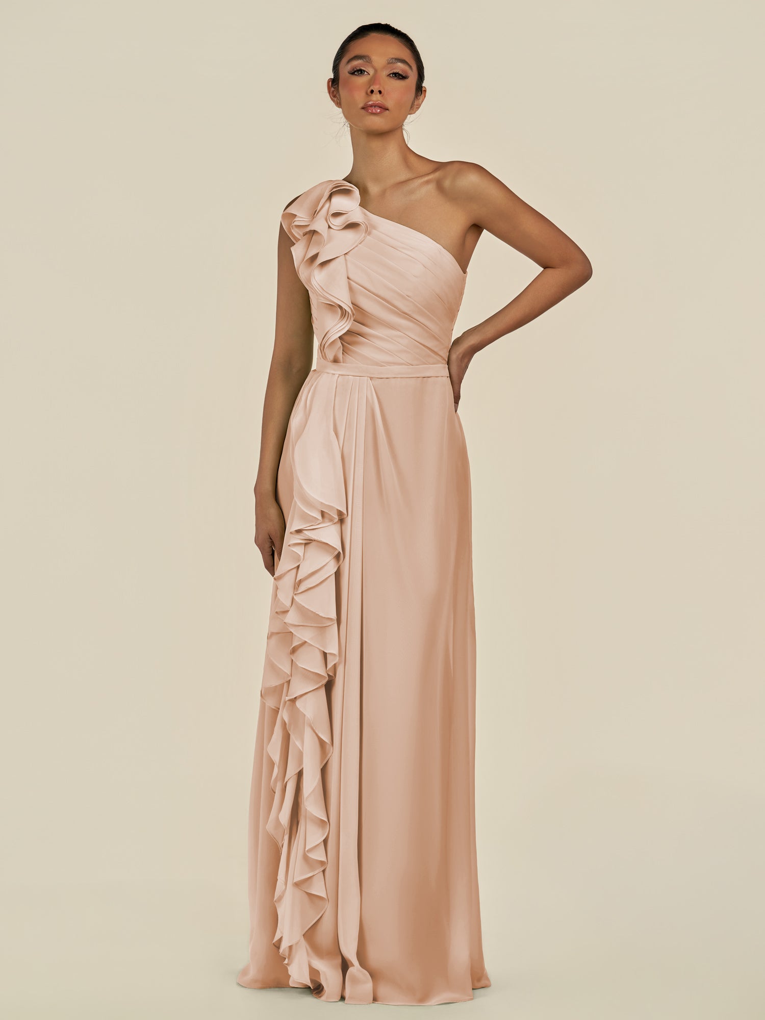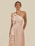 Assou | Champagne Rose - A Line One Shoulder Chiffon Pleated Ruffles Long Bridesmaid Dress with Slit
