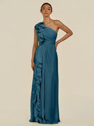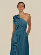 Assou | Dark Teal - A Line One Shoulder Chiffon Pleated Ruffles Long Bridesmaid Dress with Slit