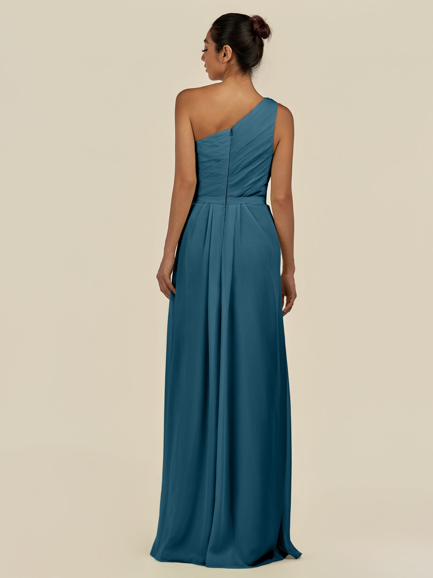 Assou is a graceful A-line chiffon bridesmaid dress. Her one-shoulder neckline and sleeveless design highlight elegance, while pleats and ruffles add texture and movement. The floor-length skirt features a slit for effortless walking, and a zipper back ensures a flawless fit—perfect for your wedding party.