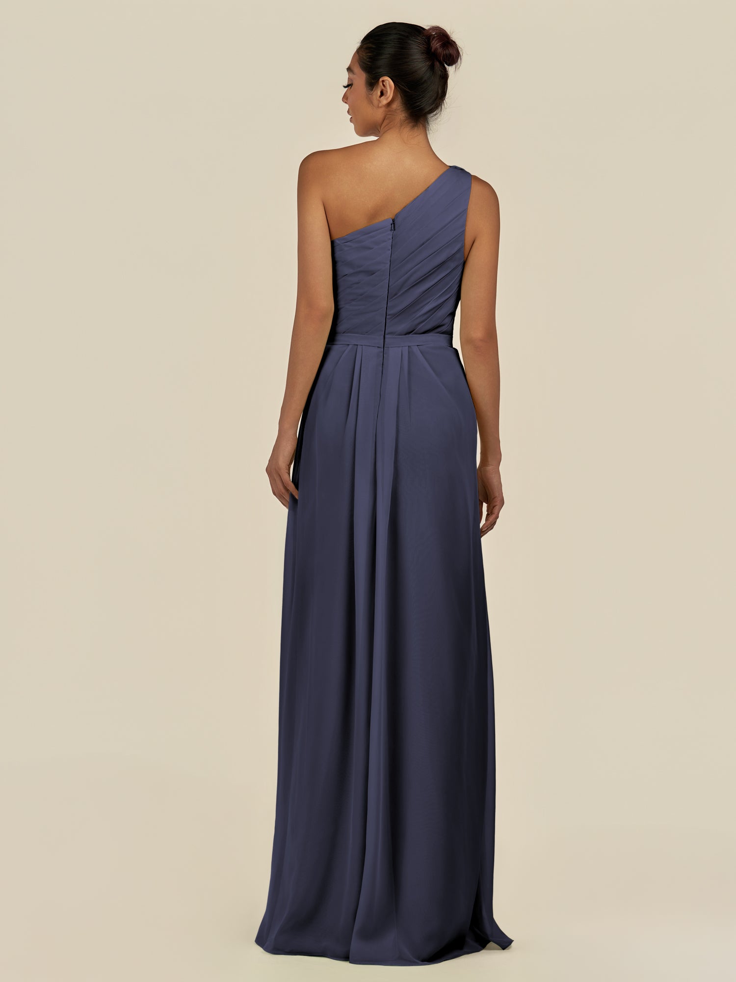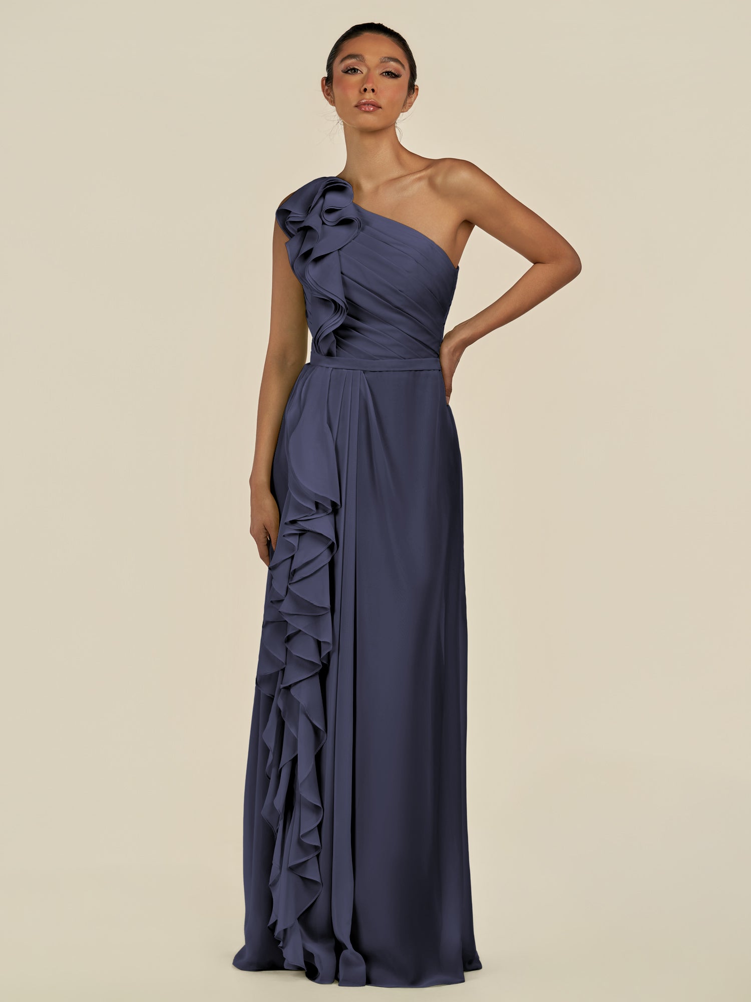 Assou is a graceful A-line chiffon bridesmaid dress. Her one-shoulder neckline and sleeveless design highlight elegance, while pleats and ruffles add texture and movement. The floor-length skirt features a slit for effortless walking, and a zipper back ensures a flawless fit—perfect for your wedding party.