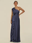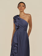 Assou | Dusk Blue - A Line One Shoulder Chiffon Pleated Ruffles Long Bridesmaid Dress with Slit