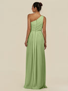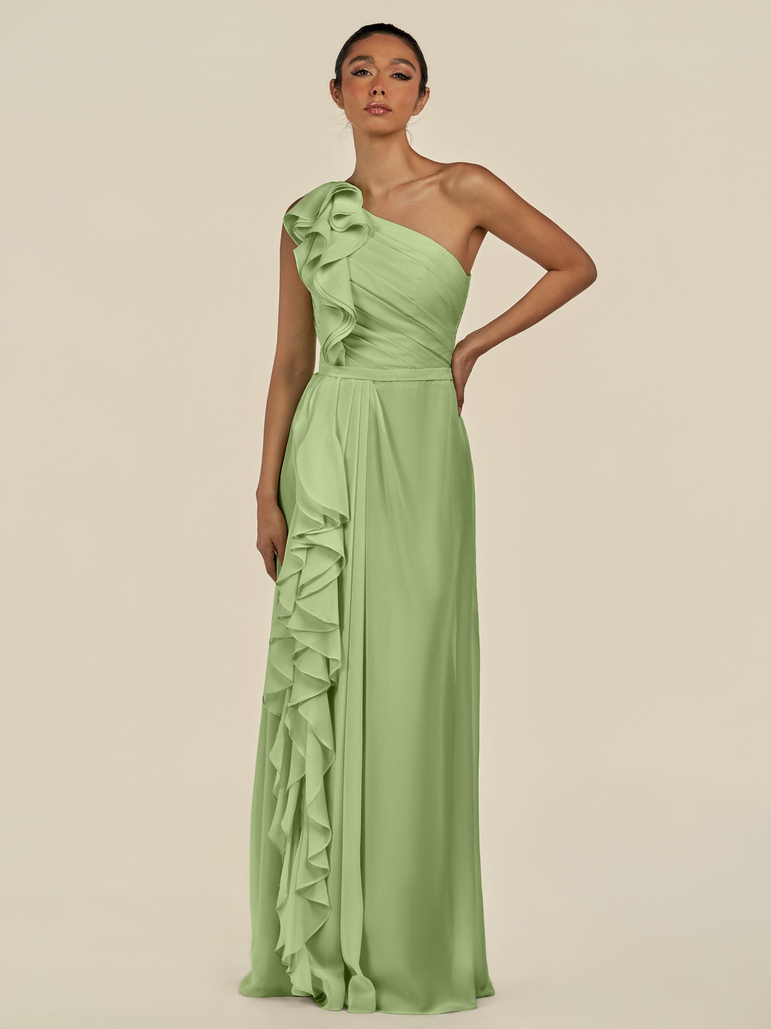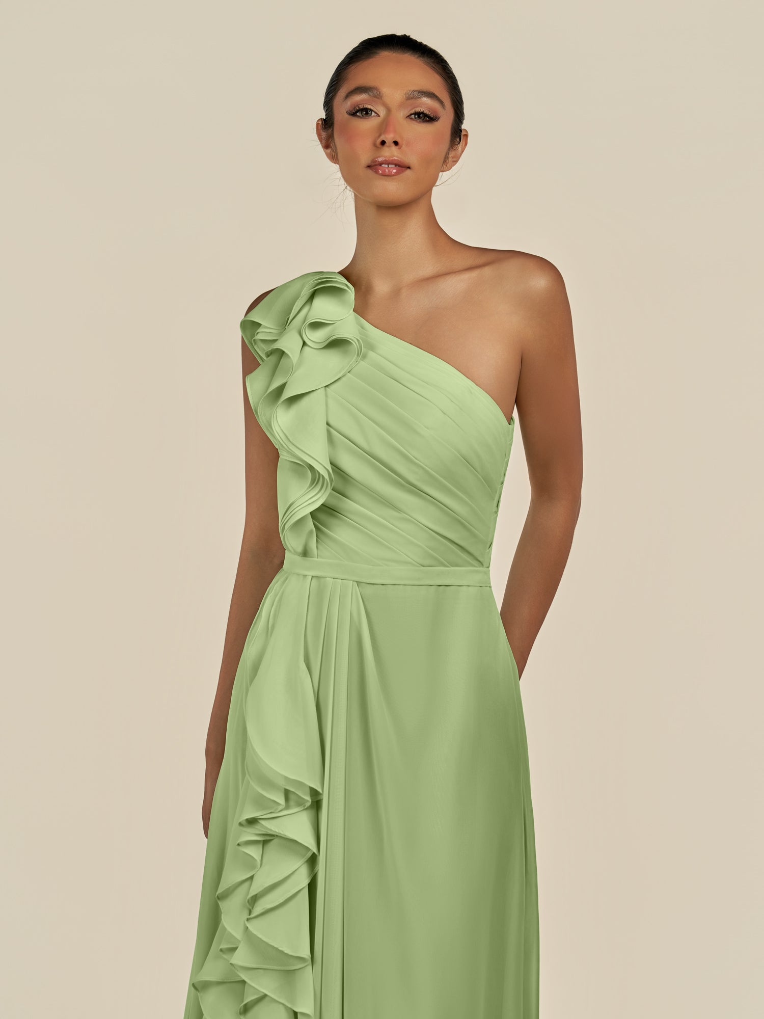 Assou | Matcha - A Line One Shoulder Chiffon Pleated Ruffles Long Bridesmaid Dress with Slit