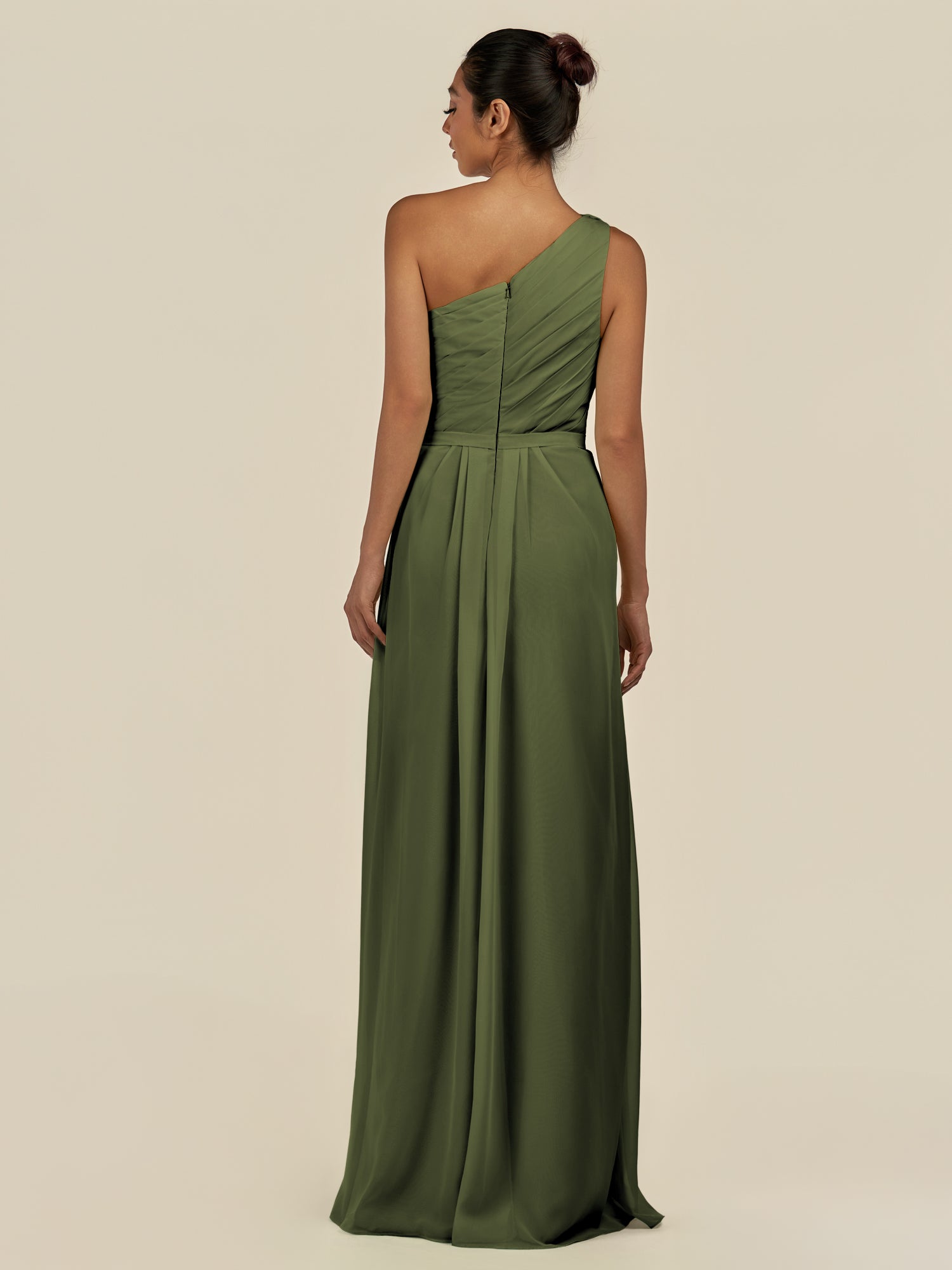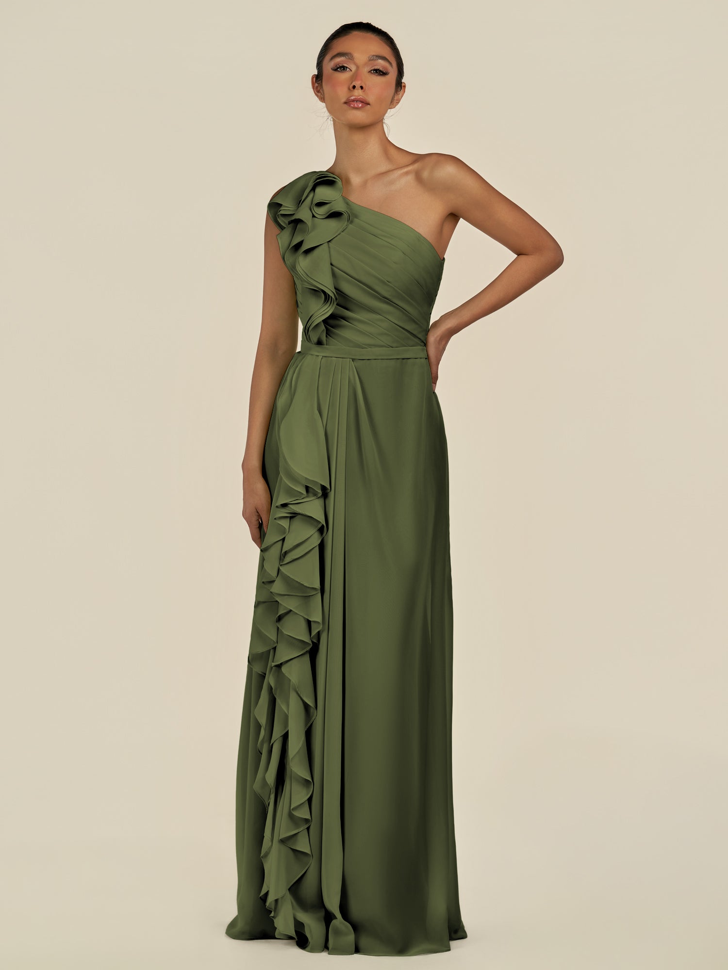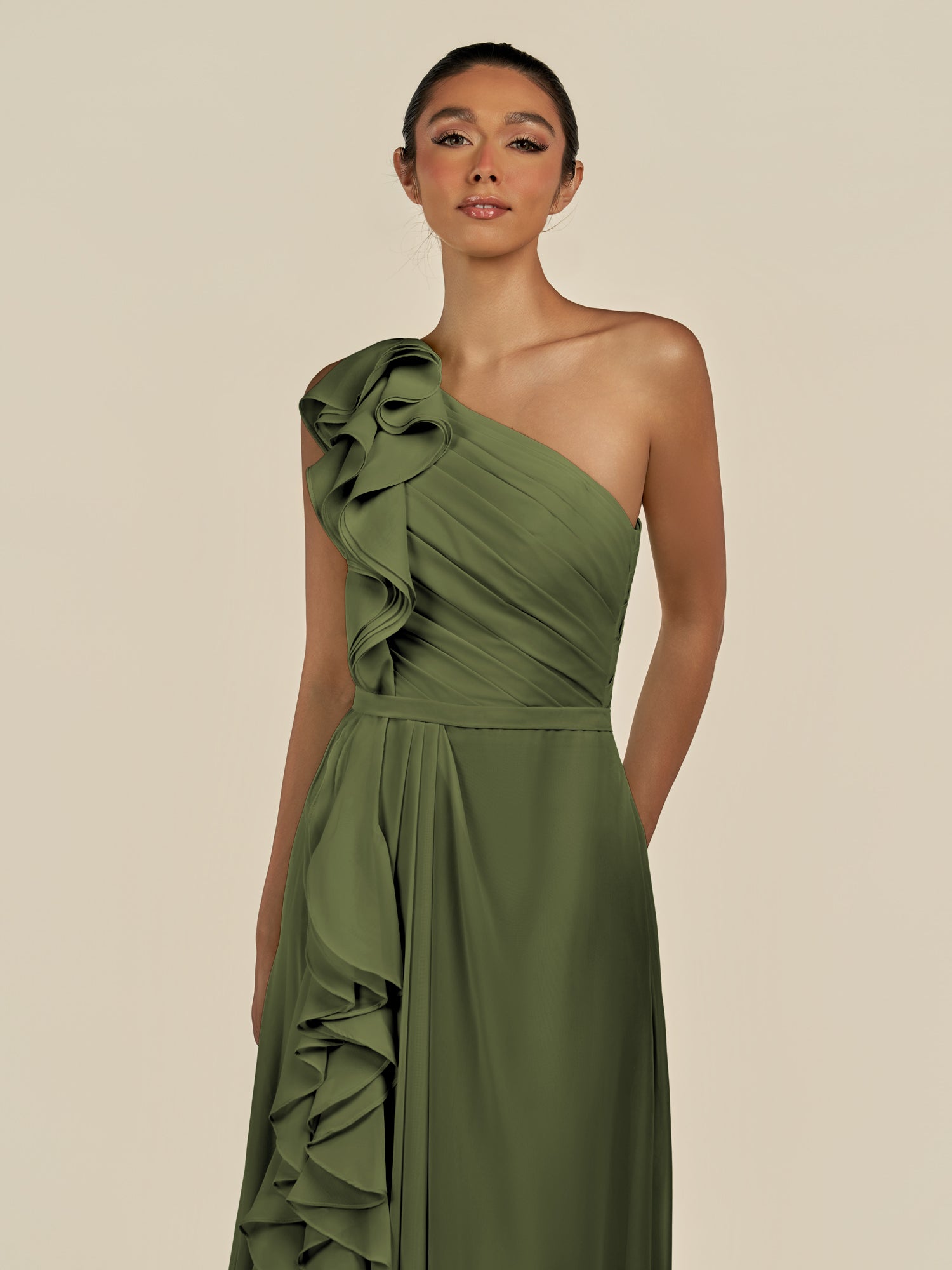 Assou | Olive - A Line One Shoulder Chiffon Pleated Ruffles Long Bridesmaid Dress with Slit