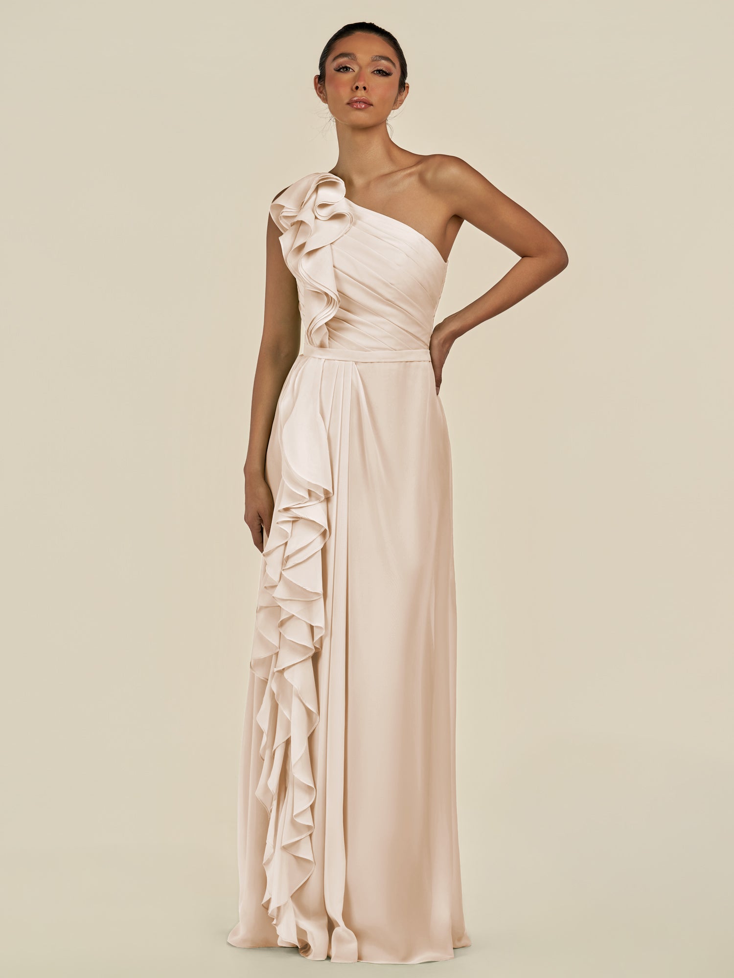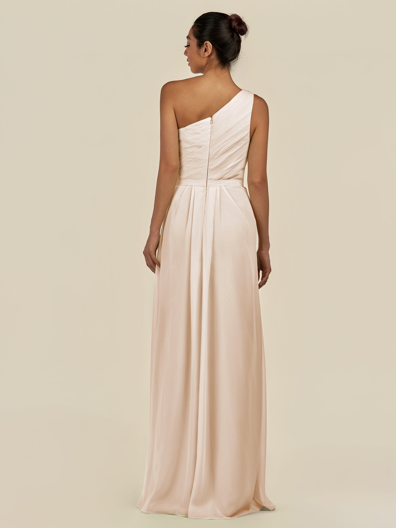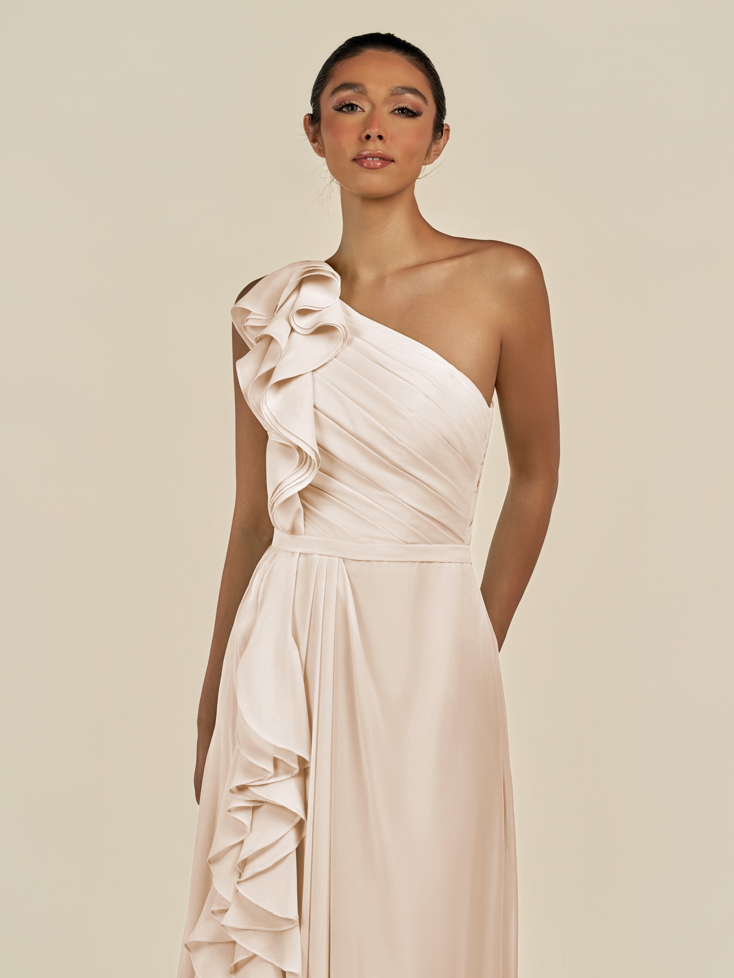 Assou is a graceful A-line chiffon bridesmaid dress. Her one-shoulder neckline and sleeveless design highlight elegance, while pleats and ruffles add texture and movement. The floor-length skirt features a slit for effortless walking, and a zipper back ensures a flawless fit—perfect for your wedding party.