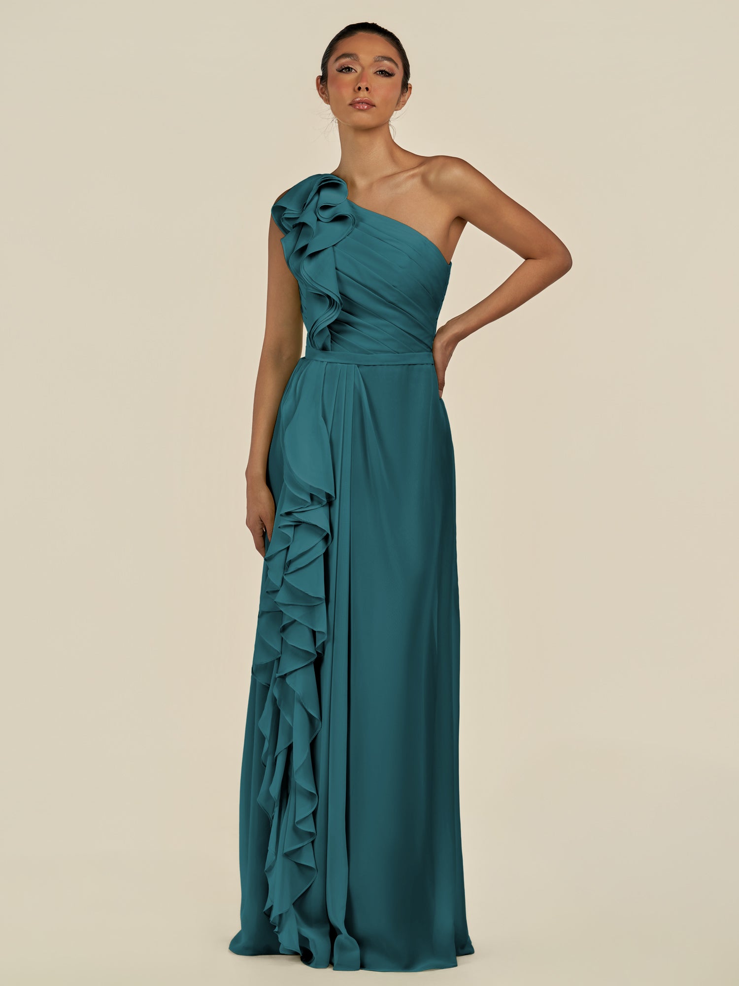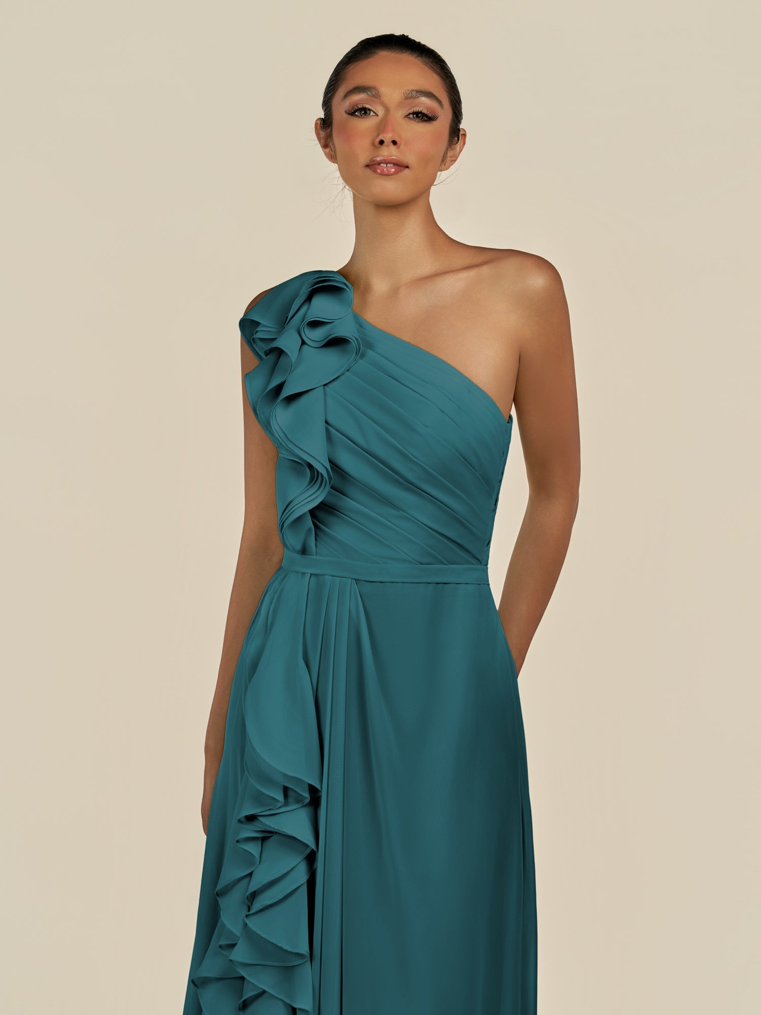 Assou | Pine - A Line One Shoulder Chiffon Pleated Ruffles Long Bridesmaid Dress with Slit