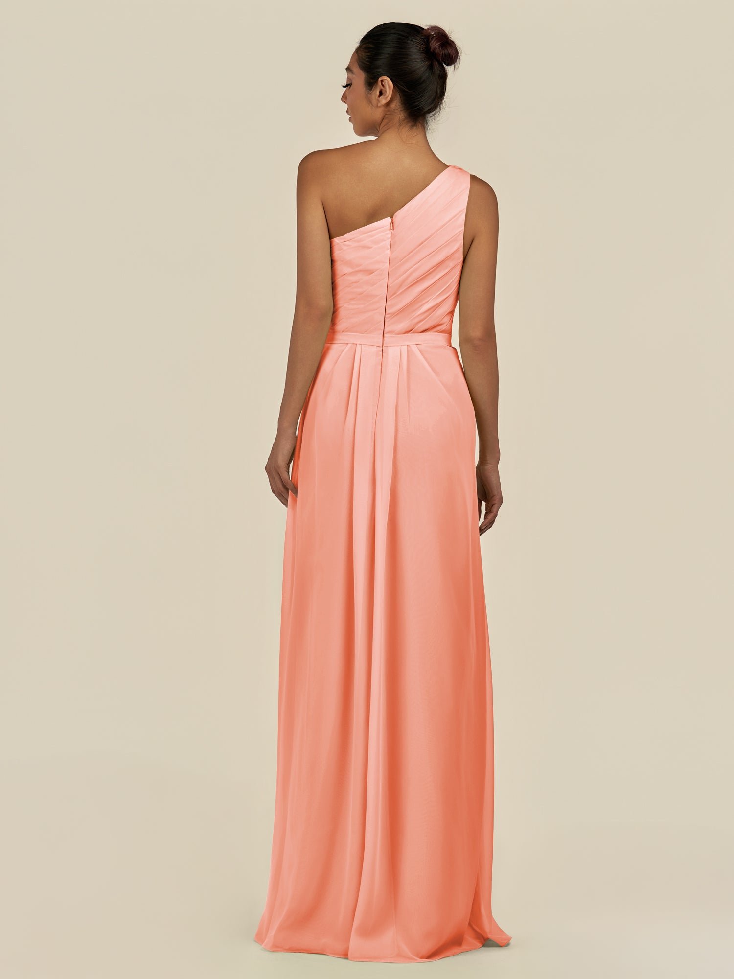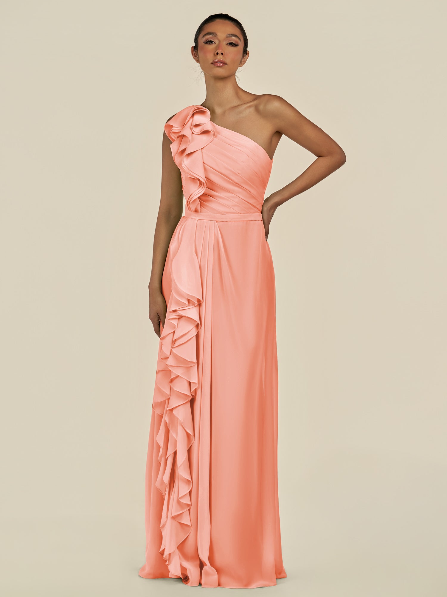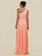 Assou is a graceful A-line chiffon bridesmaid dress. Her one-shoulder neckline and sleeveless design highlight elegance, while pleats and ruffles add texture and movement. The floor-length skirt features a slit for effortless walking, and a zipper back ensures a flawless fit—perfect for your wedding party.