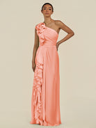 Assou | Rosette - A Line One Shoulder Chiffon Pleated Ruffles Long Bridesmaid Dress with Slit