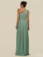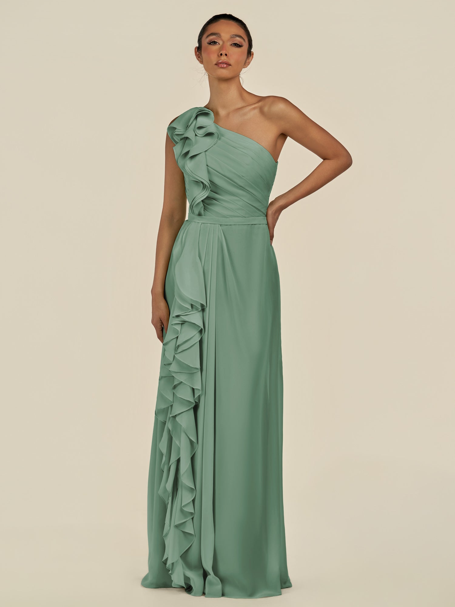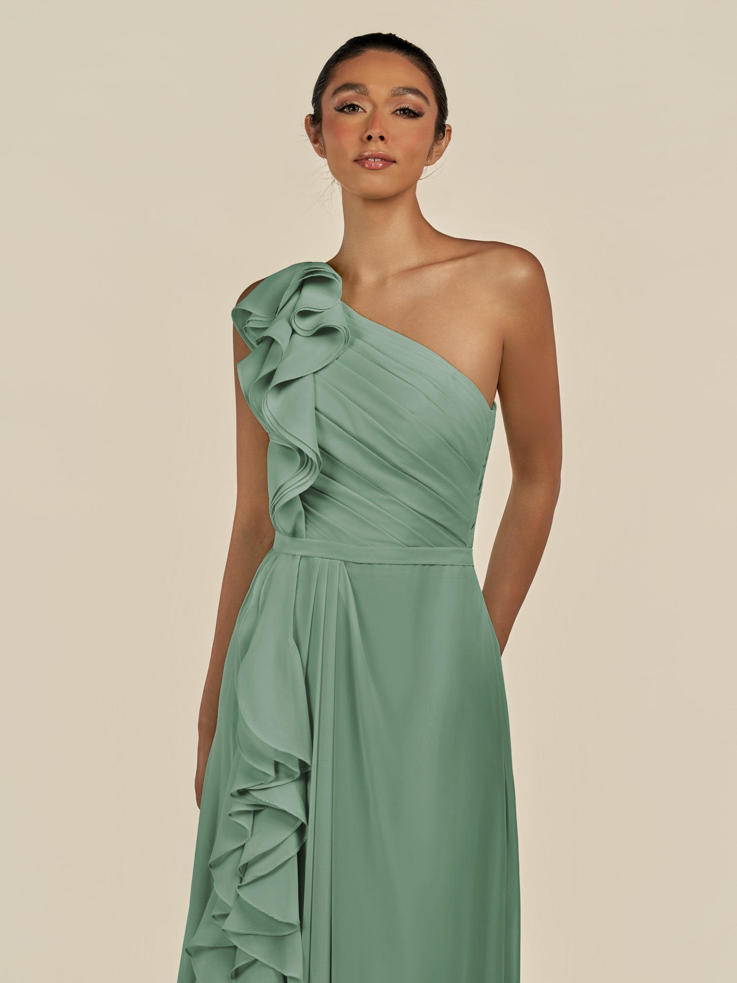 Assou | Sea Glass - A Line One Shoulder Chiffon Pleated Ruffles Long Bridesmaid Dress with Slit