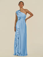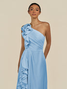 Assou | Steel Blue - A Line One Shoulder Chiffon Pleated Ruffles Long Bridesmaid Dress with Slit