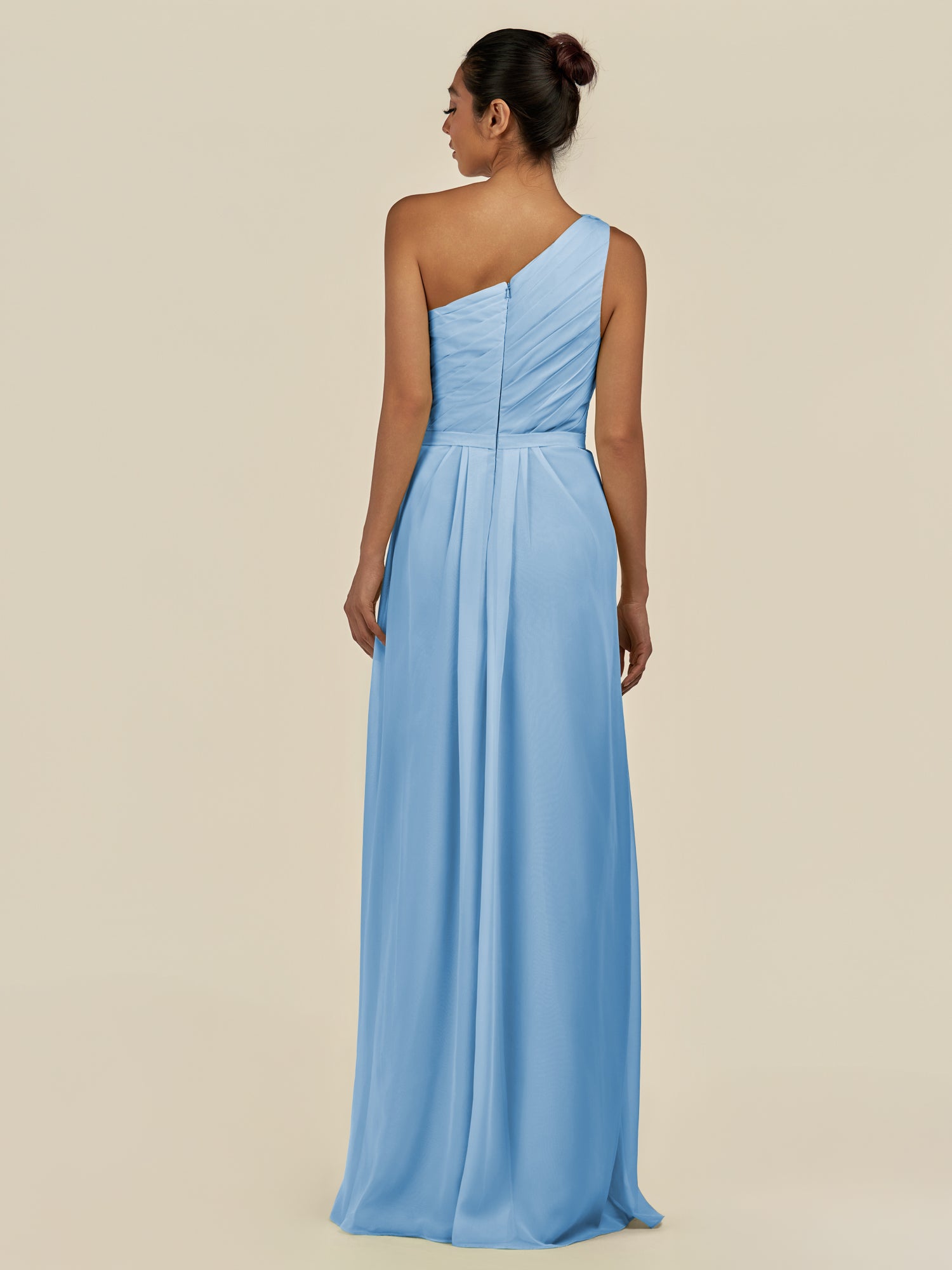 Assou is a graceful A-line chiffon bridesmaid dress. Her one-shoulder neckline and sleeveless design highlight elegance, while pleats and ruffles add texture and movement. The floor-length skirt features a slit for effortless walking, and a zipper back ensures a flawless fit—perfect for your wedding party.