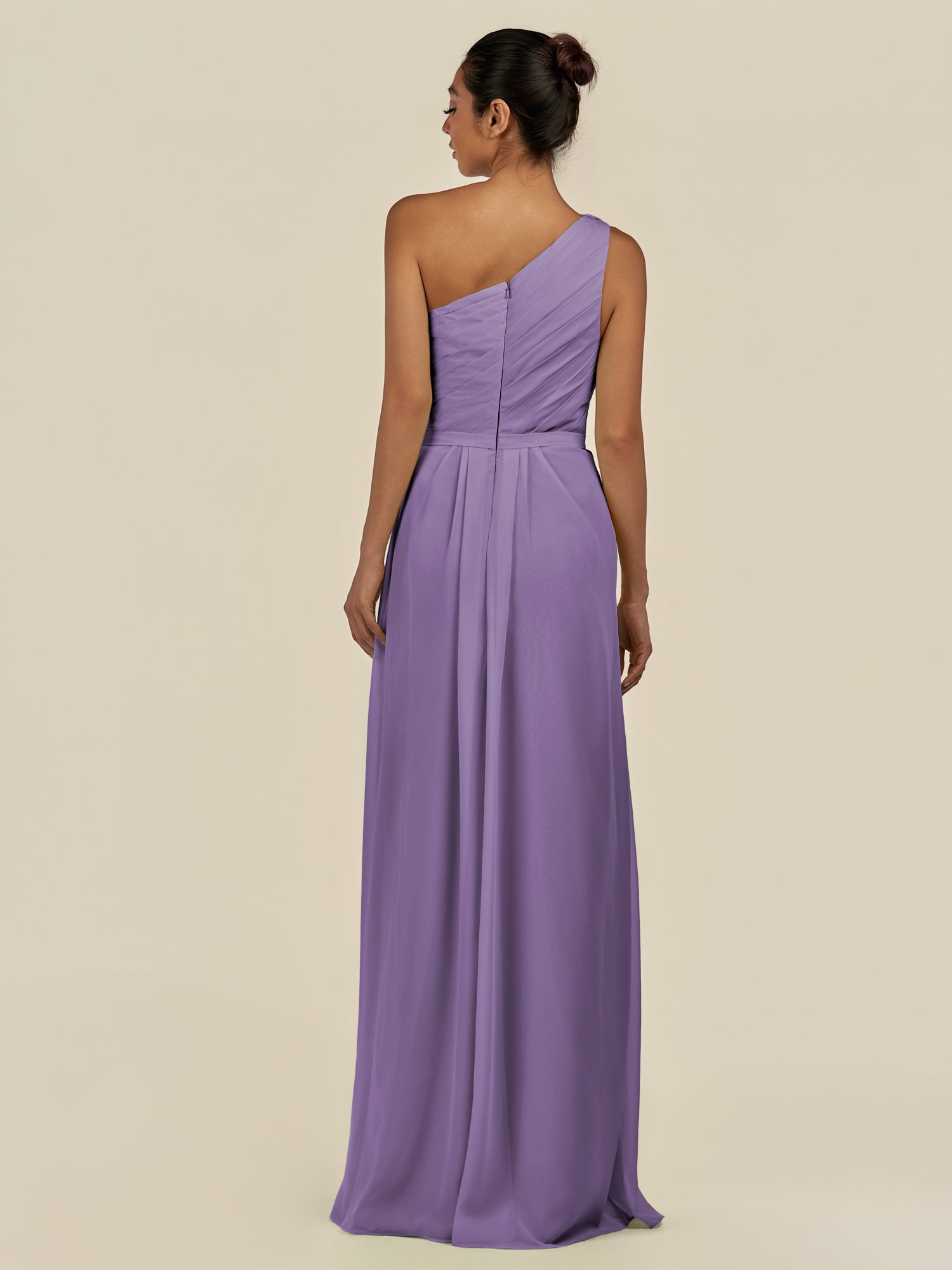 Assou is a graceful A-line chiffon bridesmaid dress. Her one-shoulder neckline and sleeveless design highlight elegance, while pleats and ruffles add texture and movement. The floor-length skirt features a slit for effortless walking, and a zipper back ensures a flawless fit—perfect for your wedding party.
