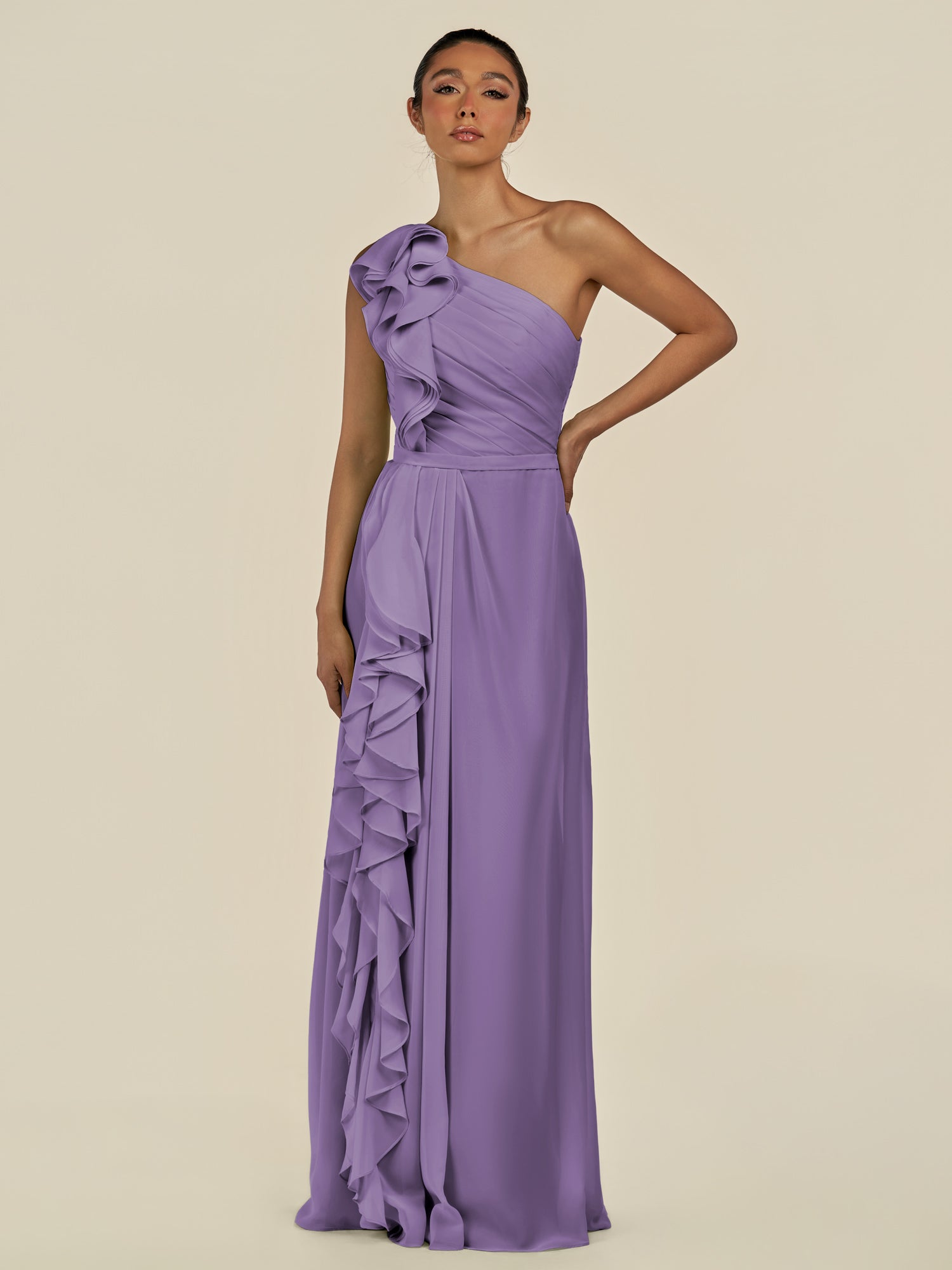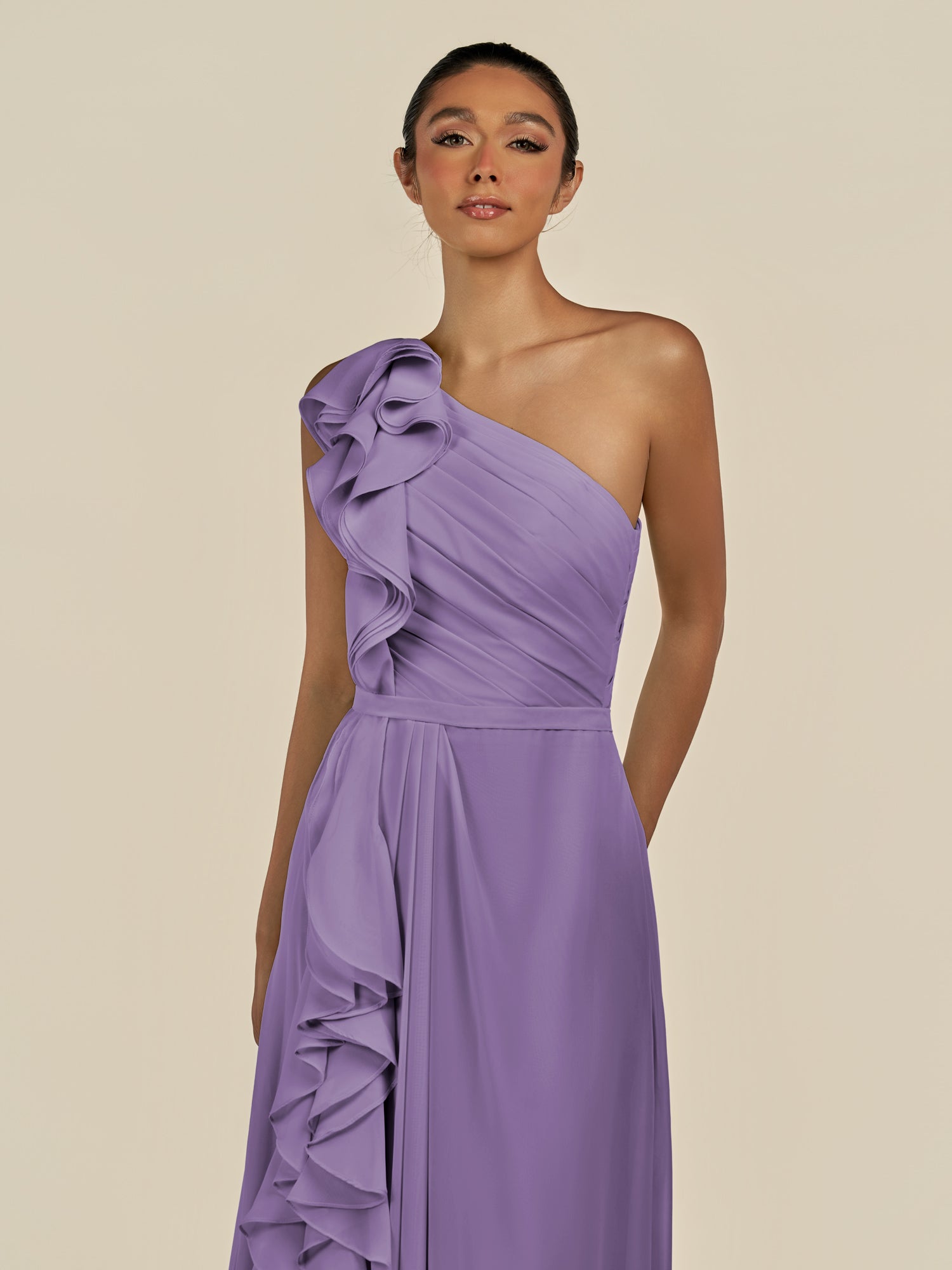 Assou | Tahiti - A Line One Shoulder Chiffon Pleated Ruffles Long Bridesmaid Dress with Slit