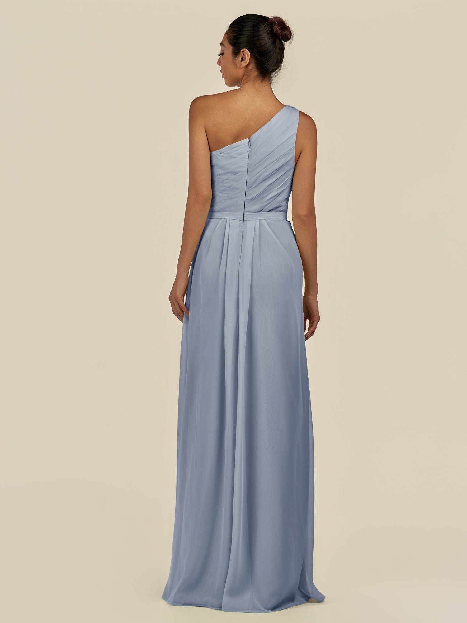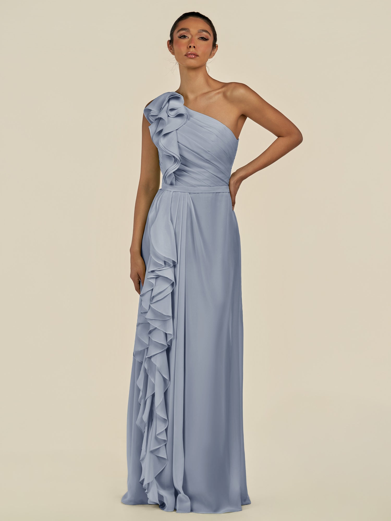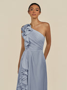 Assou is a graceful A-line chiffon bridesmaid dress. Her one-shoulder neckline and sleeveless design highlight elegance, while pleats and ruffles add texture and movement. The floor-length skirt features a slit for effortless walking, and a zipper back ensures a flawless fit—perfect for your wedding party.