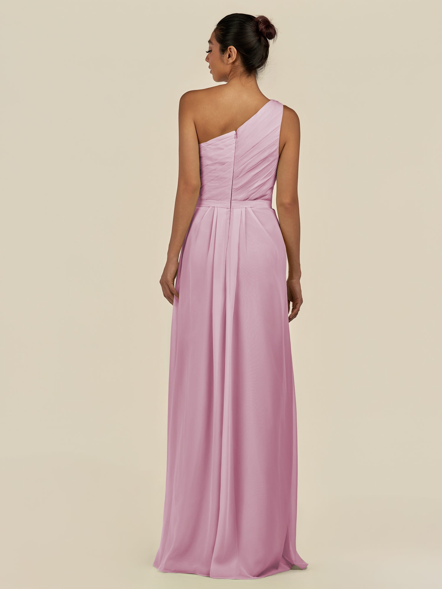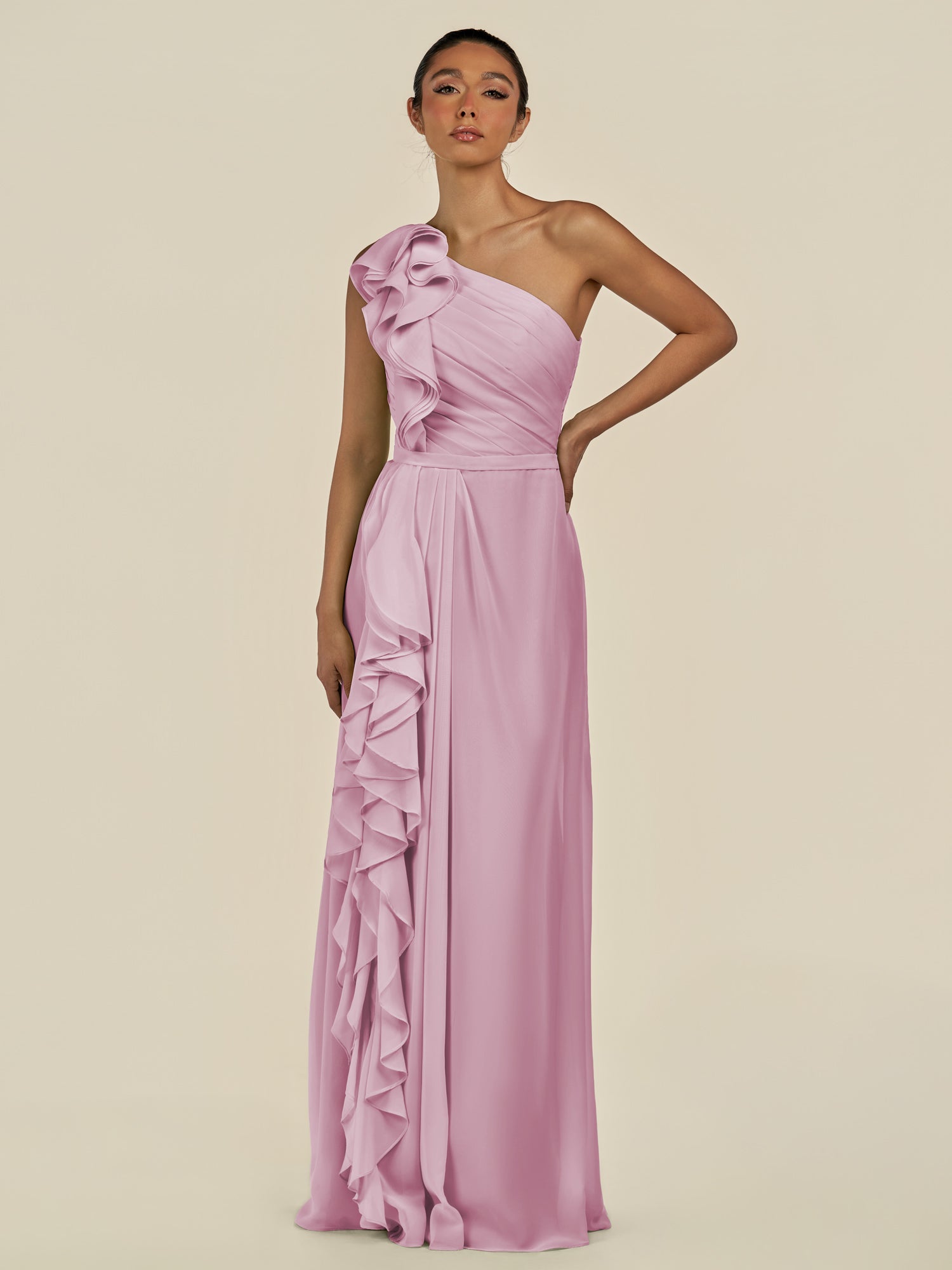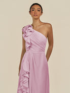 Assou is a graceful A-line chiffon bridesmaid dress. Her one-shoulder neckline and sleeveless design highlight elegance, while pleats and ruffles add texture and movement. The floor-length skirt features a slit for effortless walking, and a zipper back ensures a flawless fit—perfect for your wedding party.