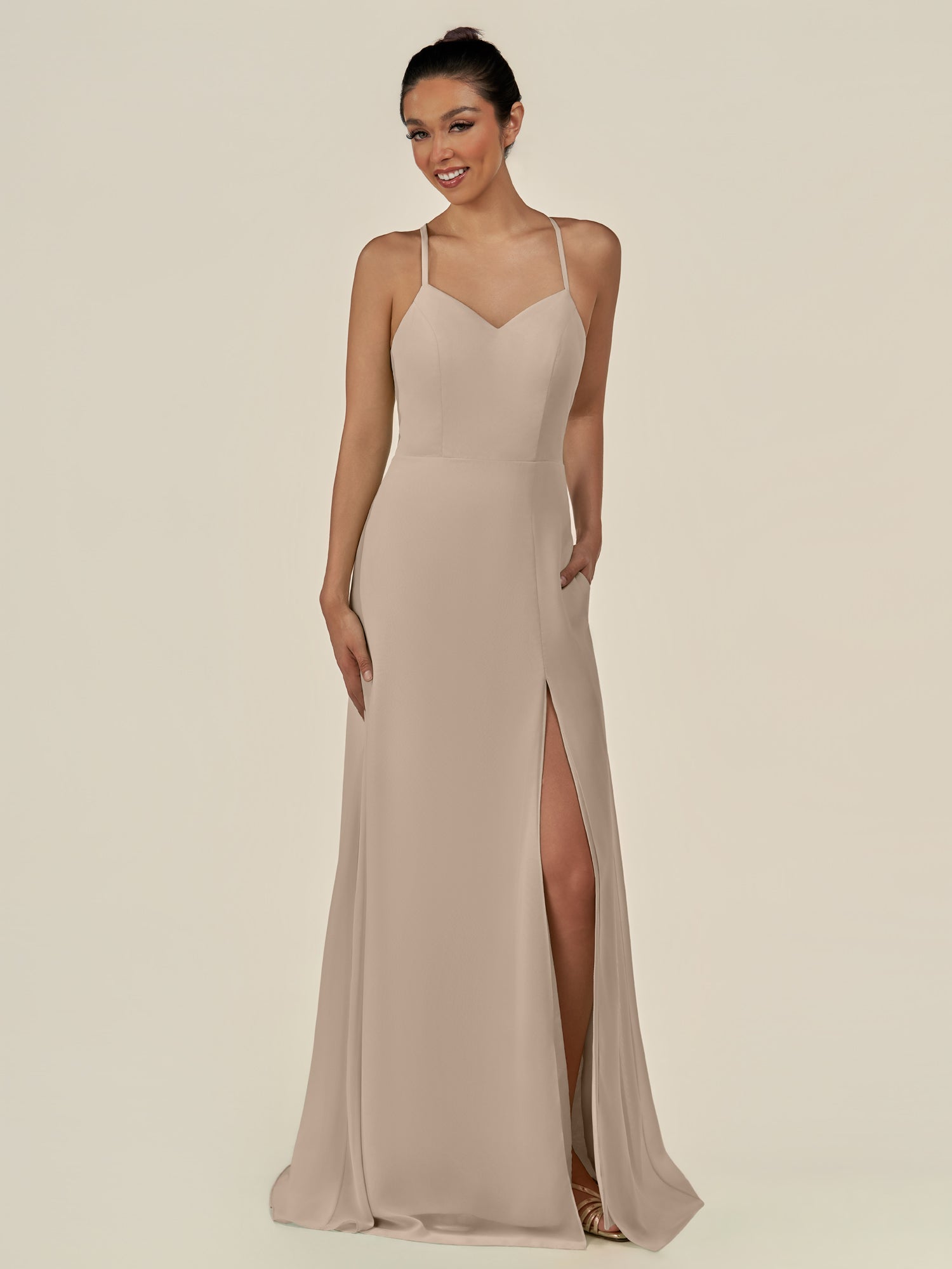 Cerin is a sleek and sophisticated choice for your bridal party. Crafted from soft chiffon, she features a flattering v neckline and a sleeveless bodice that creates a refined silhouette. Her floor-length sheath skirt flows elegantly, accented by a subtle side slit for graceful movement. Finished with a smooth zipper back, Irys combines timeless style with contemporary elegance—perfect for weddings and special occasions.