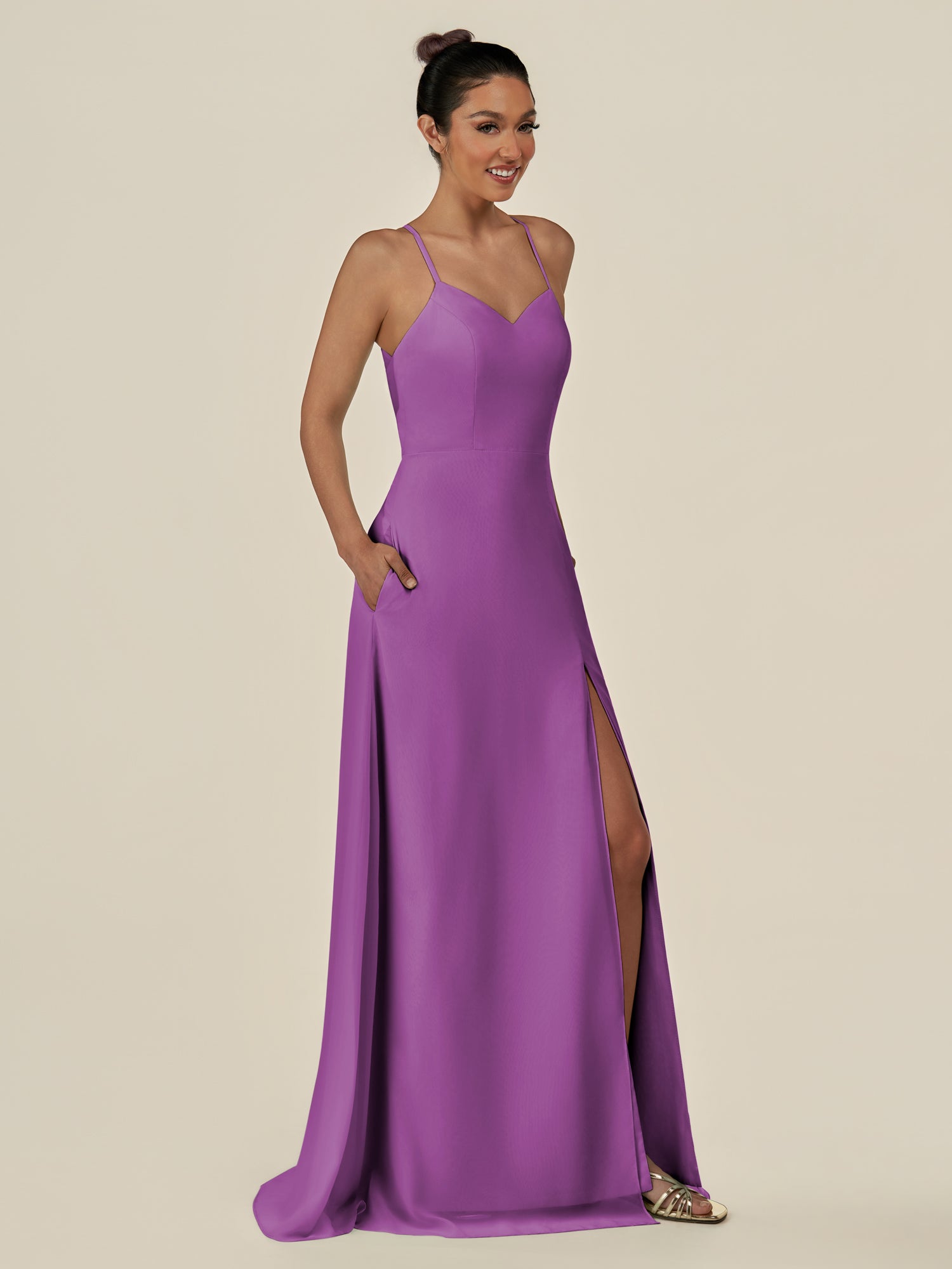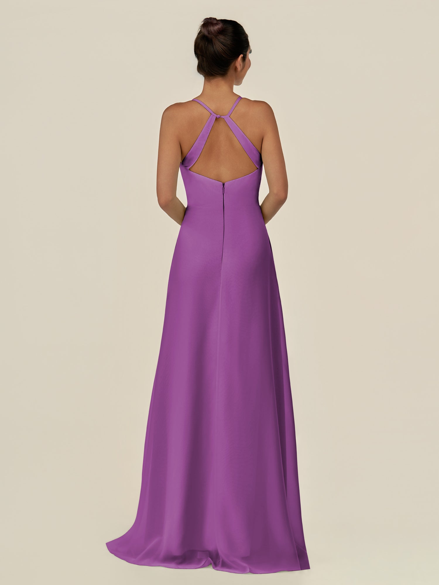 Cerin is a sleek and sophisticated choice for your bridal party. Crafted from soft chiffon, she features a flattering v neckline and a sleeveless bodice that creates a refined silhouette. Her floor-length sheath skirt flows elegantly, accented by a subtle side slit for graceful movement. Finished with a smooth zipper back, Irys combines timeless style with contemporary elegance—perfect for weddings and special occasions.