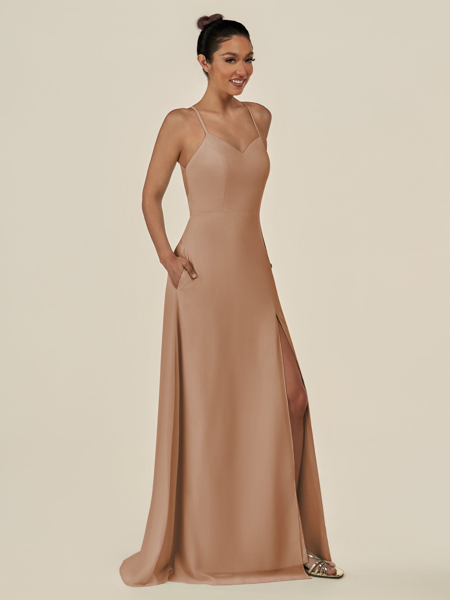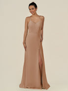 Cerin is a sleek and sophisticated choice for your bridal party. Crafted from soft chiffon, she features a flattering v neckline and a sleeveless bodice that creates a refined silhouette. Her floor-length sheath skirt flows elegantly, accented by a subtle side slit for graceful movement. Finished with a smooth zipper back, Irys combines timeless style with contemporary elegance—perfect for weddings and special occasions.