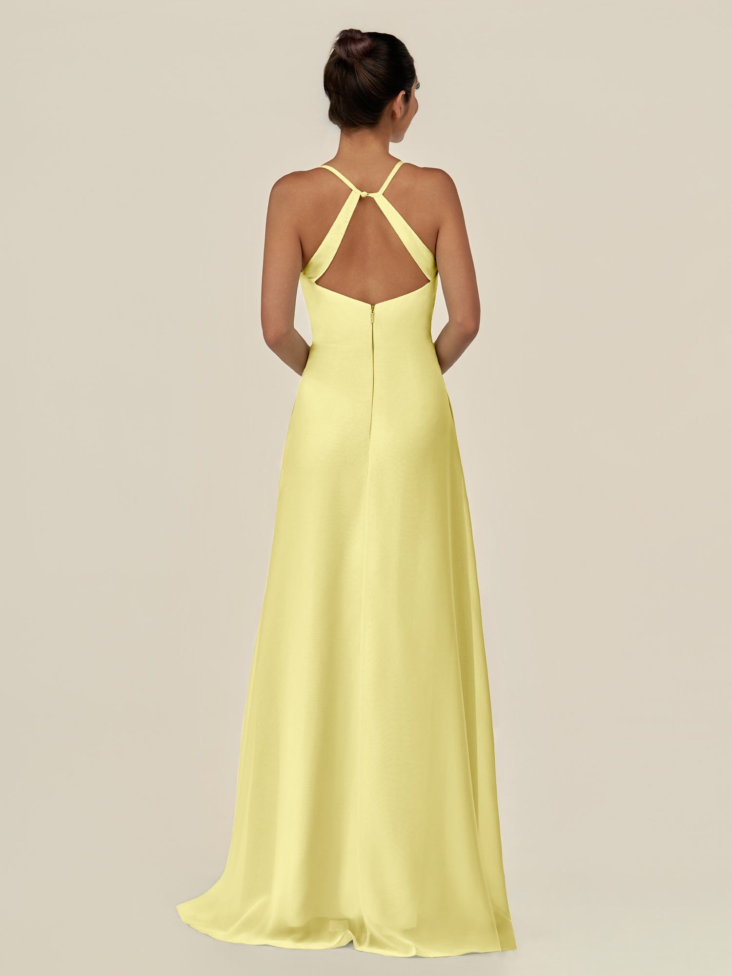 Cerin is a sleek and sophisticated choice for your bridal party. Crafted from soft chiffon, she features a flattering v neckline and a sleeveless bodice that creates a refined silhouette. Her floor-length sheath skirt flows elegantly, accented by a subtle side slit for graceful movement. Finished with a smooth zipper back, Irys combines timeless style with contemporary elegance—perfect for weddings and special occasions.