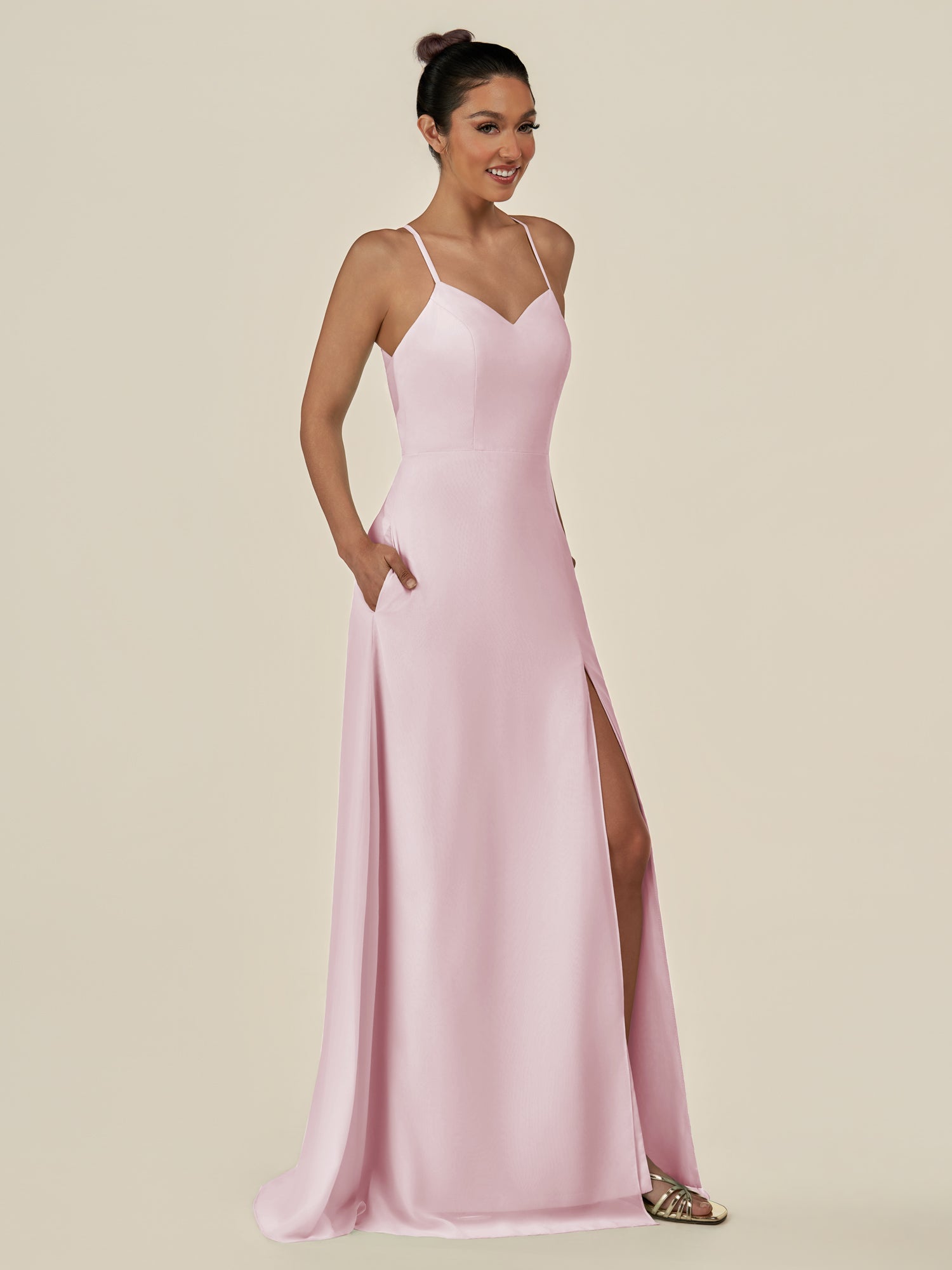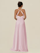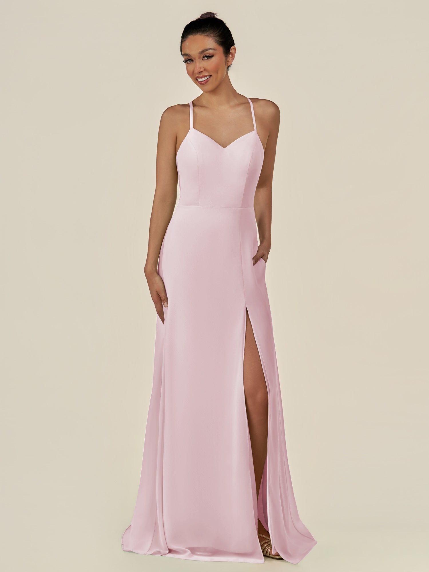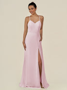 Cerin is a sleek and sophisticated choice for your bridal party. Crafted from soft chiffon, she features a flattering v neckline and a sleeveless bodice that creates a refined silhouette. Her floor-length sheath skirt flows elegantly, accented by a subtle side slit for graceful movement. Finished with a smooth zipper back, Irys combines timeless style with contemporary elegance—perfect for weddings and special occasions.