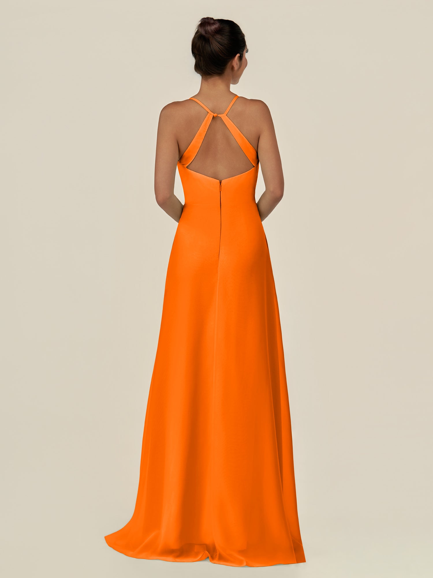 Cerin is a sleek and sophisticated choice for your bridal party. Crafted from soft chiffon, she features a flattering v neckline and a sleeveless bodice that creates a refined silhouette. Her floor-length sheath skirt flows elegantly, accented by a subtle side slit for graceful movement. Finished with a smooth zipper back, Irys combines timeless style with contemporary elegance—perfect for weddings and special occasions.