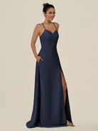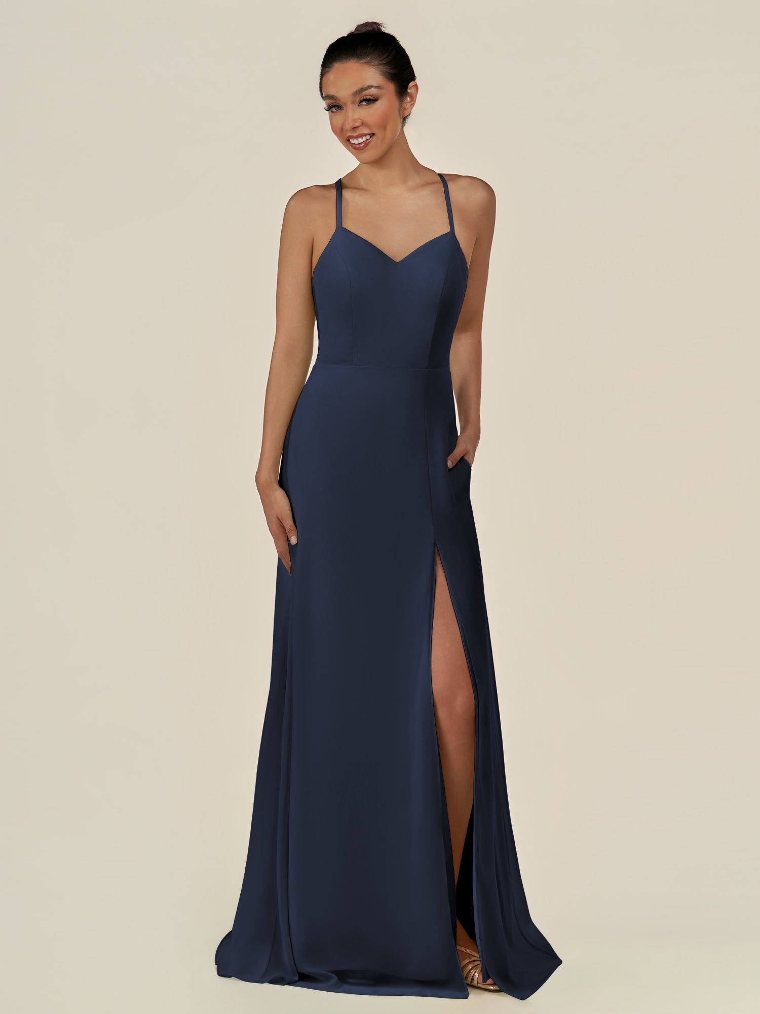 Cerin | Dark Navy - Sheath V Neck Chiffon Long Bridesmaid Dress with Slit
