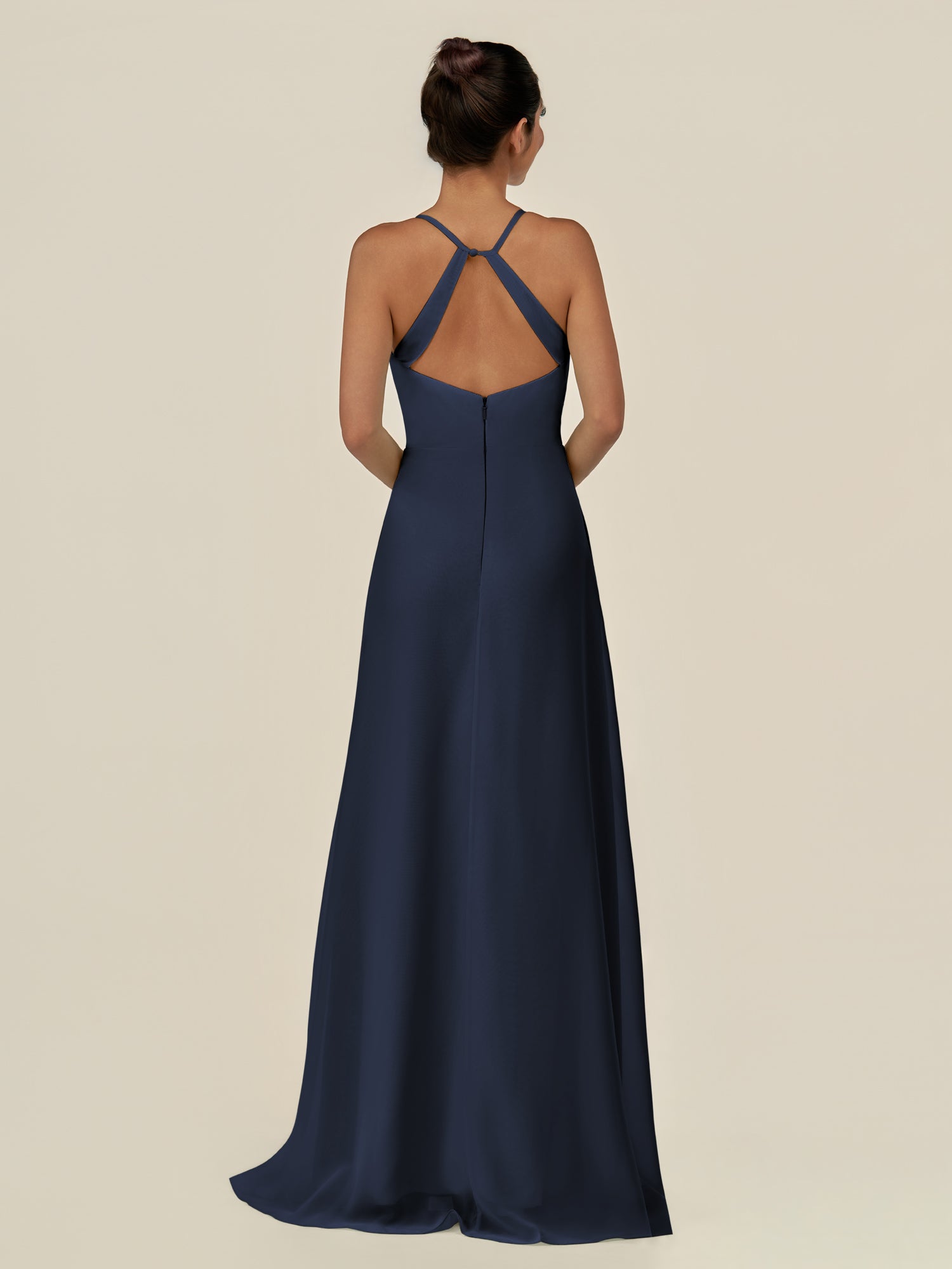 Cerin is a sleek and sophisticated choice for your bridal party. Crafted from soft chiffon, she features a flattering v neckline and a sleeveless bodice that creates a refined silhouette. Her floor-length sheath skirt flows elegantly, accented by a subtle side slit for graceful movement. Finished with a smooth zipper back, Irys combines timeless style with contemporary elegance—perfect for weddings and special occasions.