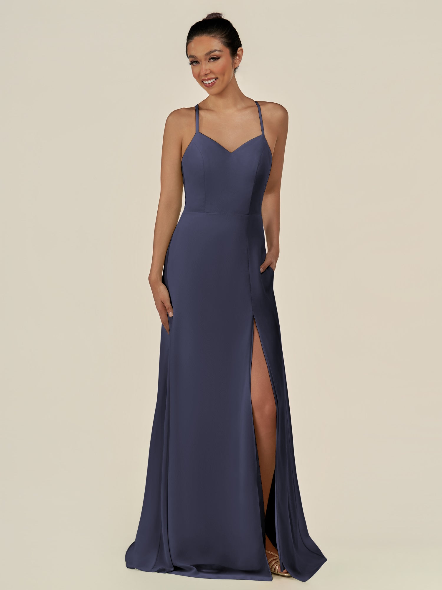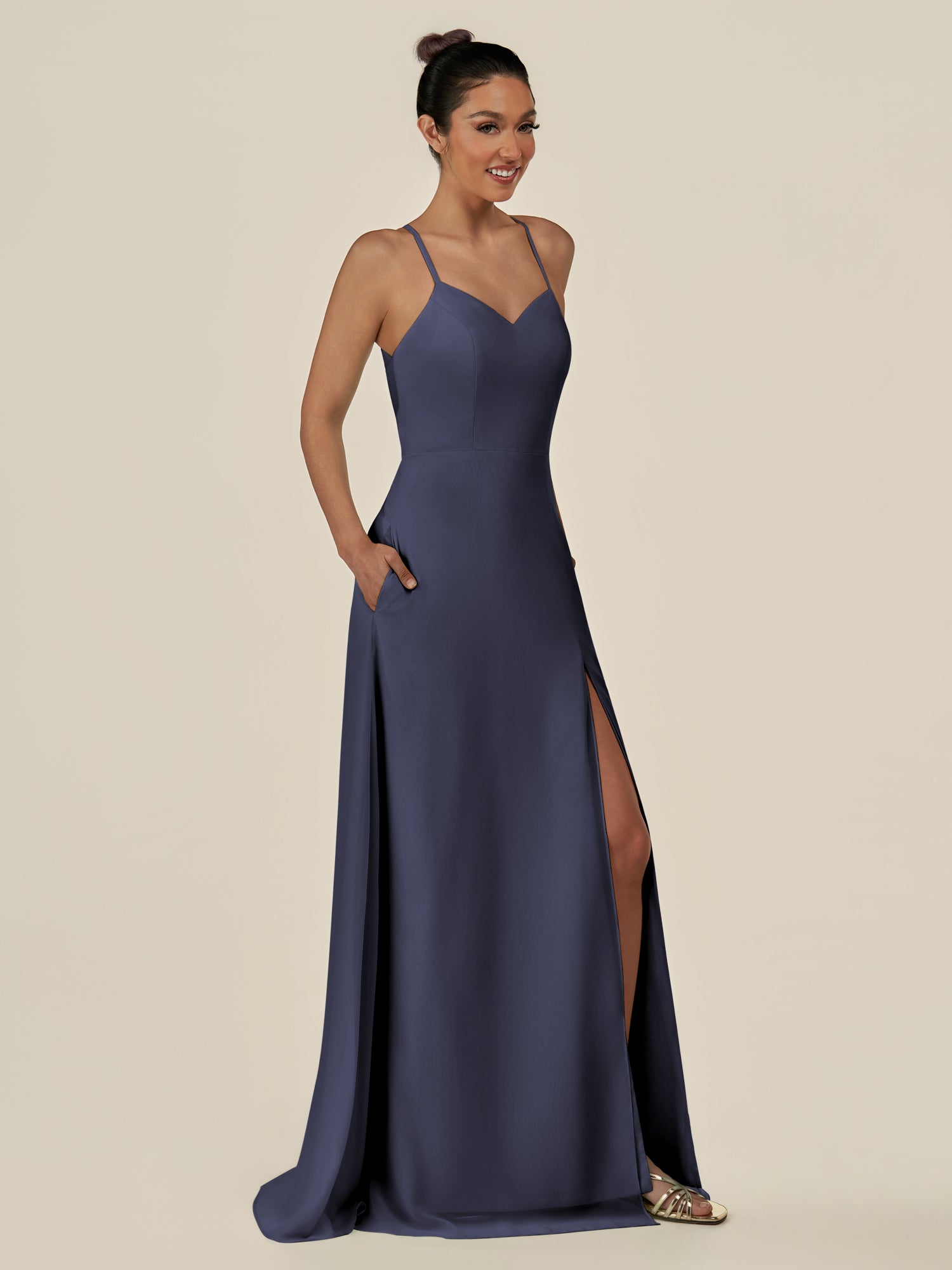 Cerin is a sleek and sophisticated choice for your bridal party. Crafted from soft chiffon, she features a flattering v neckline and a sleeveless bodice that creates a refined silhouette. Her floor-length sheath skirt flows elegantly, accented by a subtle side slit for graceful movement. Finished with a smooth zipper back, Irys combines timeless style with contemporary elegance—perfect for weddings and special occasions.