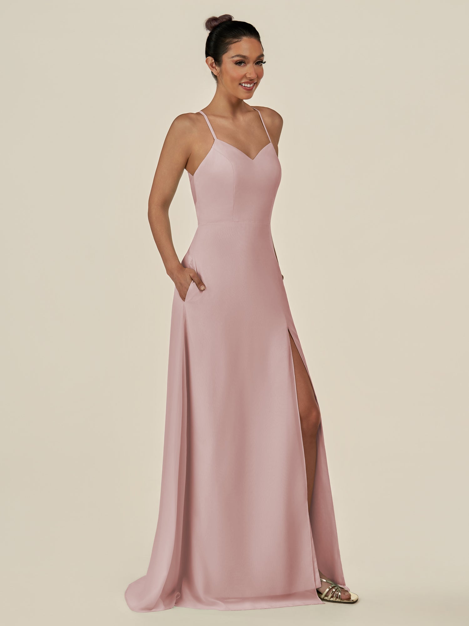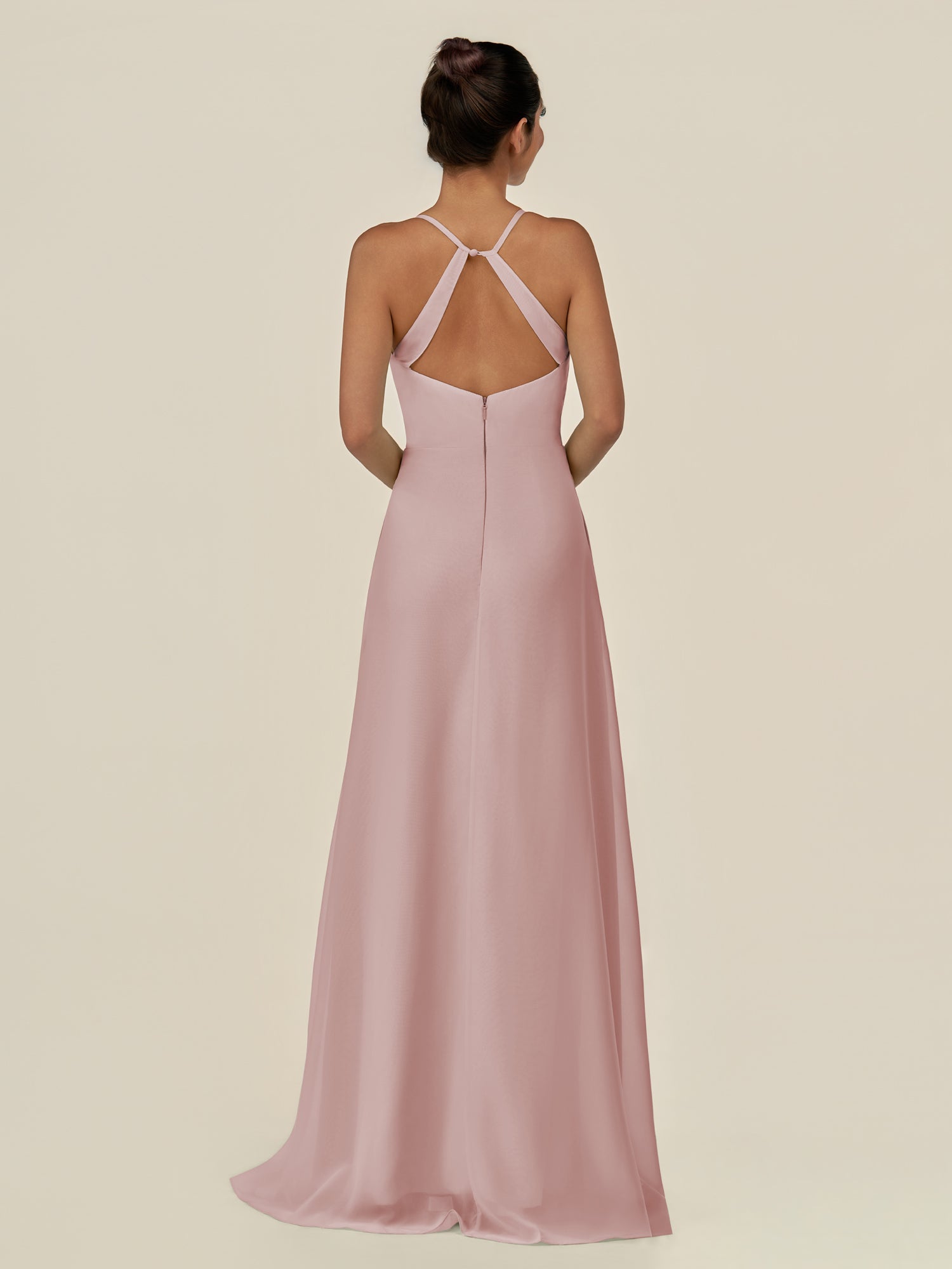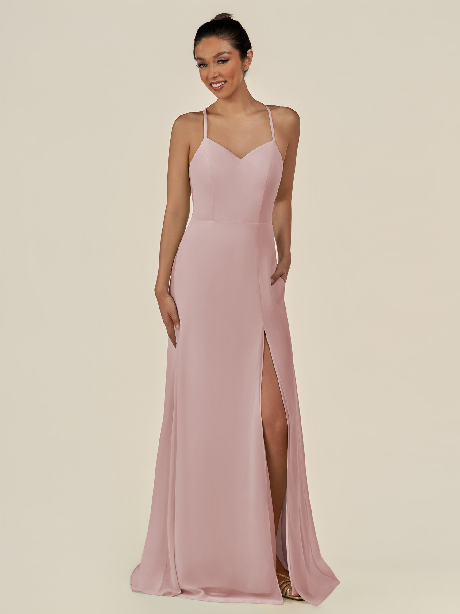 Cerin is a sleek and sophisticated choice for your bridal party. Crafted from soft chiffon, she features a flattering v neckline and a sleeveless bodice that creates a refined silhouette. Her floor-length sheath skirt flows elegantly, accented by a subtle side slit for graceful movement. Finished with a smooth zipper back, Irys combines timeless style with contemporary elegance—perfect for weddings and special occasions.