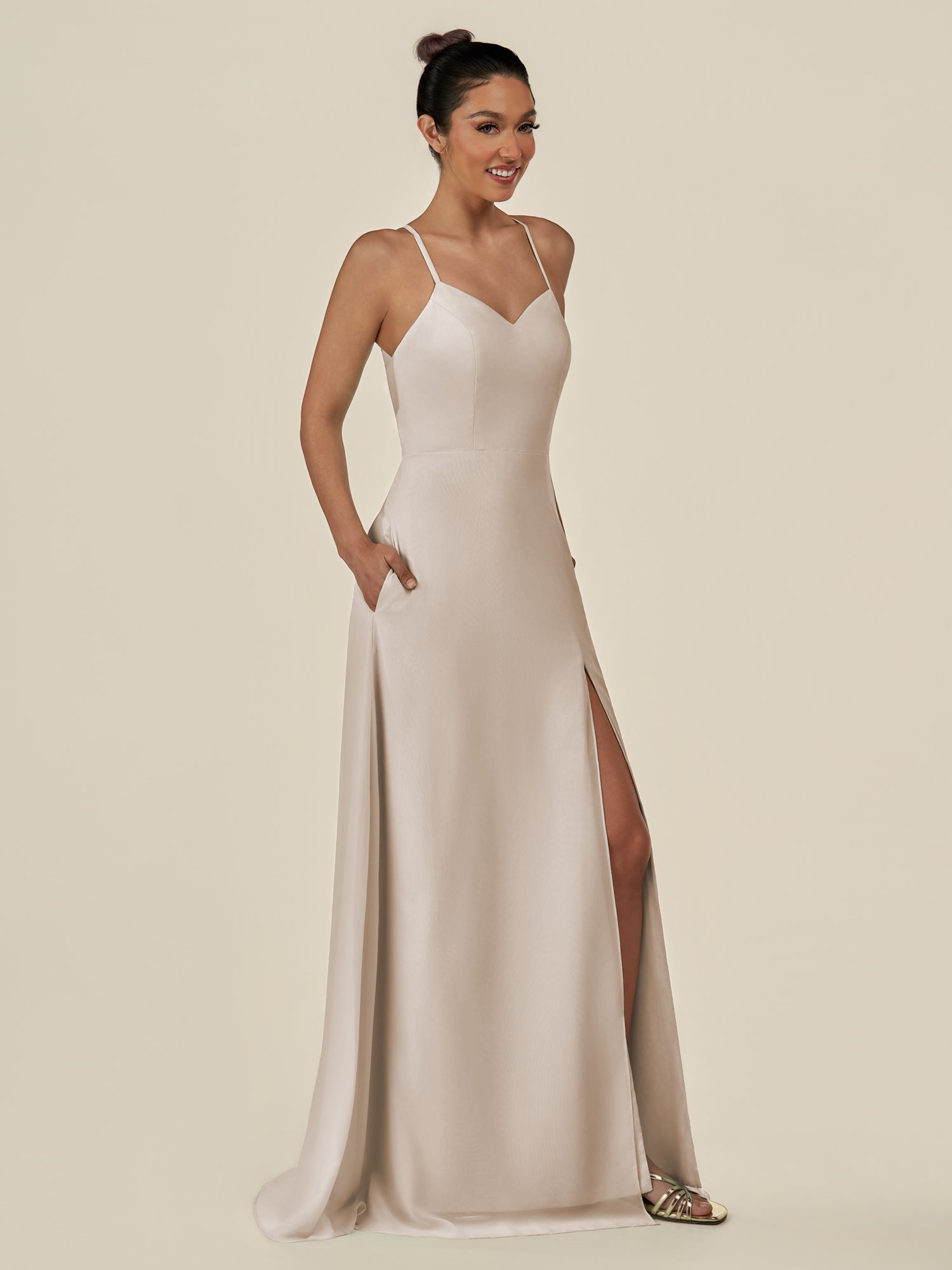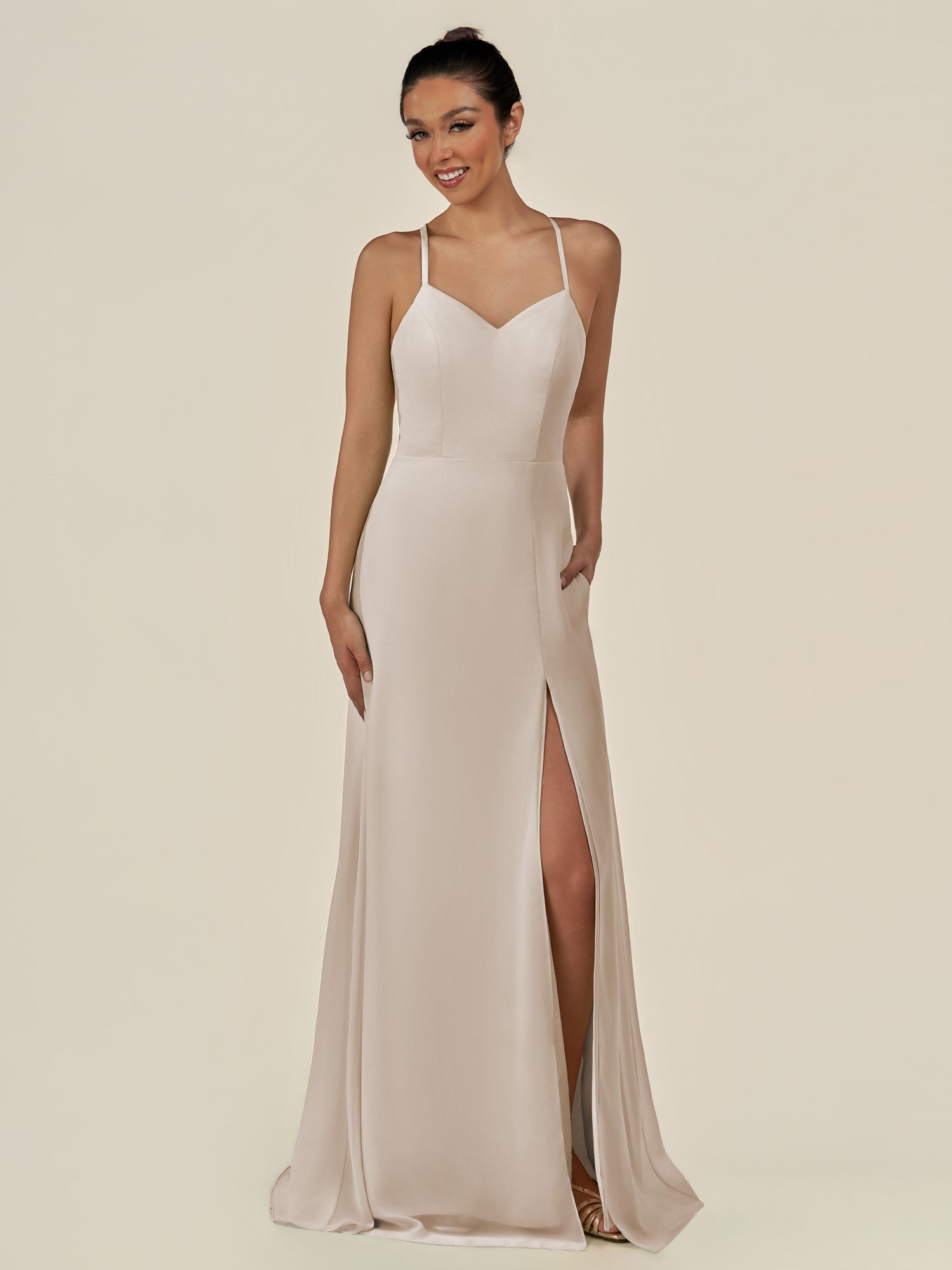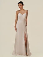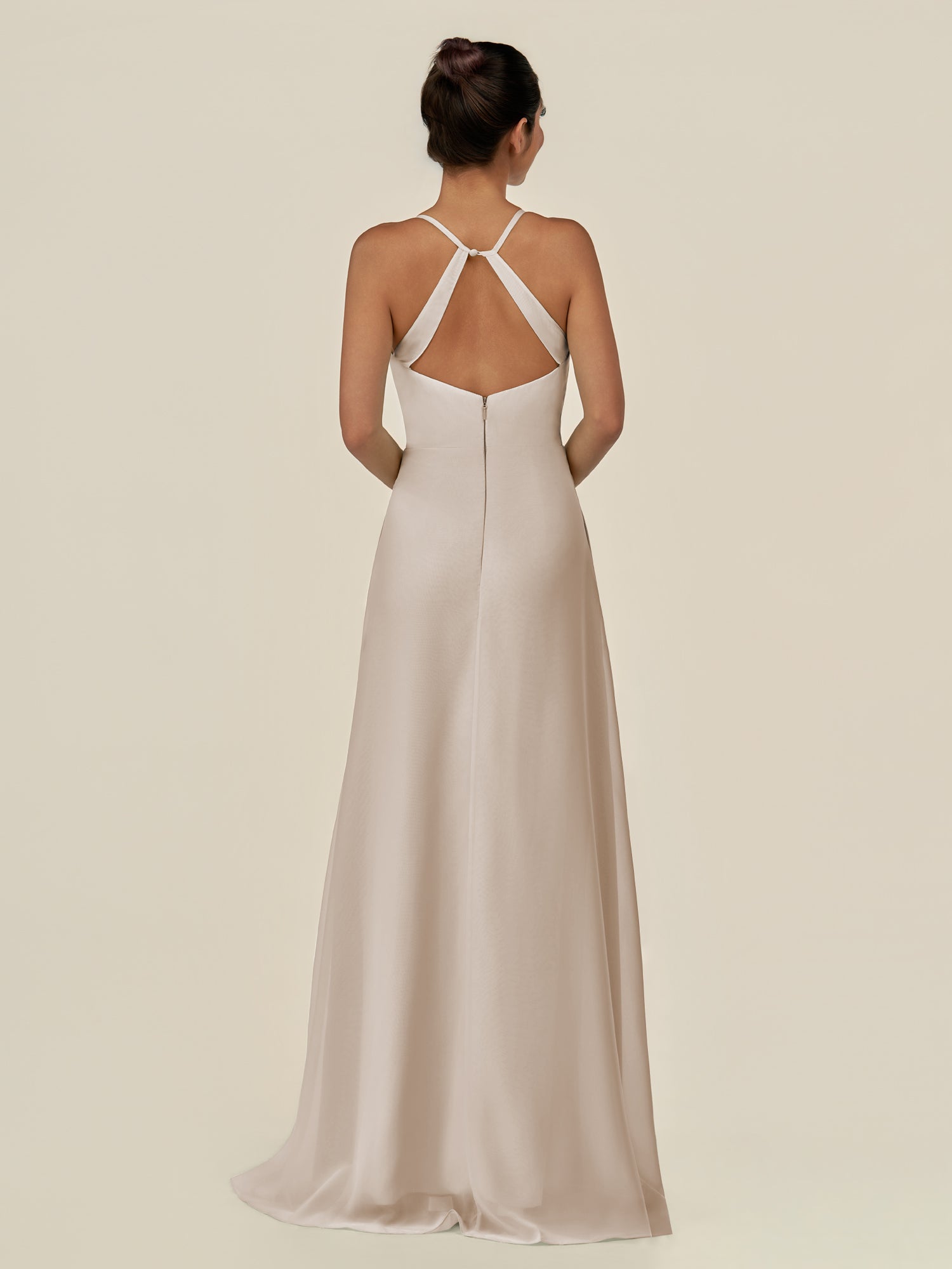 Cerin is a sleek and sophisticated choice for your bridal party. Crafted from soft chiffon, she features a flattering v neckline and a sleeveless bodice that creates a refined silhouette. Her floor-length sheath skirt flows elegantly, accented by a subtle side slit for graceful movement. Finished with a smooth zipper back, Irys combines timeless style with contemporary elegance—perfect for weddings and special occasions.